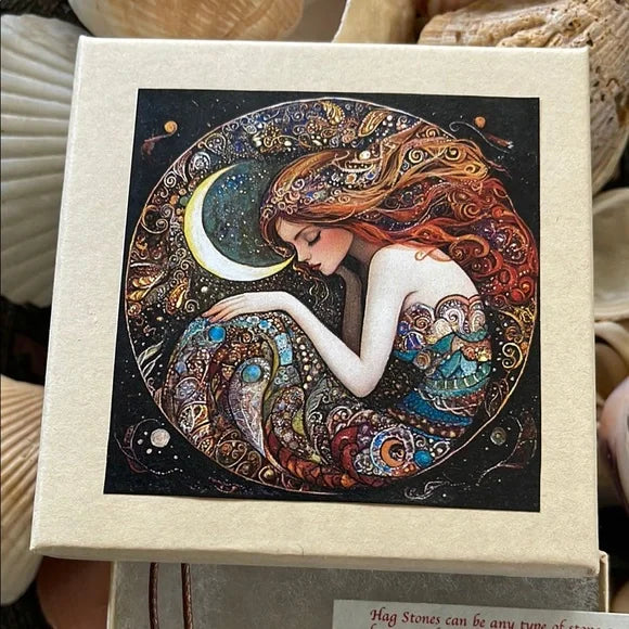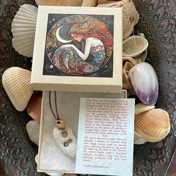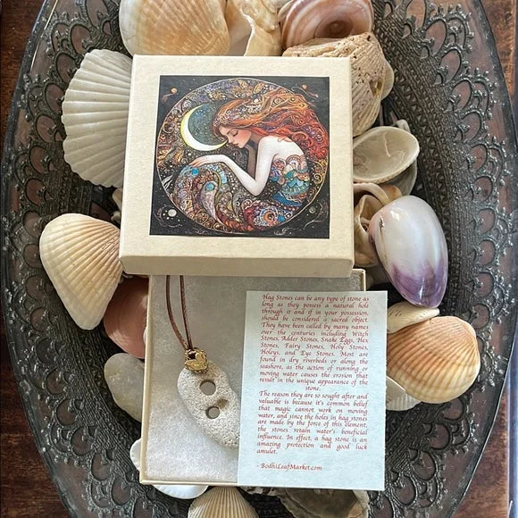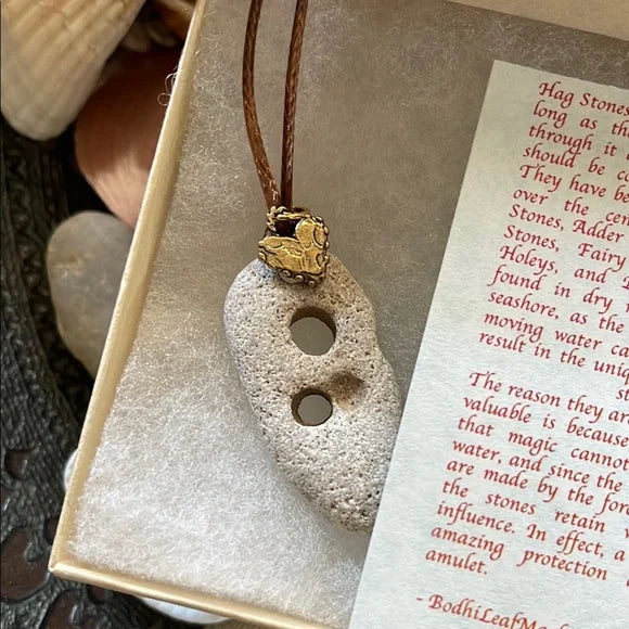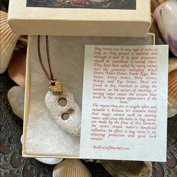 I find all of these hag stones locally off of Sanibel Island and each of these are hand chosen with pure water magic from our beautiful SW Florida Gulf. This stone measures approx 1/2" across and the necklace measures approx 16" with a 2 inch chain extender. You will receive the exact stone and charm in this picture. Comes gift boxed with a brief description of the magical properties of the hagstone. Hag Stones can be any type of stone as long as they possess a natural hole through it and if in your possession, should be considered a sacred object. They have been called by many names over the centuries including Witch Stones, Adder Stones, Snake Eggs, Hex Stones, Fairy Stones, Holy Stones, Holeys, and Eye Stones. Most are found in dry riverbeds or along the seashore, as the action of running or moving water causes the erosion that result in the unique appearance of the stone.