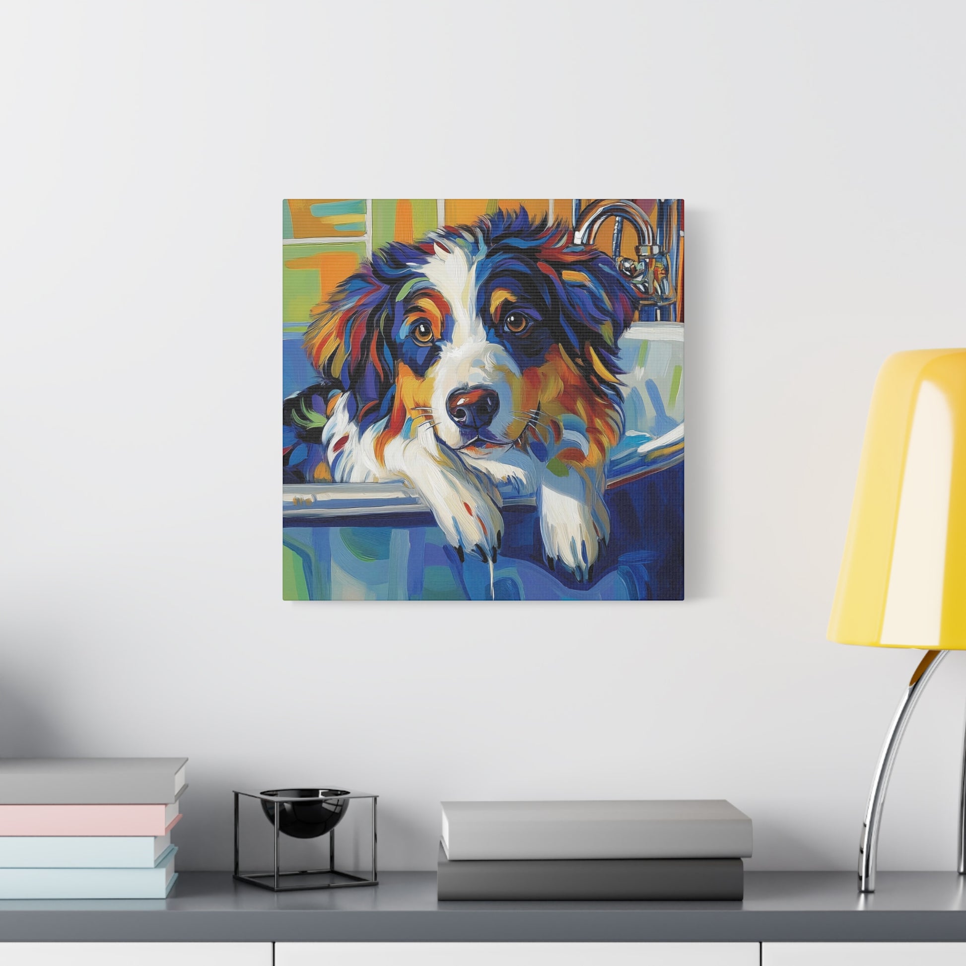 Aussie Bathtub Canvas, Australian Shepherd Art, Aussie Canvas, Tri Color Australian Shepherd Art, Dog Bathtub Prints