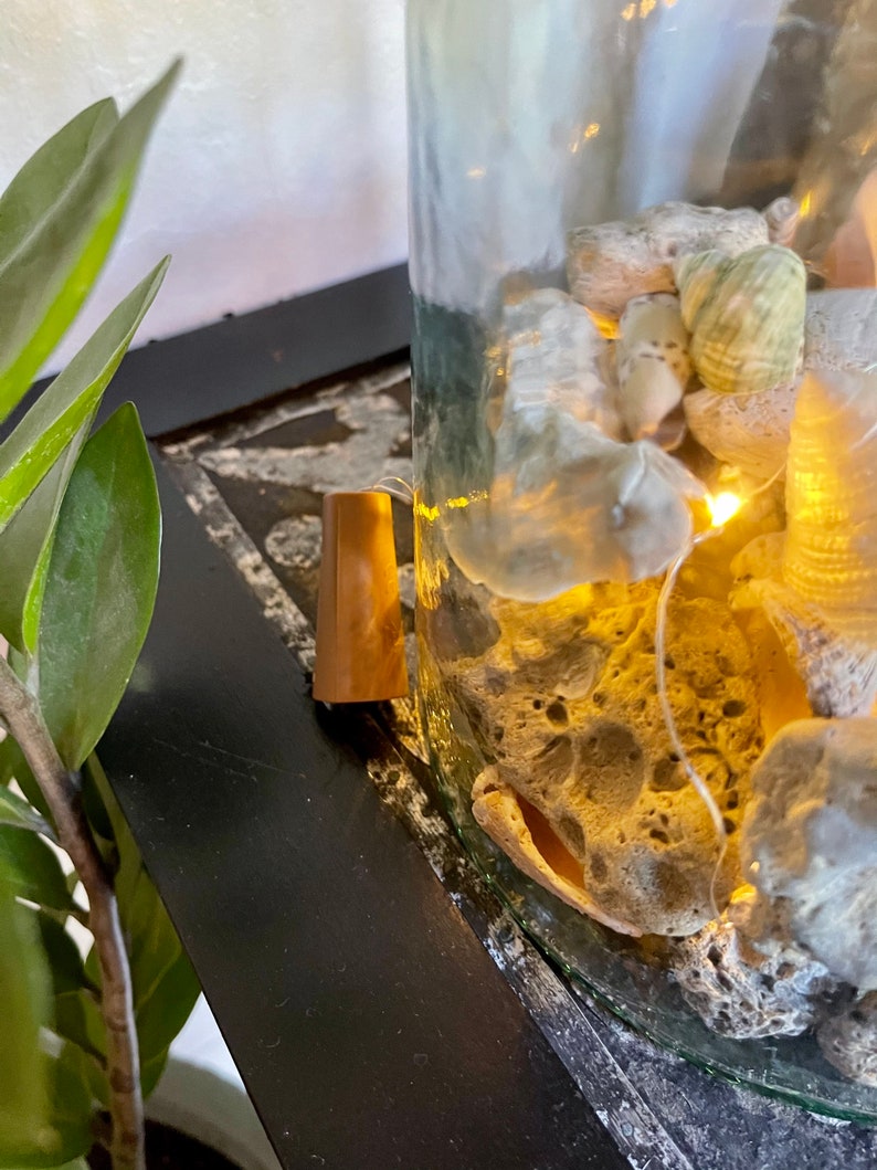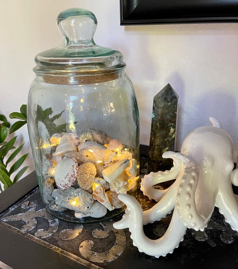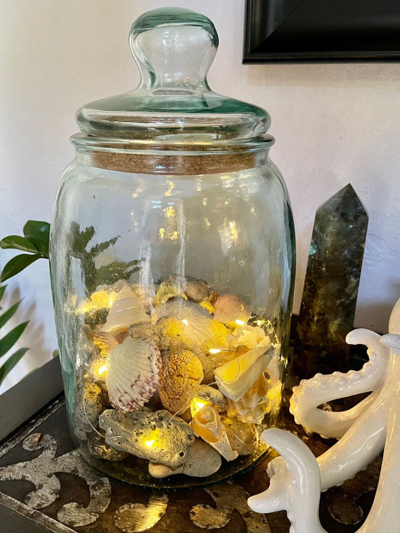 This jar is full of beautiful stone and shells picked up on our local beaches. The jar is large and heavy and comes with the battery operated lights. There is a small hole in the bottom side for ease of turning the lights on and off. Please see photo.