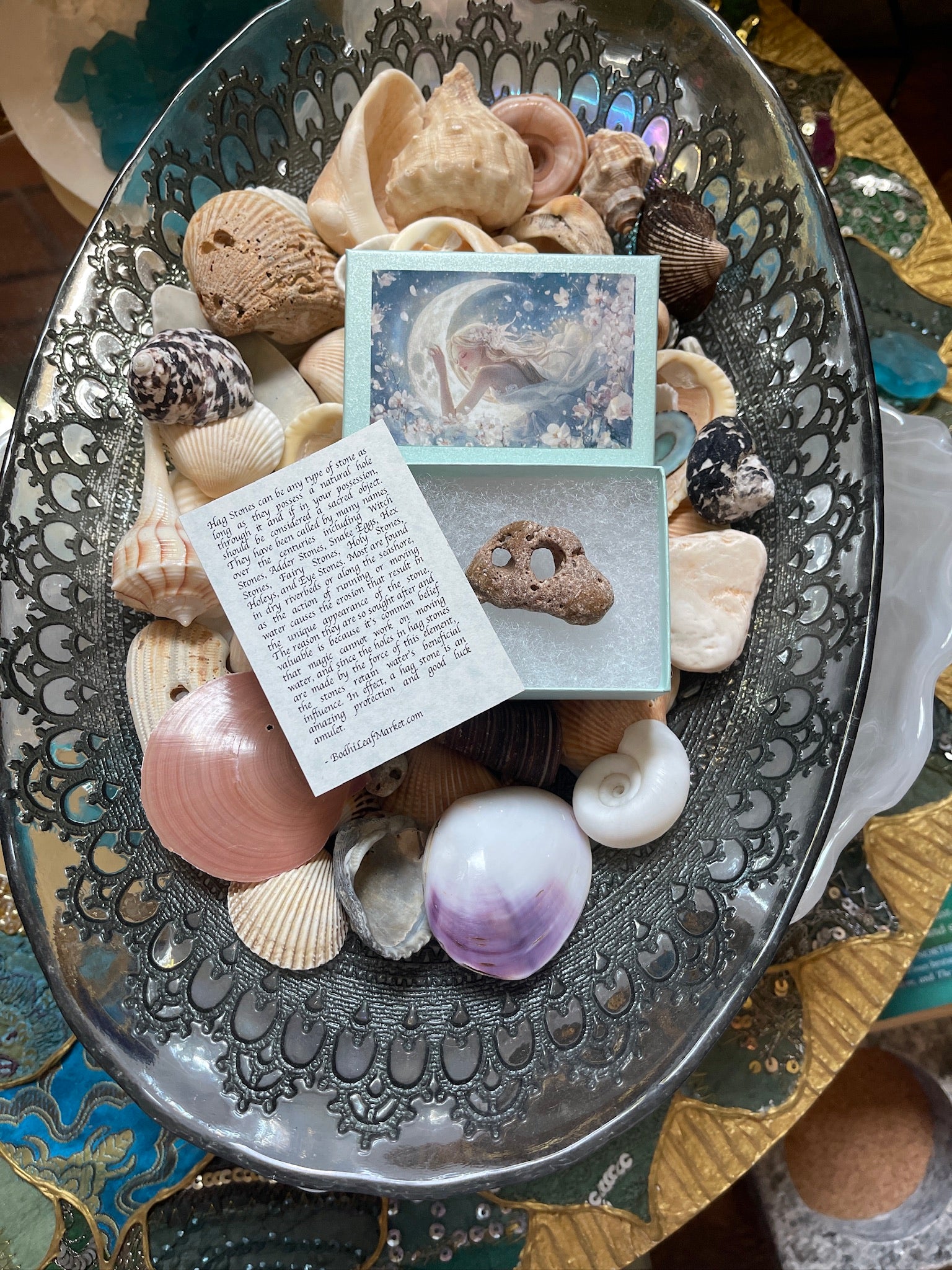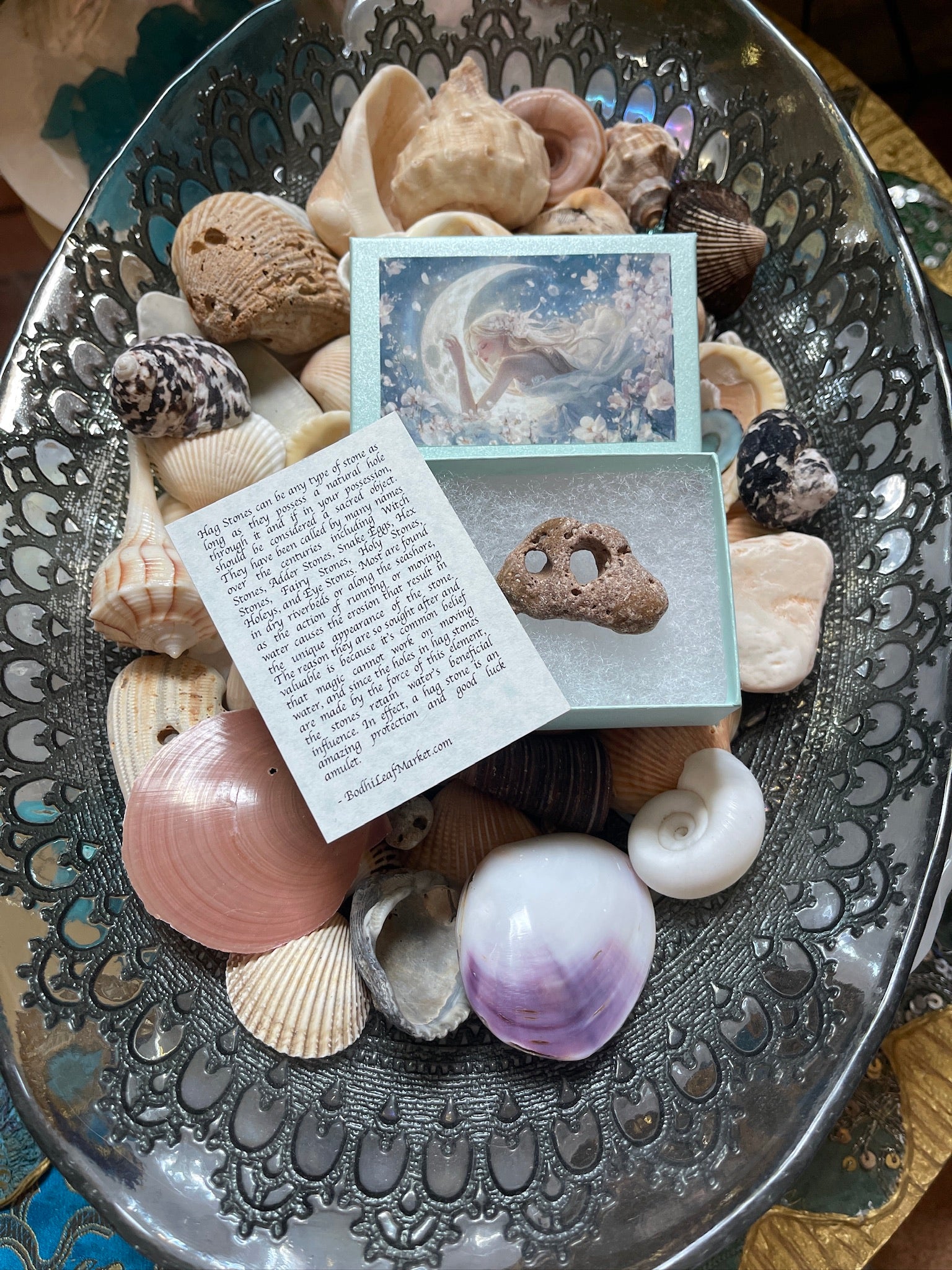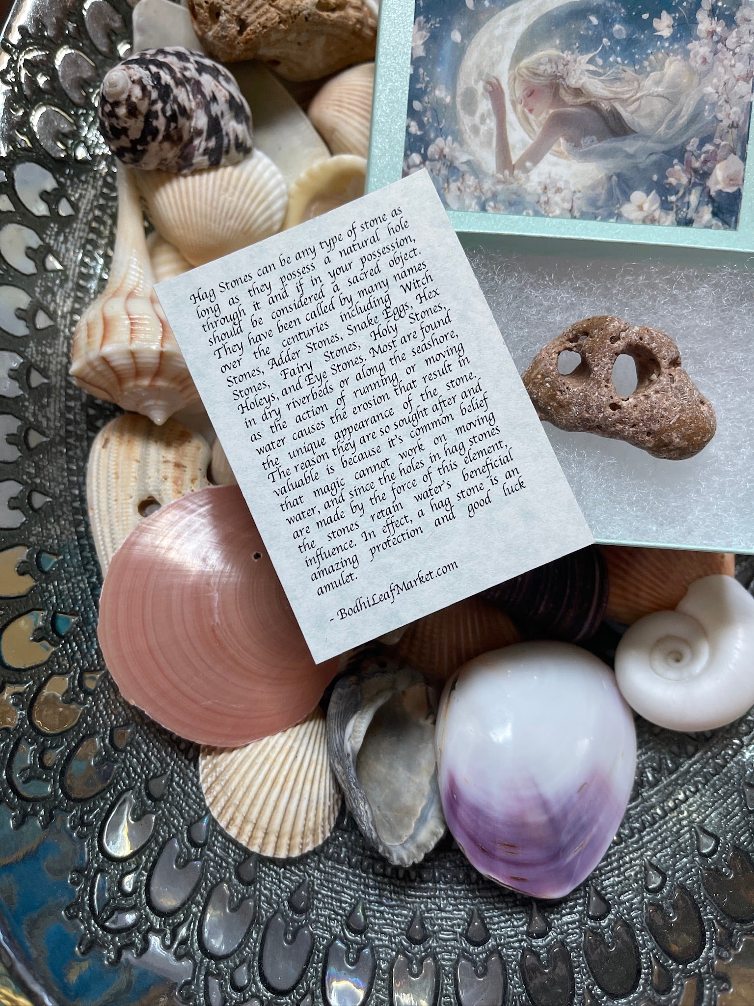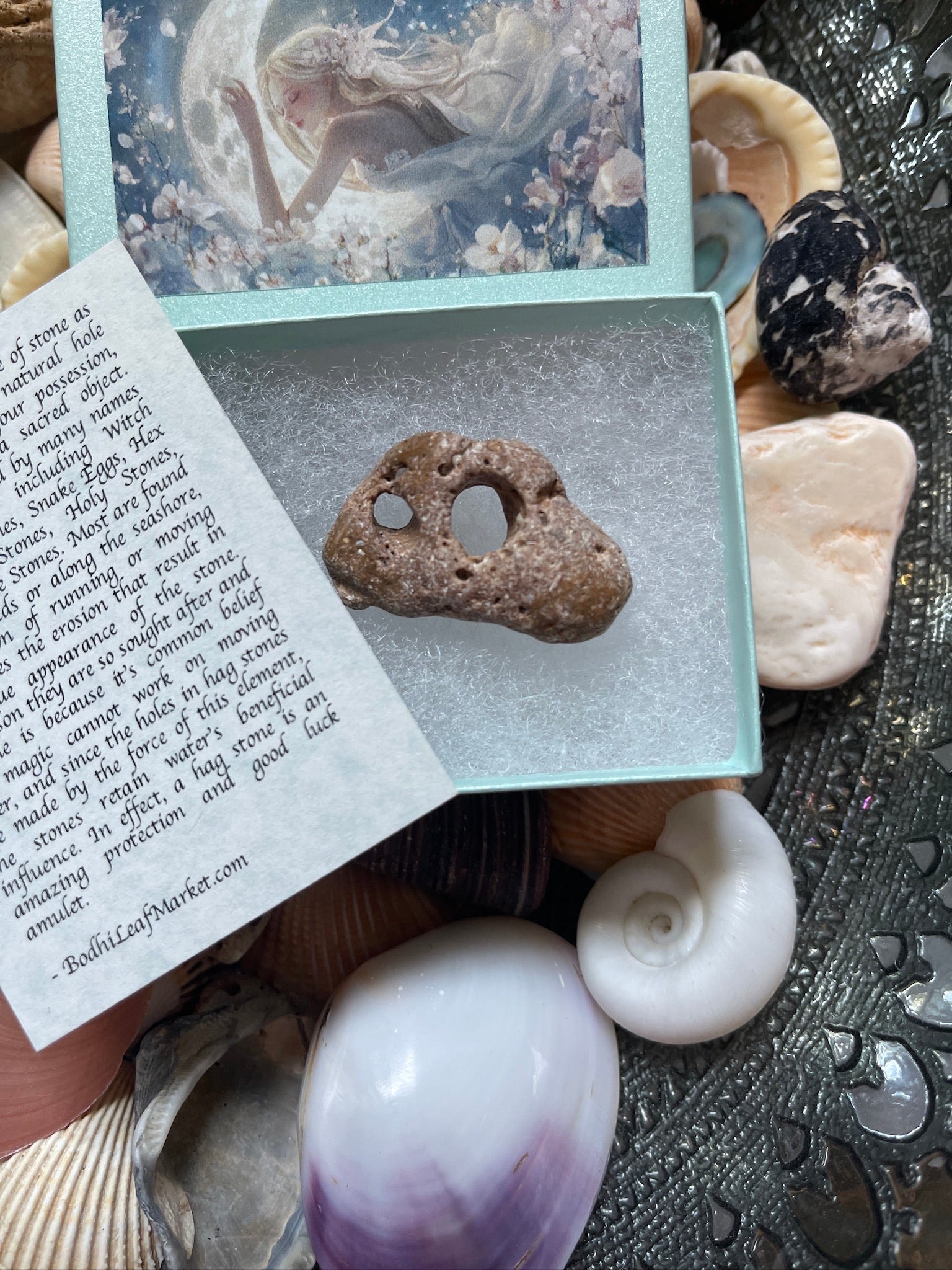 Hag Stones can be any type of stone as long as they possess a natural hole through it and if in your possession, should be considered a sacred object. They have been called by many names over the centuries including Witch Stones, Adder Stones, Snake Eggs, Hex Stones, Fairy Stones, Holy Stones, Holeys, and Eye Stones. Most are found in dry riverbeds or along the seashore, as the action of running or moving water causes the erosion that result in the unique appearance of the stone.