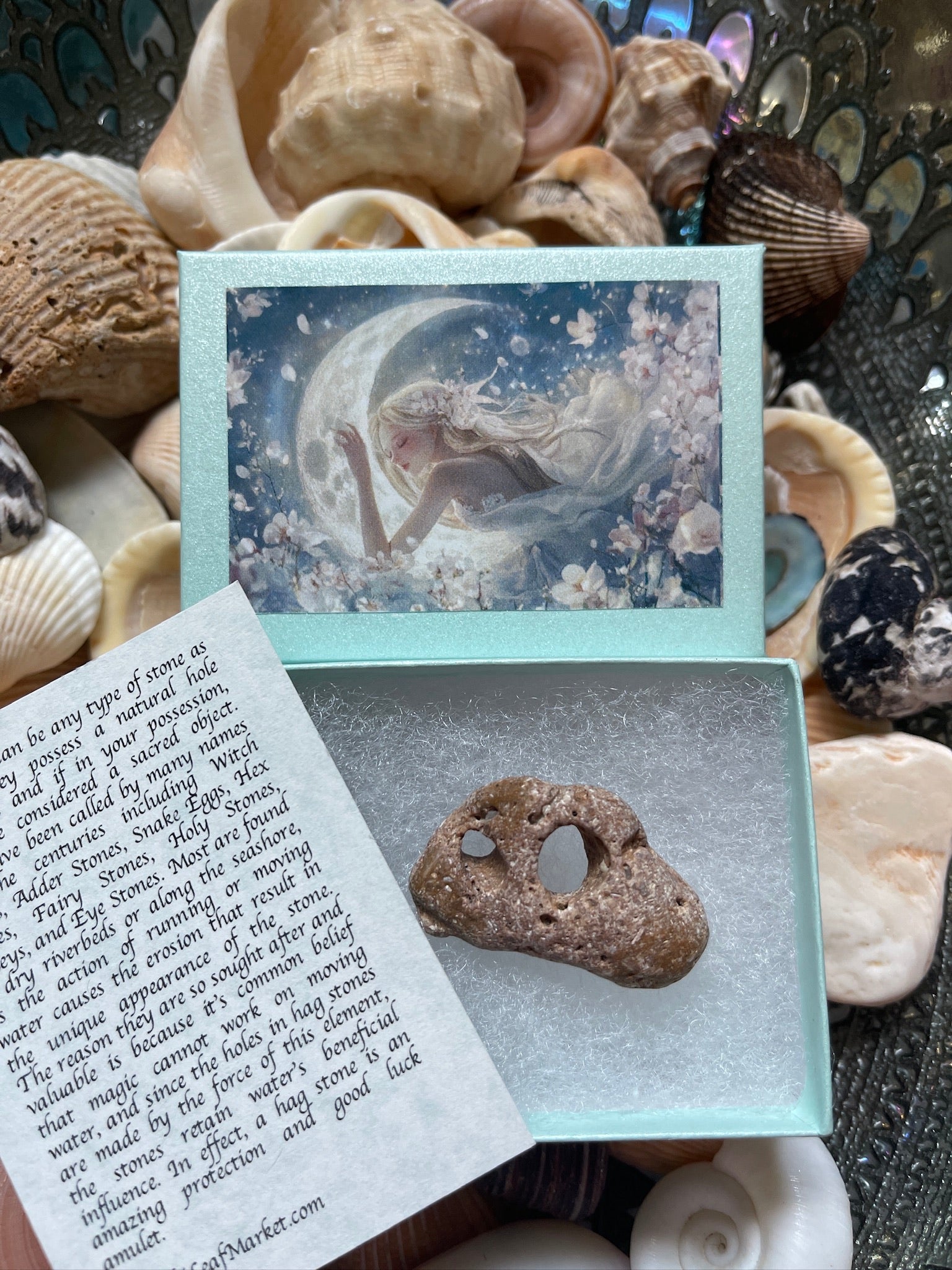 Comes gift boxed with a brief description of the magical properties of the hagstone.