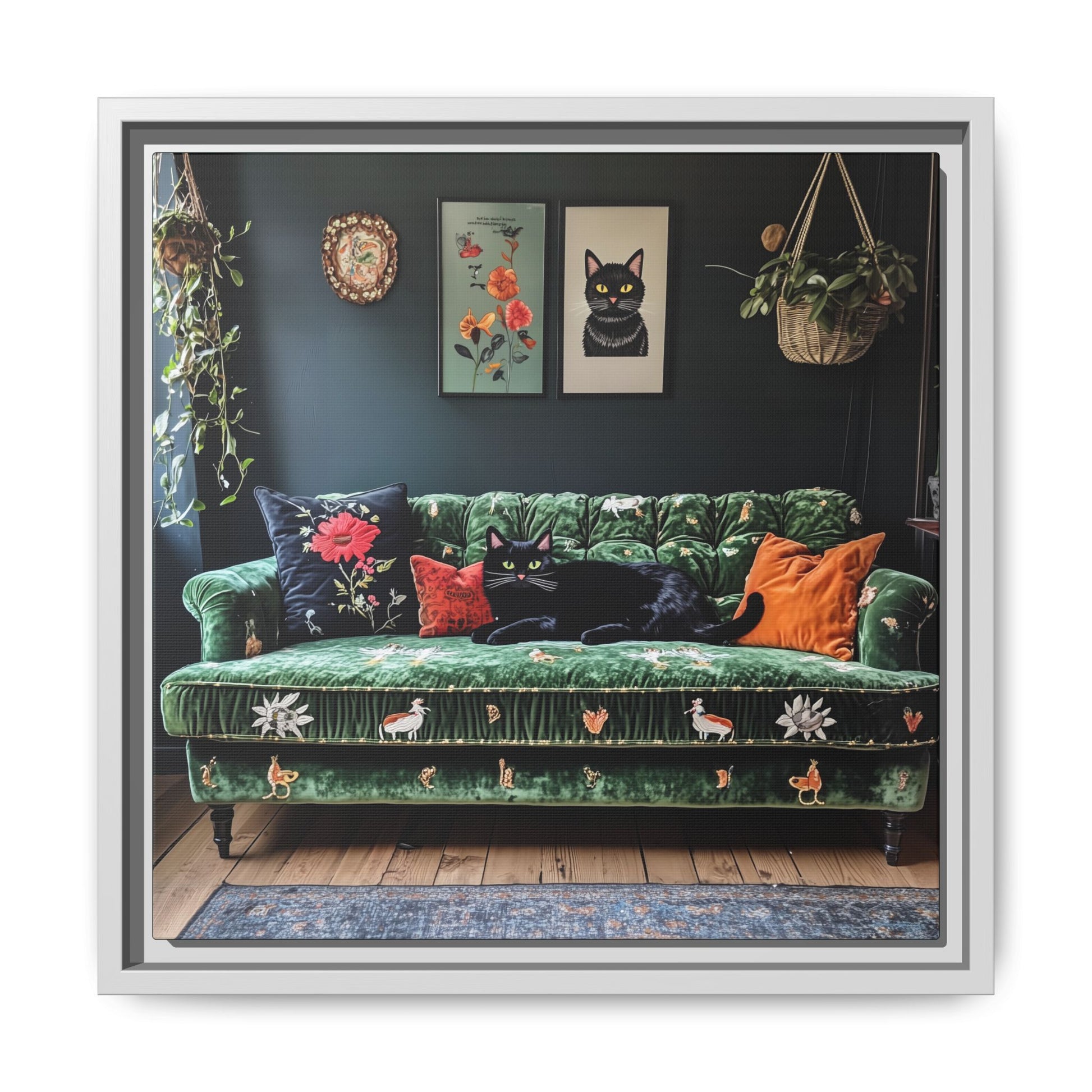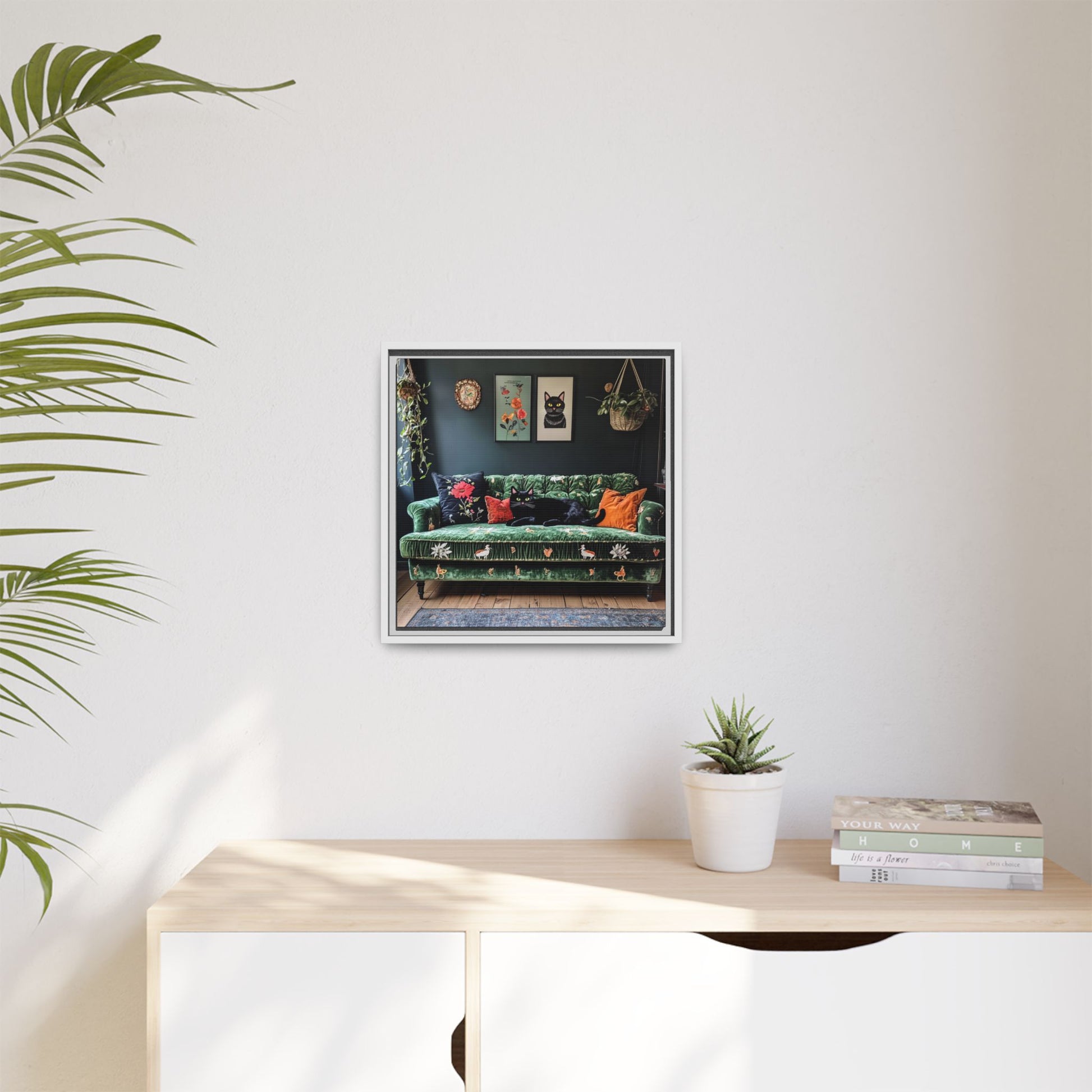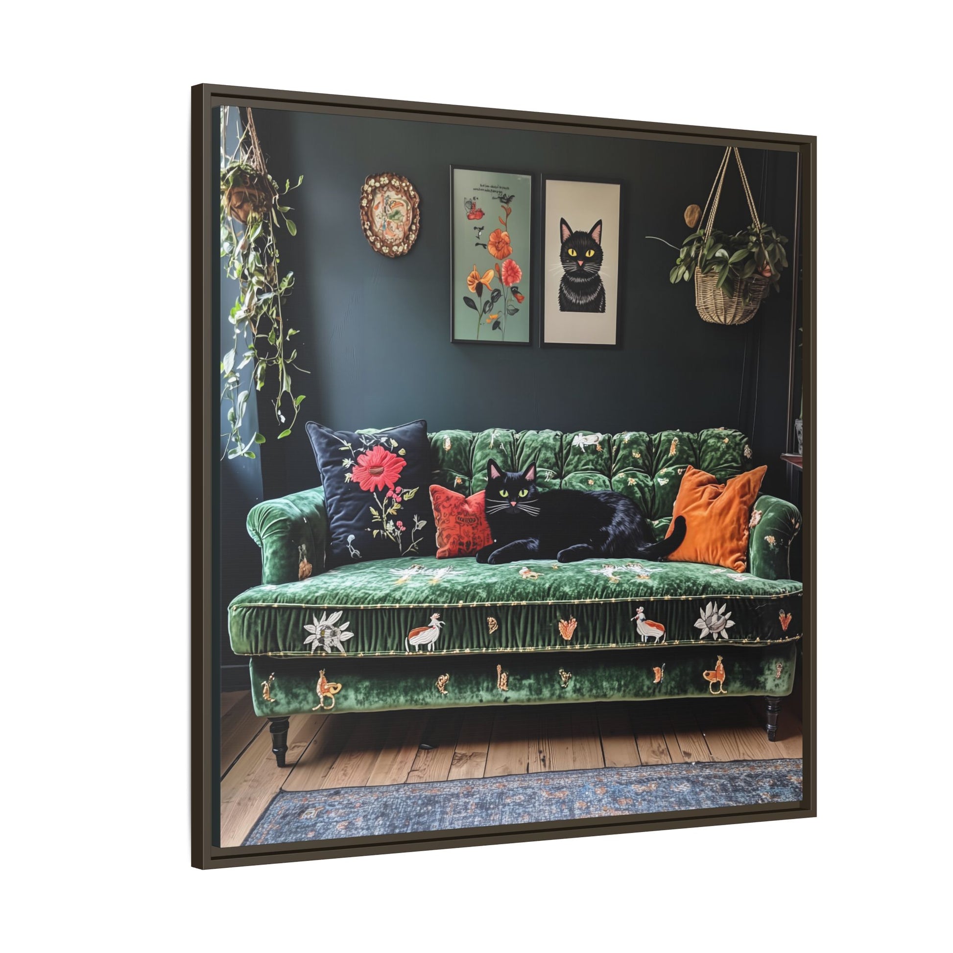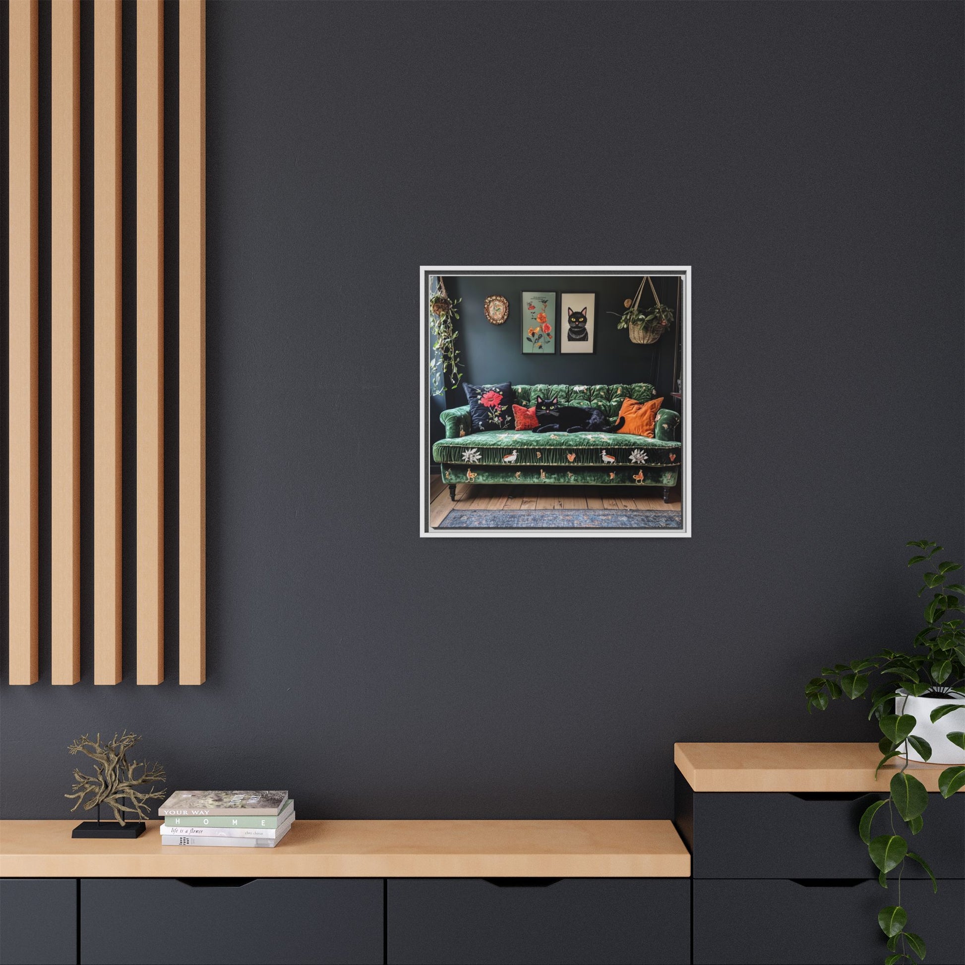 This matte canvas framed print brings a moody, collected living room to your wall — deep emeralds, velvet texture, and playful details that feel both curated and lived-in. The black frame sharpens the image and adds modern contrast, letting the sofa’s botanical embroidery and warm terracotta pillows become the room’s quiet stars. Hang it above a sofa, in a reading nook, or inside a gallery wall to add an artful pause: a cozy, grown-up charm that suggests slow afternoons, houseplants thriving on light, and a beloved cat curled among cushions.