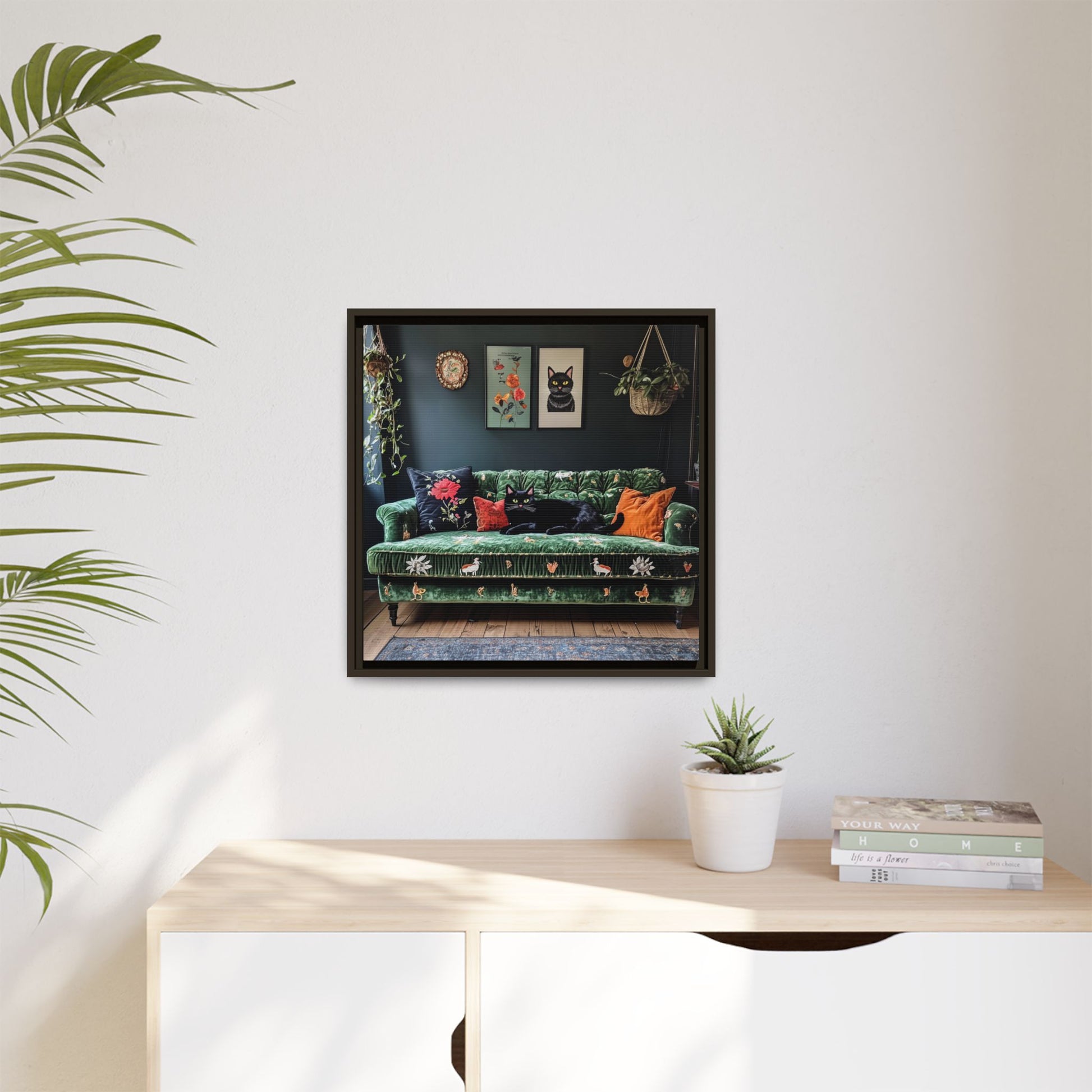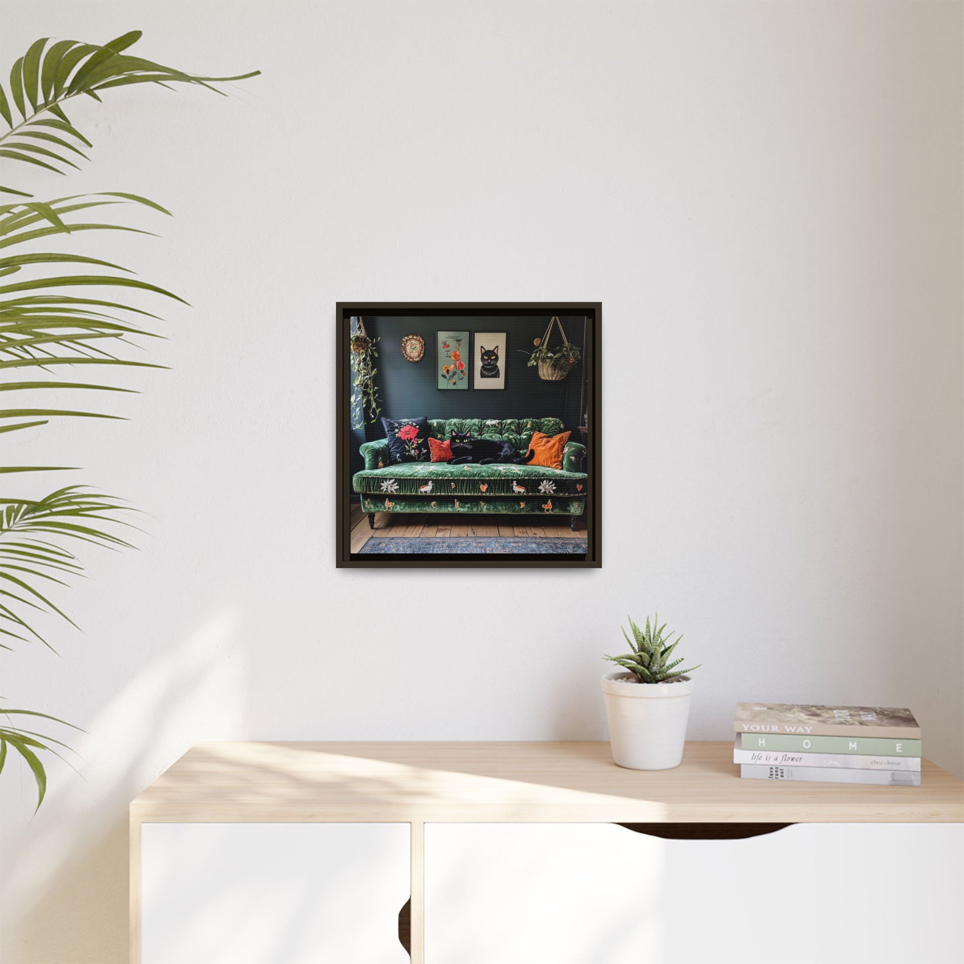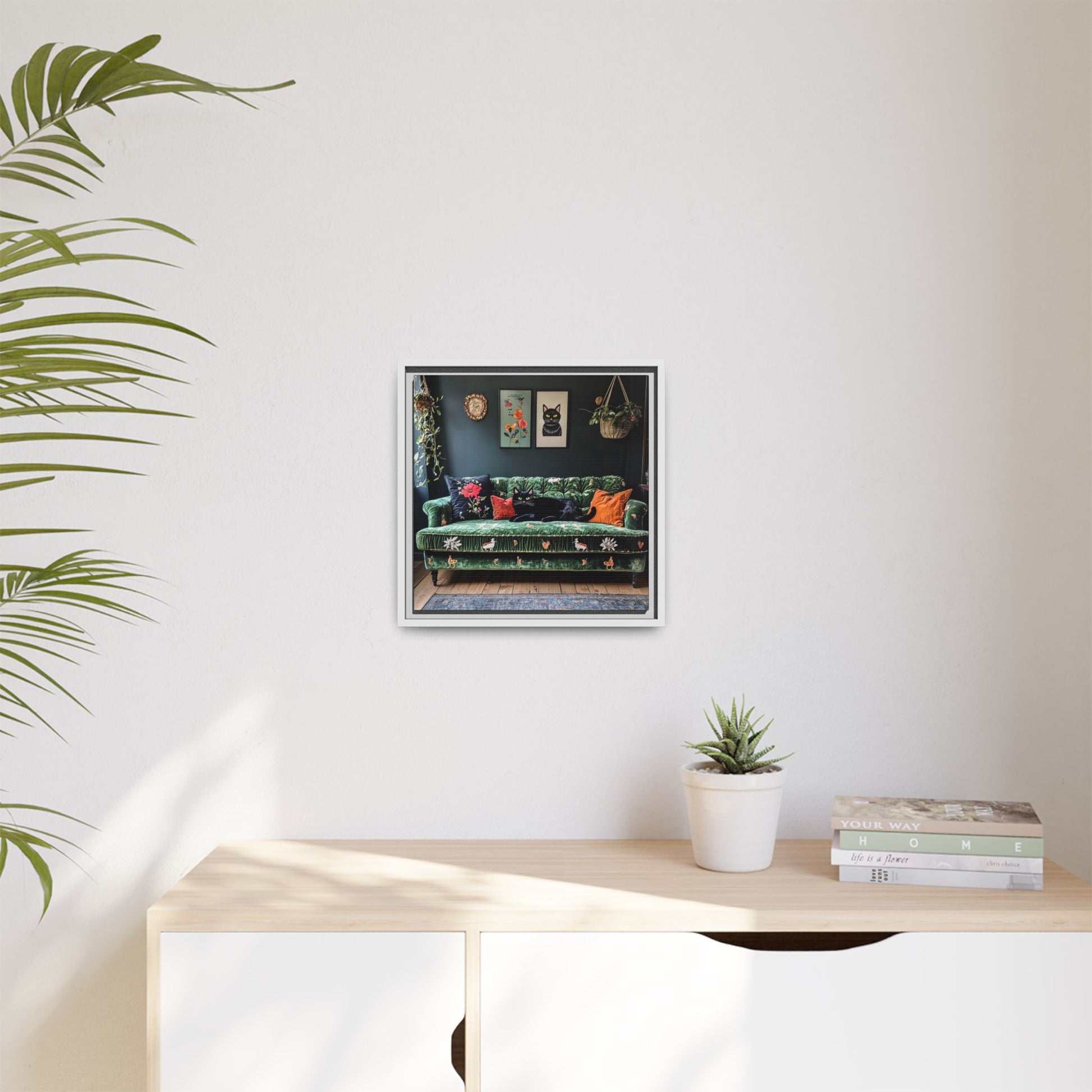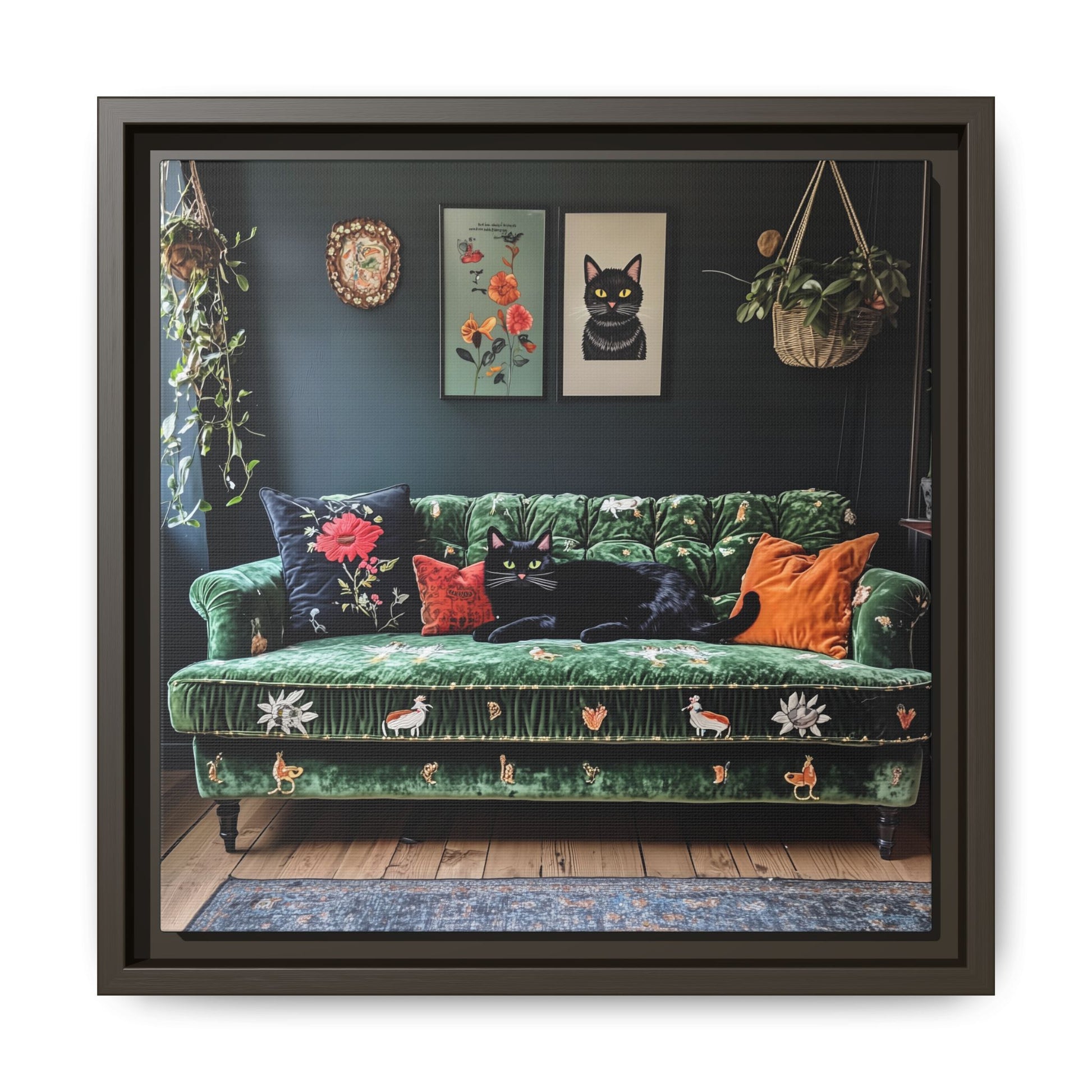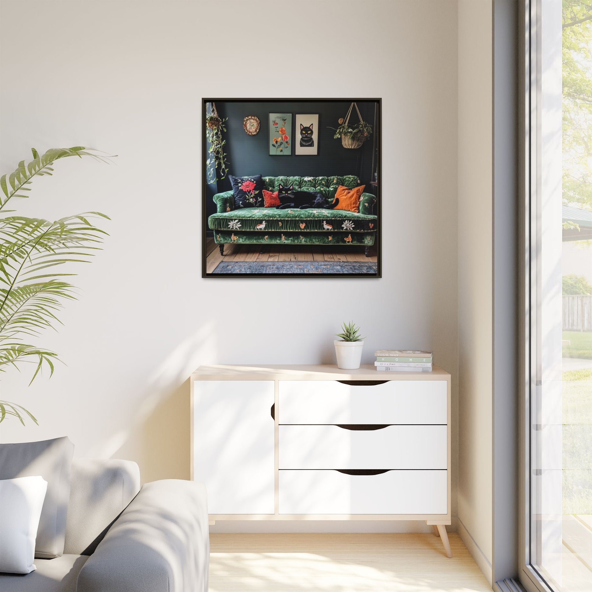 This matte canvas framed print brings a moody, collected living room to your wall — deep emeralds, velvet texture, and playful details that feel both curated and lived-in. The black frame sharpens the image and adds modern contrast, letting the sofa’s botanical embroidery and warm terracotta pillows become the room’s quiet stars. Hang it above a sofa, in a reading nook, or inside a gallery wall to add an artful pause: a cozy, grown-up charm that suggests slow afternoons, houseplants thriving on light, and a beloved cat curled among cushions.