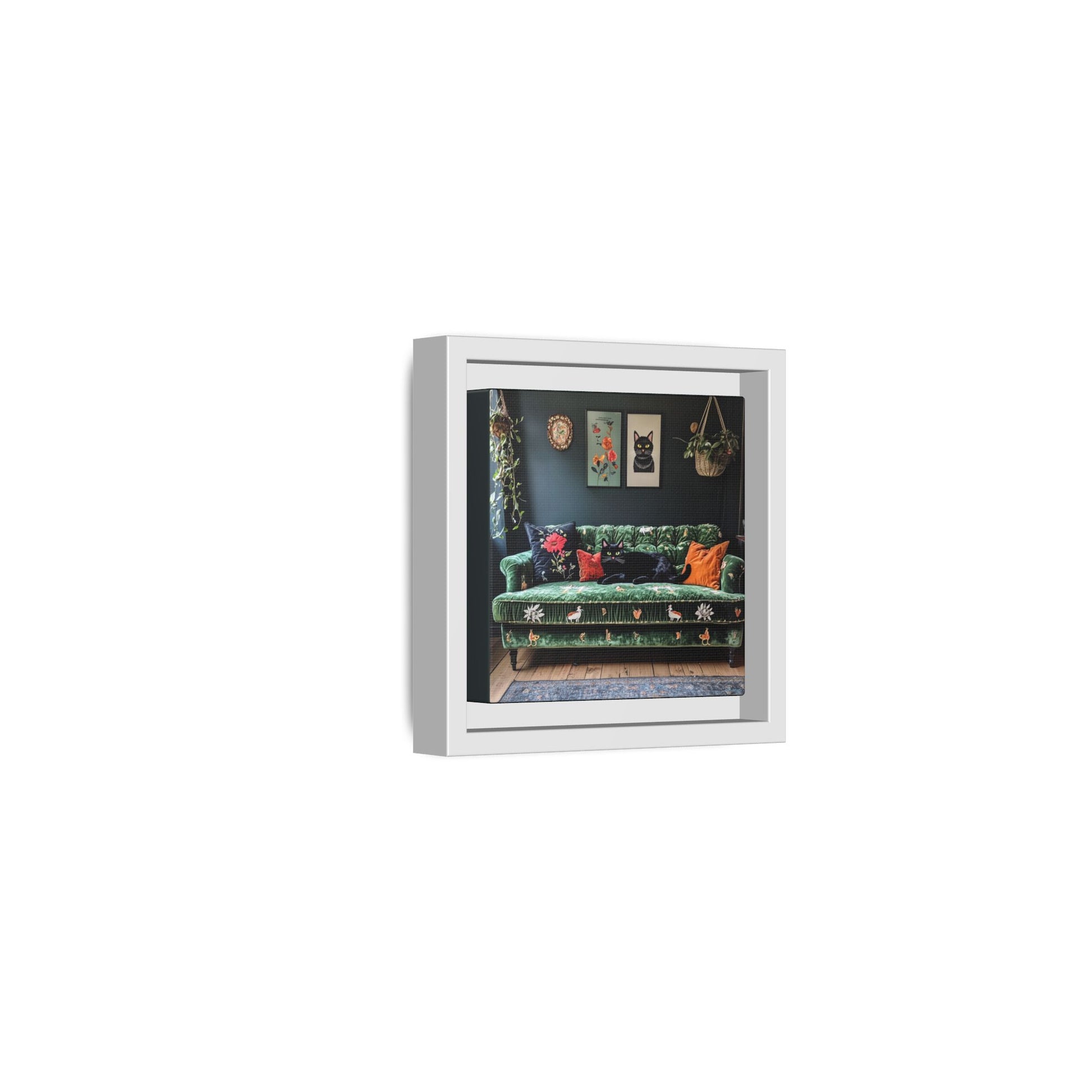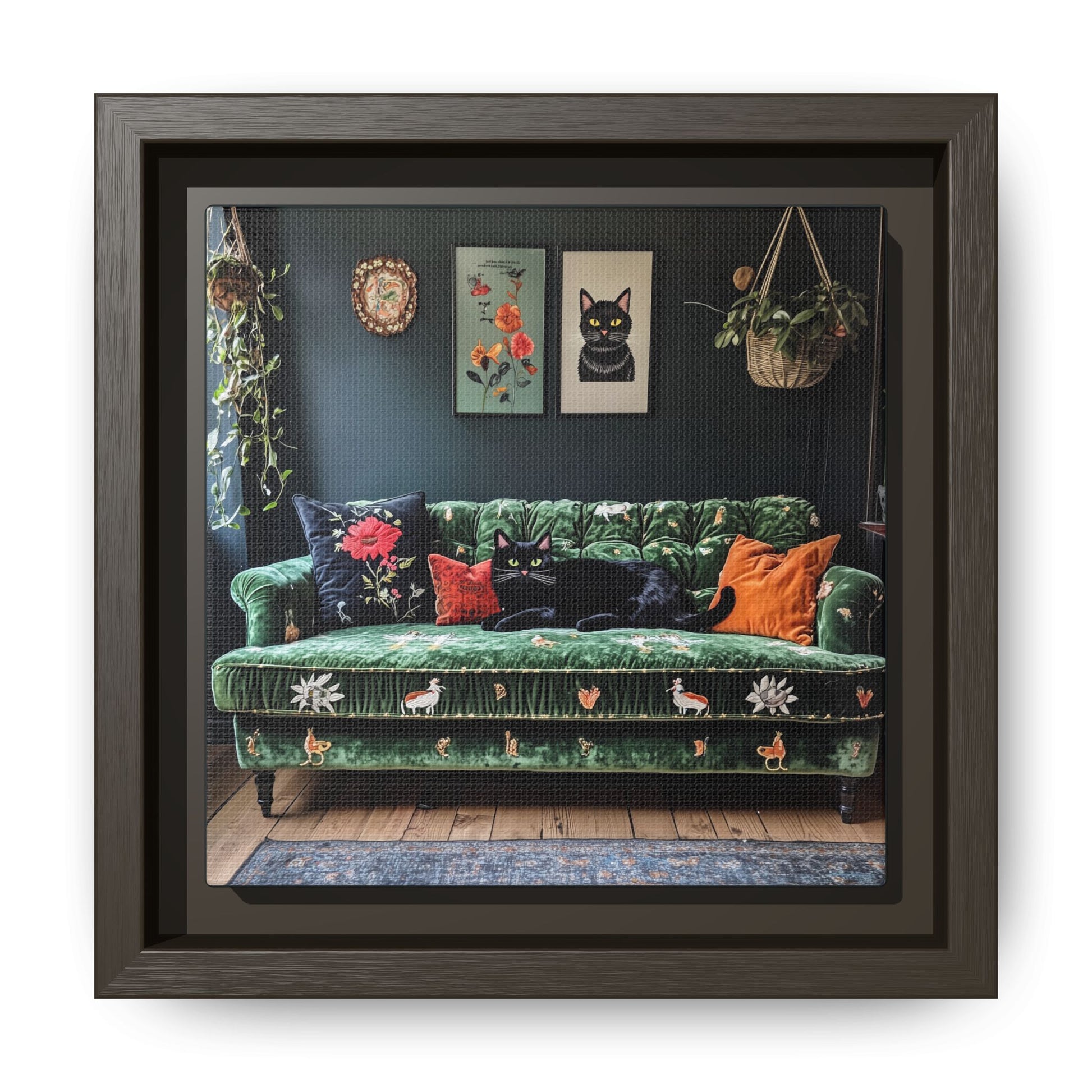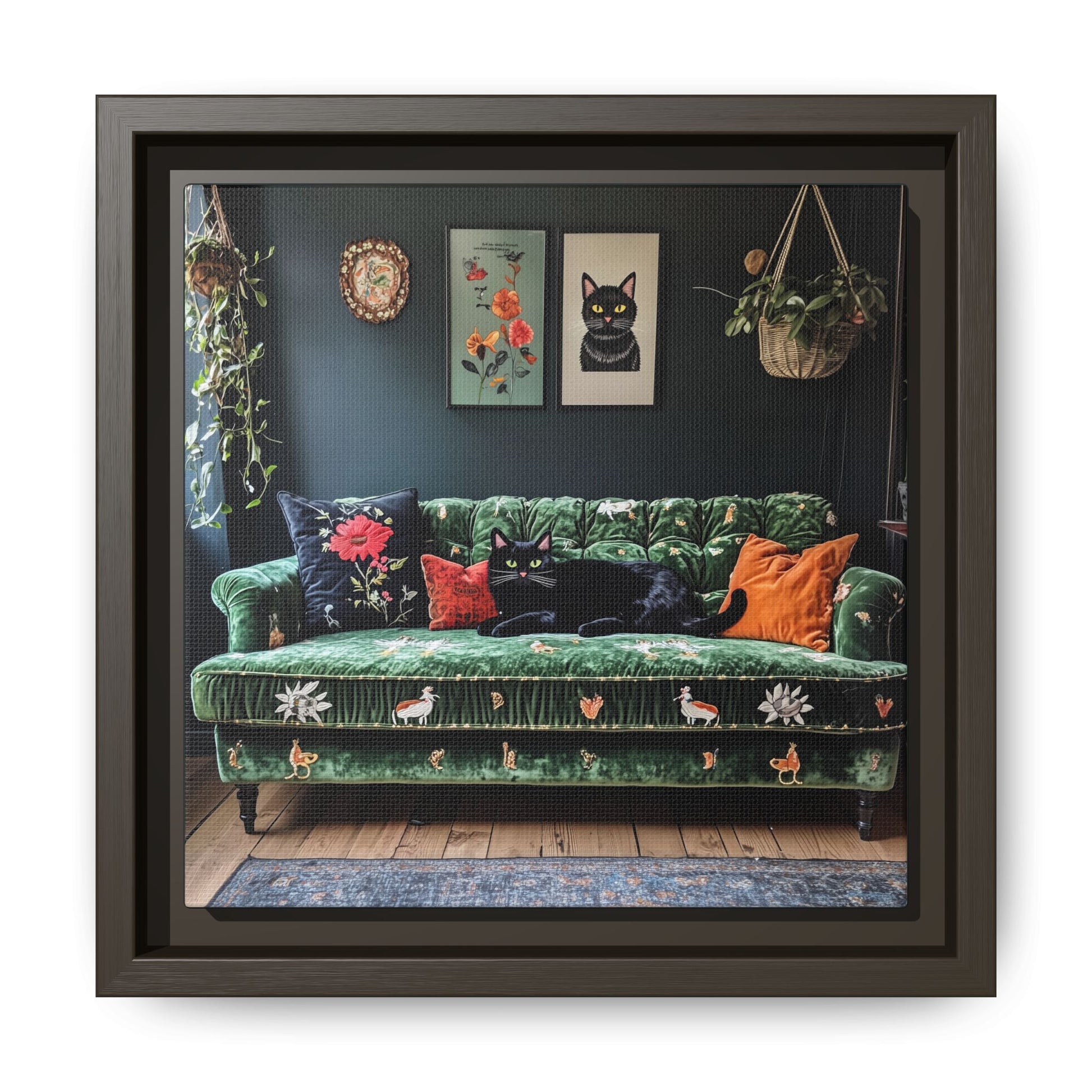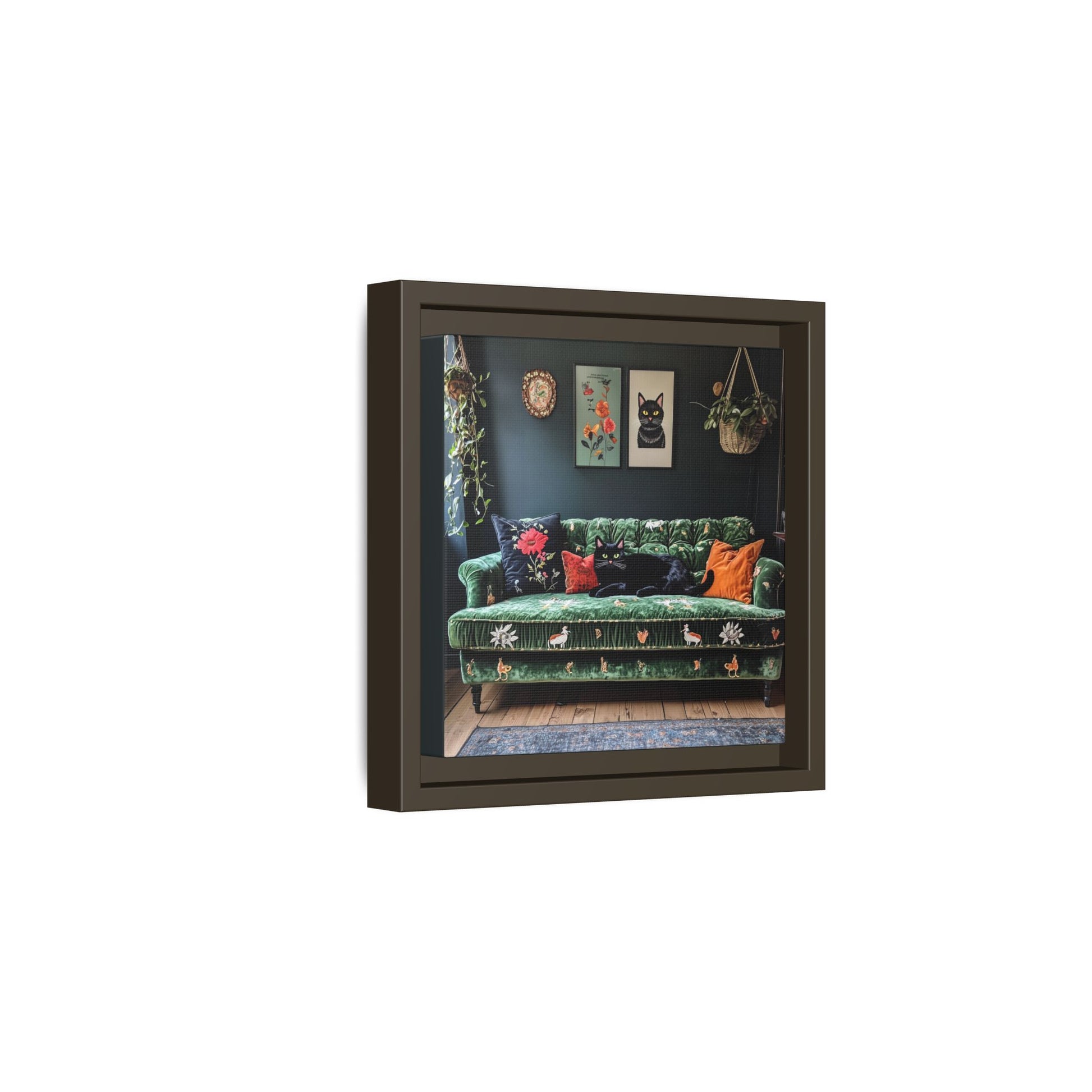 This matte canvas framed print brings a moody, collected living room to your wall — deep emeralds, velvet texture, and playful details that feel both curated and lived-in. The black frame sharpens the image and adds modern contrast, letting the sofa’s botanical embroidery and warm terracotta pillows become the room’s quiet stars. Hang it above a sofa, in a reading nook, or inside a gallery wall to add an artful pause: a cozy, grown-up charm that suggests slow afternoons, houseplants thriving on light, and a beloved cat curled among cushions.