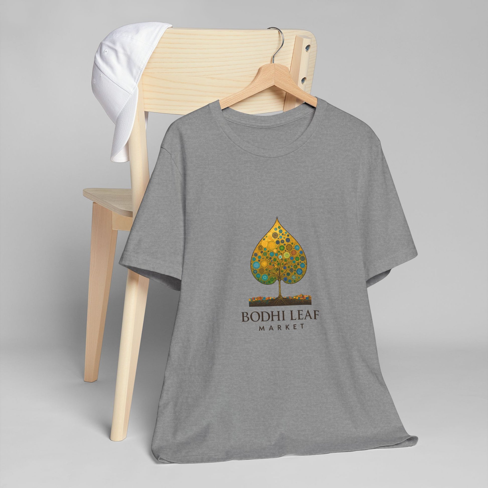 A soft, breathable tee printed with a calm, nature-inspired emblem — a stylized Bodhi leaf with warm gold and green tones resting above a subtle trunk. Lightweight and airy, this shirt feels like a quiet walk through a morning market: easy, grounded, and thoughtfully made. Wear it to carry a gentle reminder of balance and slow living into your day, whether you're browsing local stalls, practicing movement, or meeting friends for coffee. The clean crew neckline and retail fit keep the silhouette relaxed and approachable, while the tear-away label (typically removed during fulfillment) keeps the back of the neck annoyance-free. This shirt layers smoothly under jackets or over a tank, and the print sits centered on both front and back for a harmonious, wearable statement.