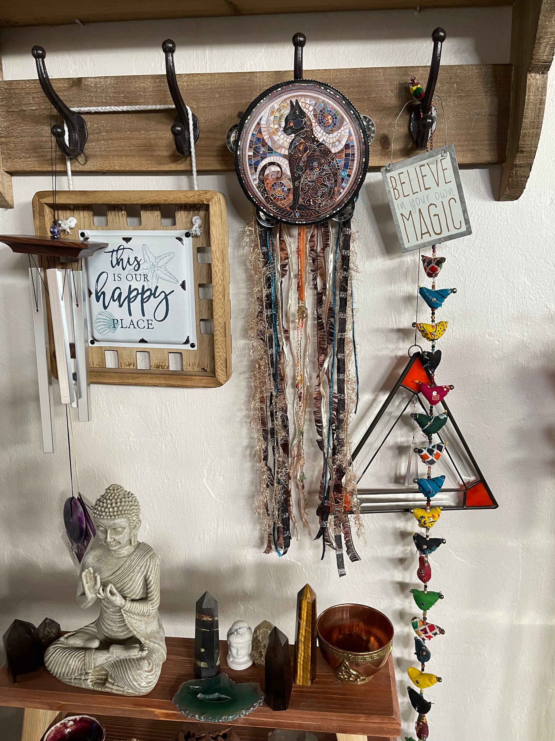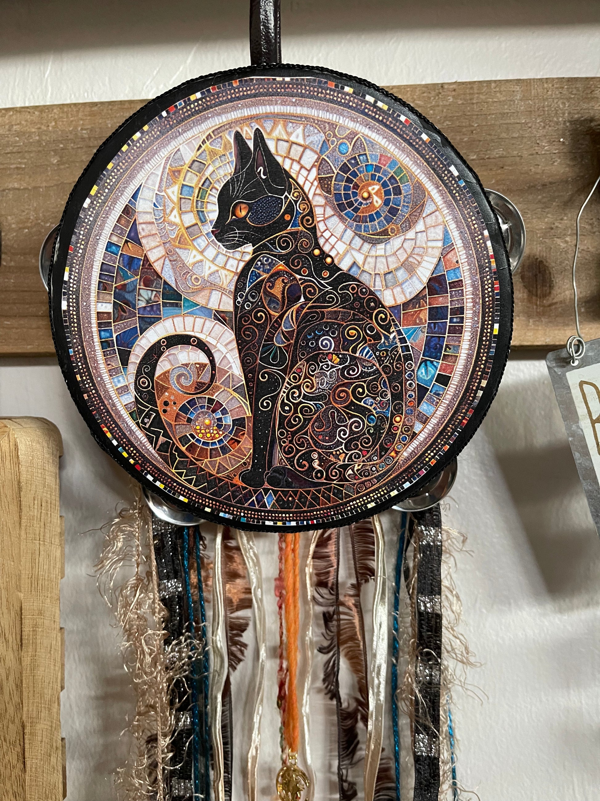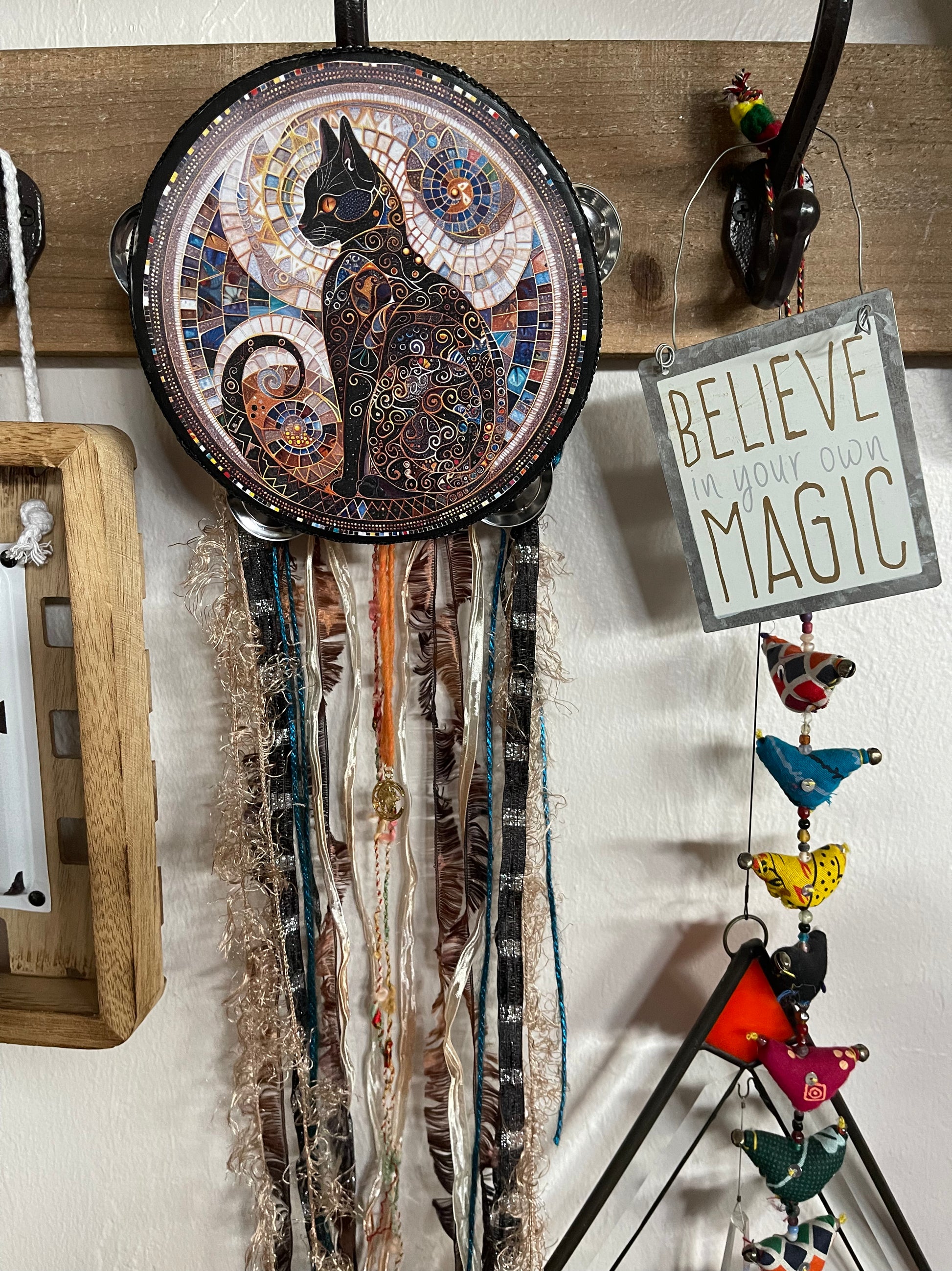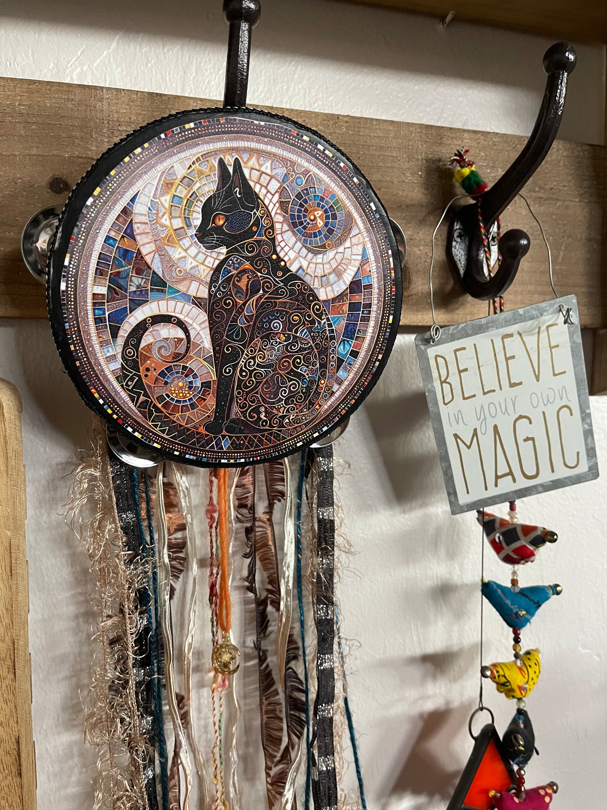 Charmed Mystical Sitting Black Cat Tambourine with Ribbon and Charm, Bodhi Home Decor