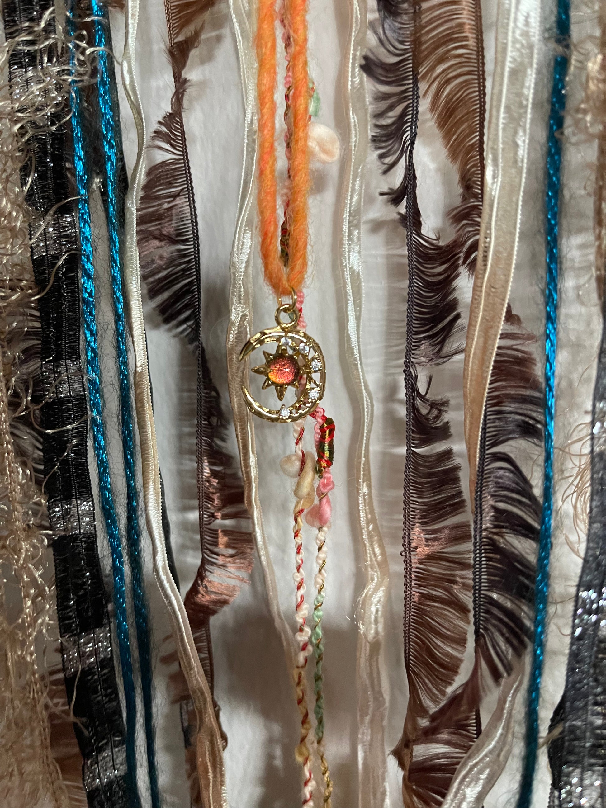 Crafted with meticulous detail, the tambourine features a vibrant cascade of quality ribbon and a captivating charm.