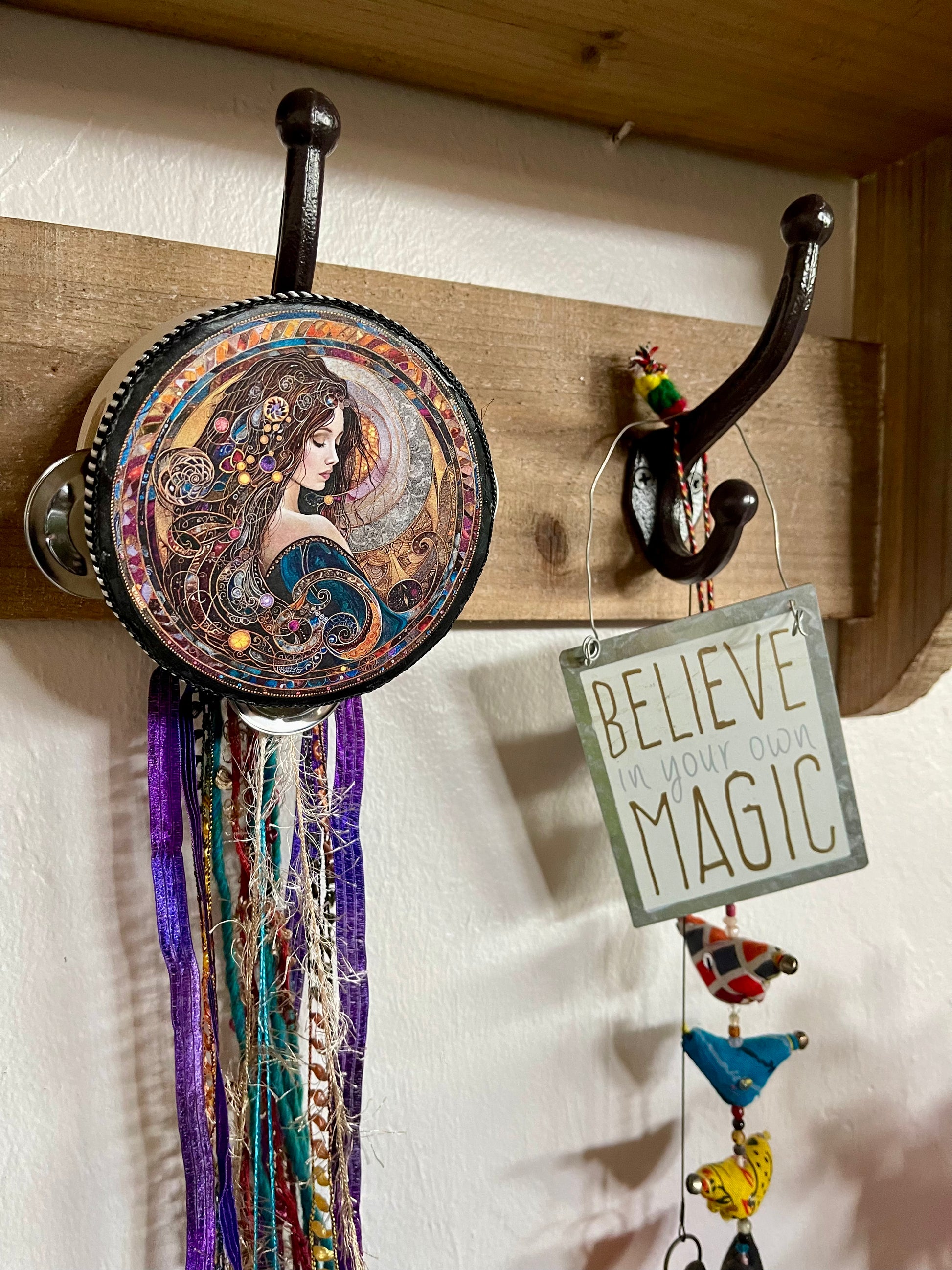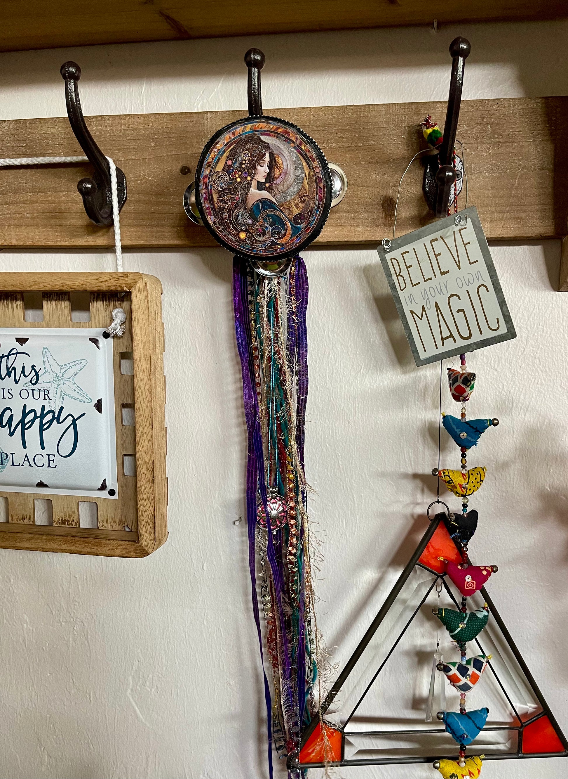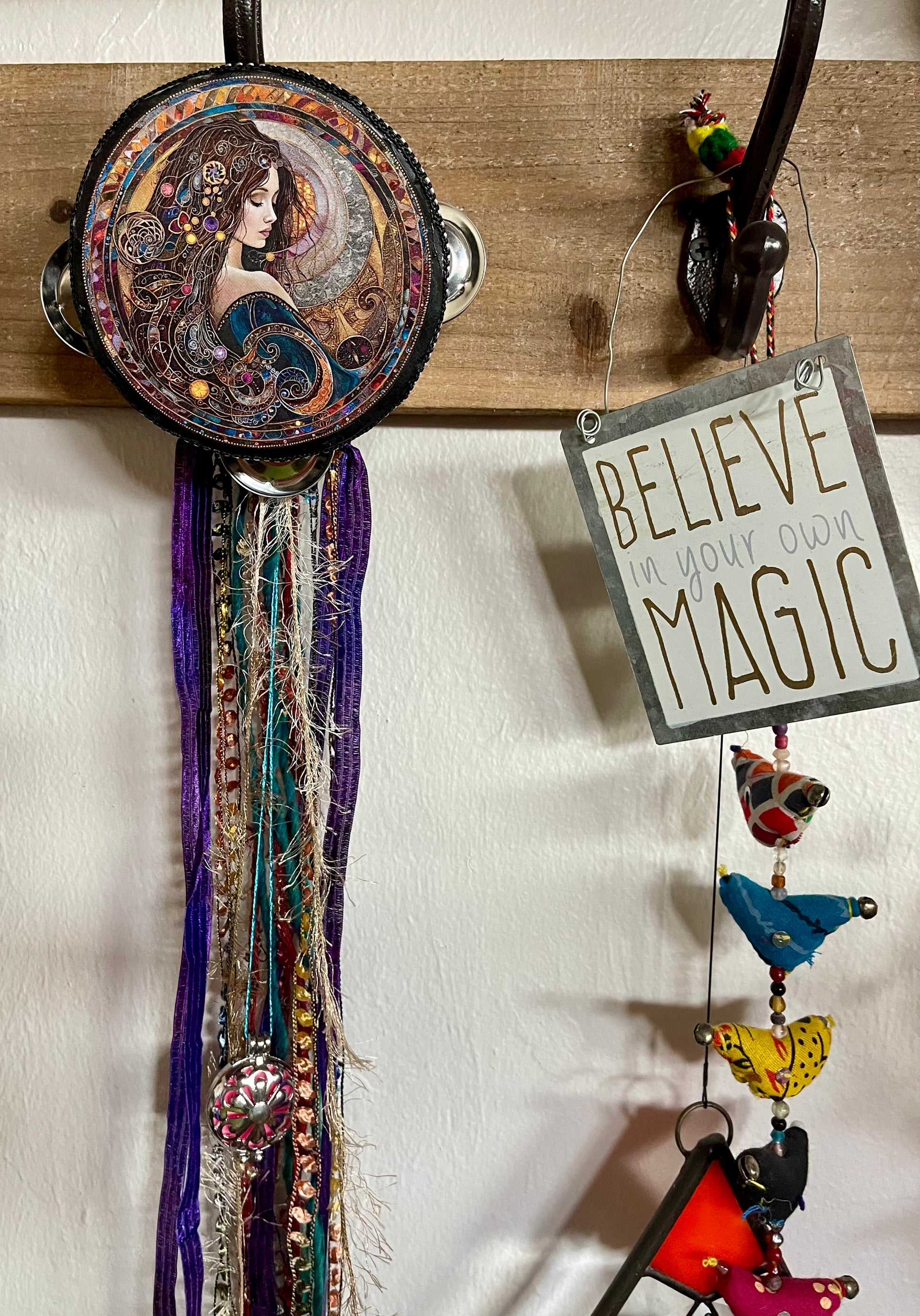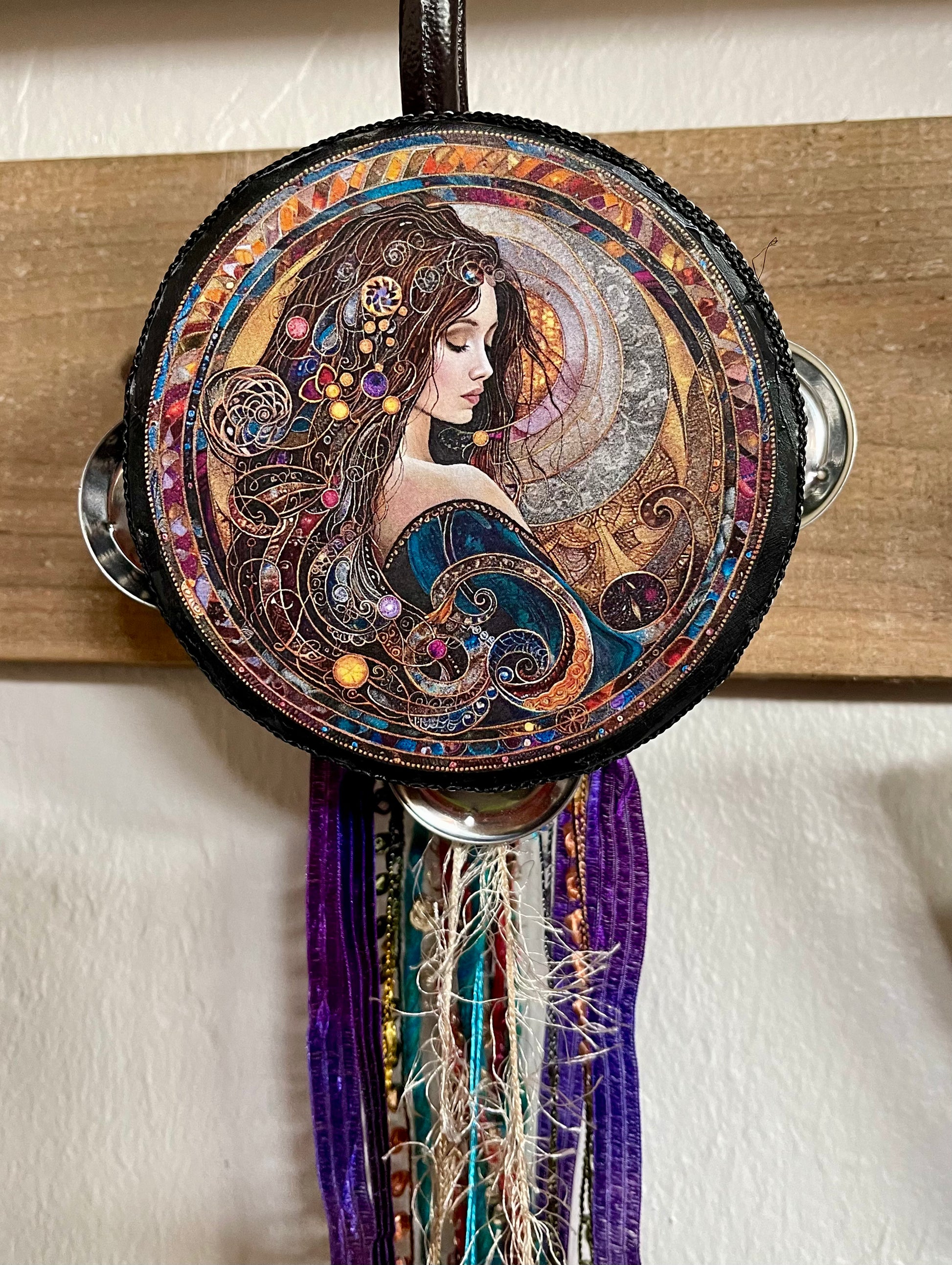Elevate any space with the mystical allure of this exquisite tambourine.