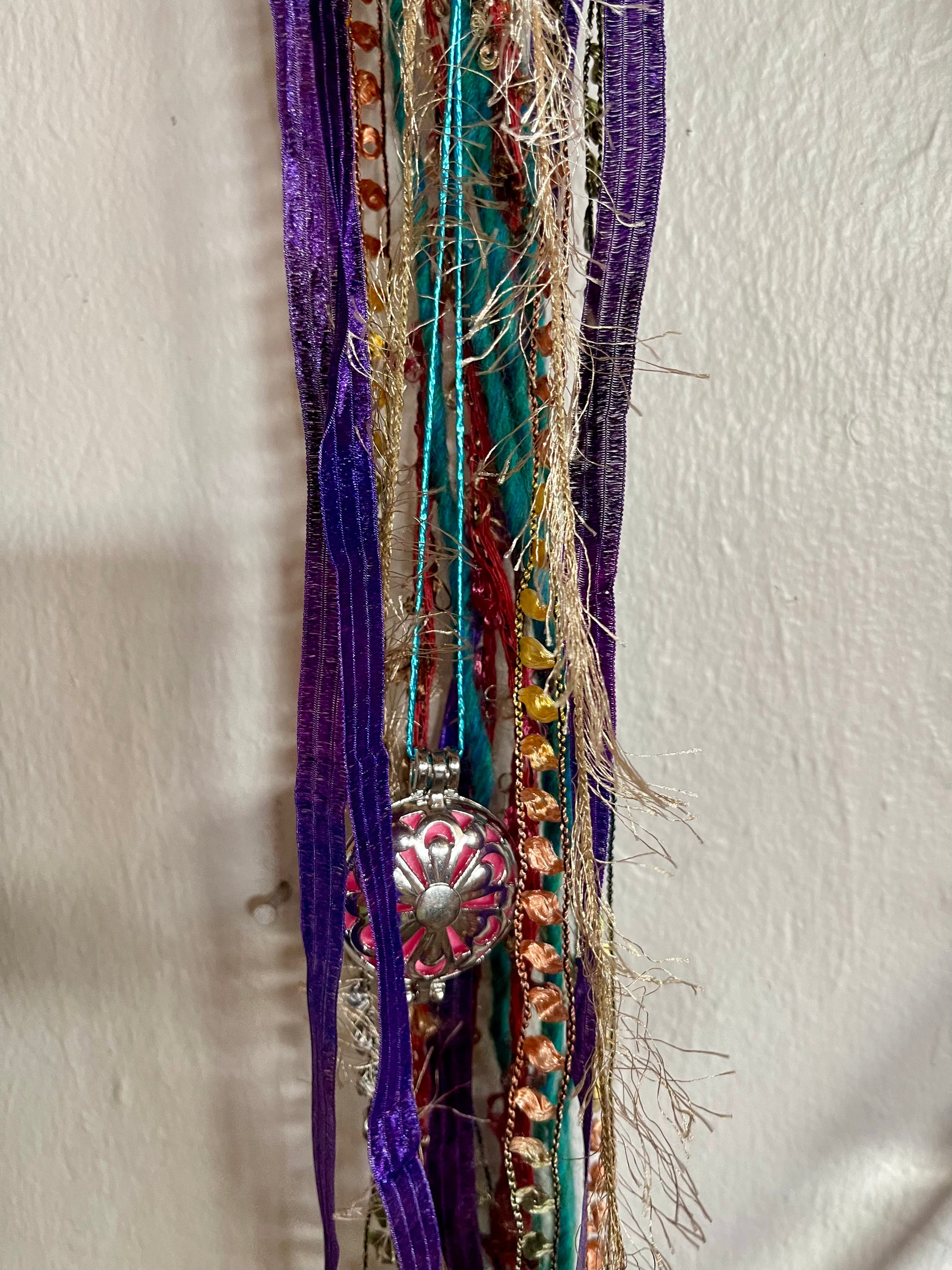 Crafted with meticulous detail, the tambourine features a vibrant cascade of quality ribbon and a captivating diffuser charm. Scented with palo santo.