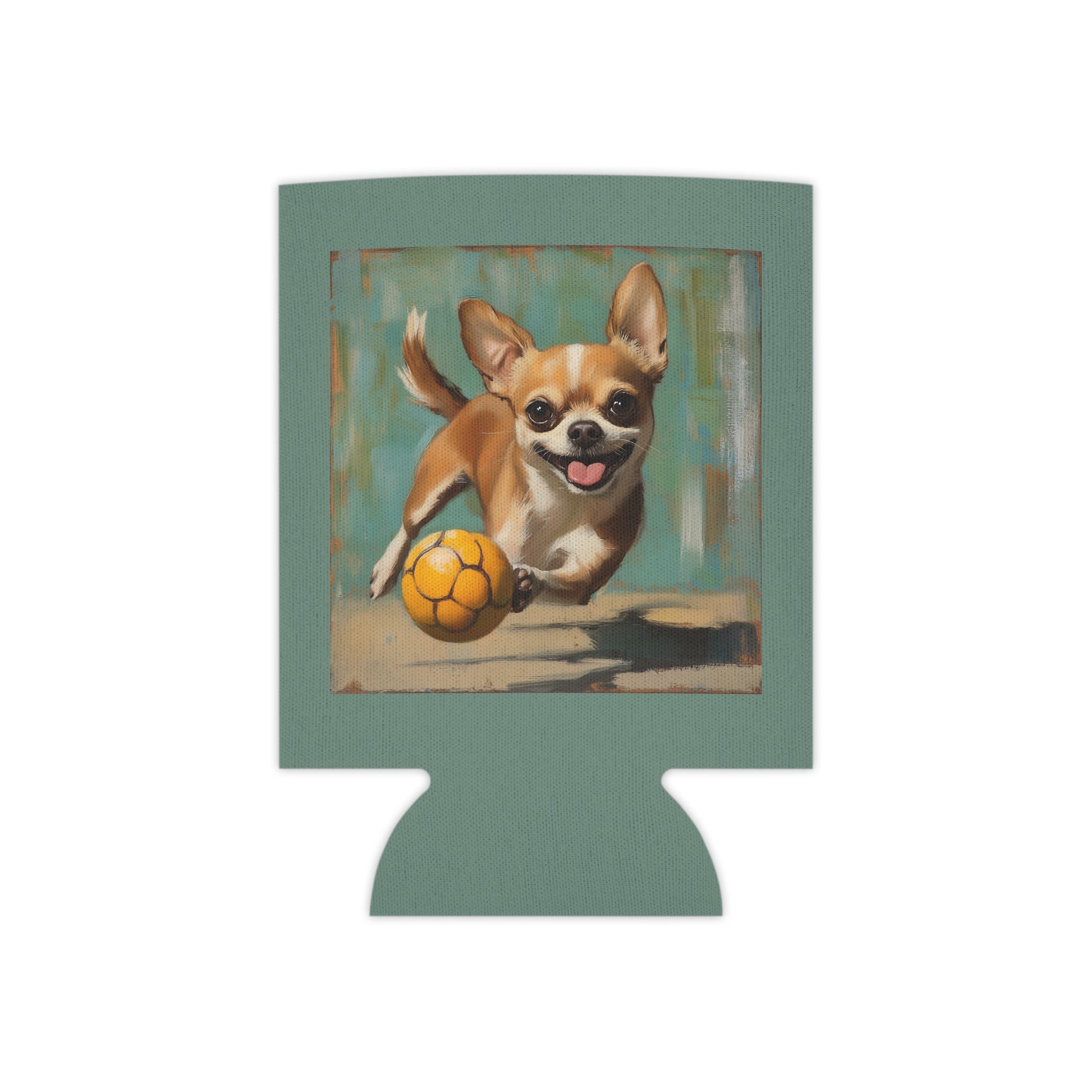 A cheerful can cooler printed edge-to-edge with a lively painting of a tiny chihuahua chasing a bright orange ball. Soft foam inside grips your can while the durable polyester exterior holds vibrant, brushstroke-rich color that won’t wash out. It slips over regular or slim cans and brings a playful, sunlit energy to backyard barbecues, picnic blankets, and slow Saturday mornings on the porch. Carry a bit of canine joy to dog-walking meetups, casual get-togethers, or anytime you want a small, uplifting detail that sparks smiles.