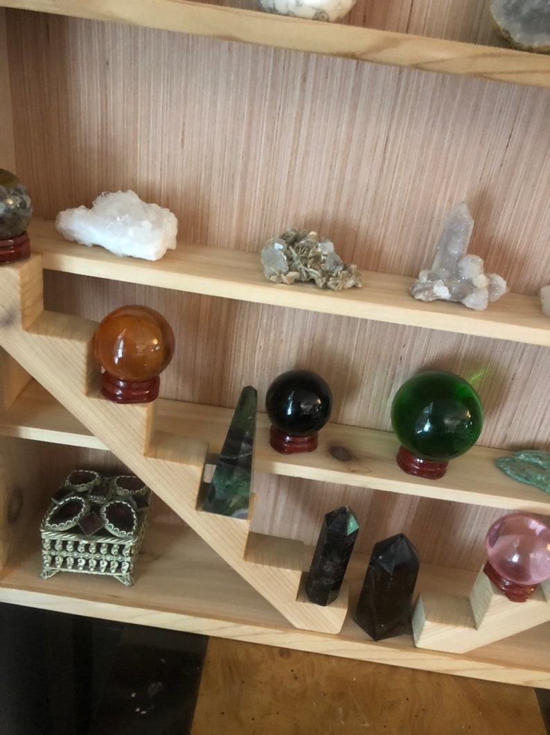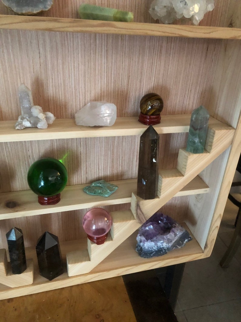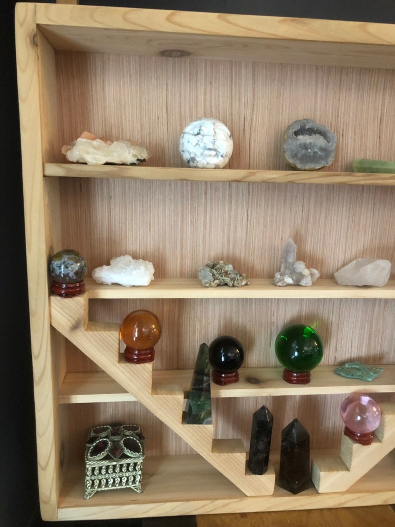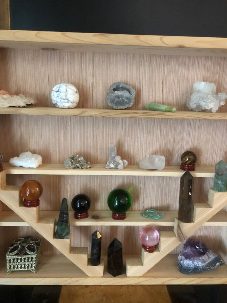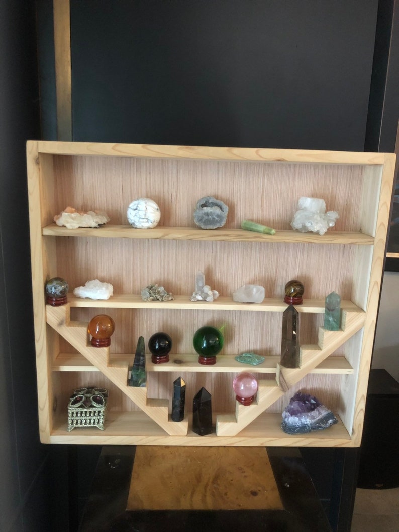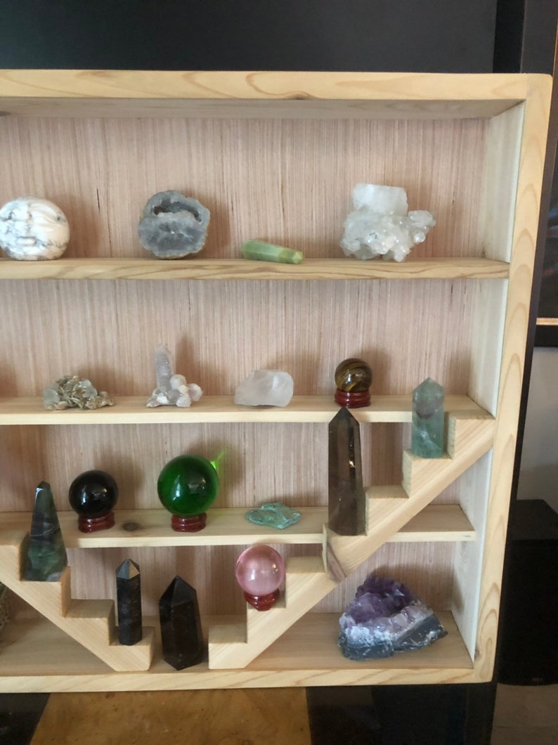 If you have a lot of crystals this is the perfect shelf for you! The staircase showcases towers and spheres and the horizontal shelves have so much room for all of you lovelies!