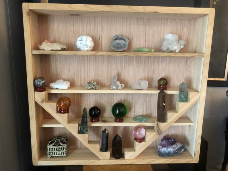 This beautiful sturdy pine essential oil and crystal shelf can be left natural... or stained/painted.