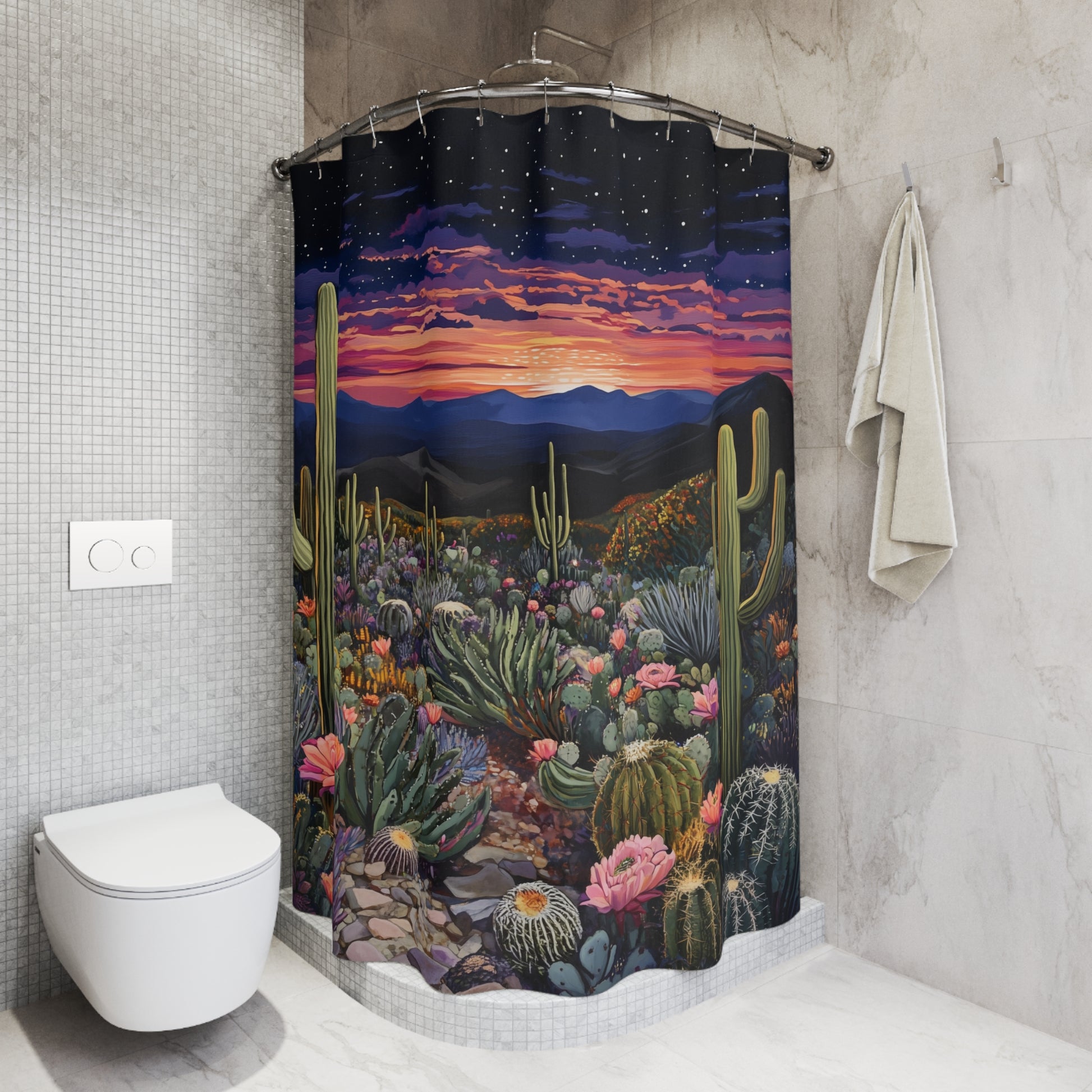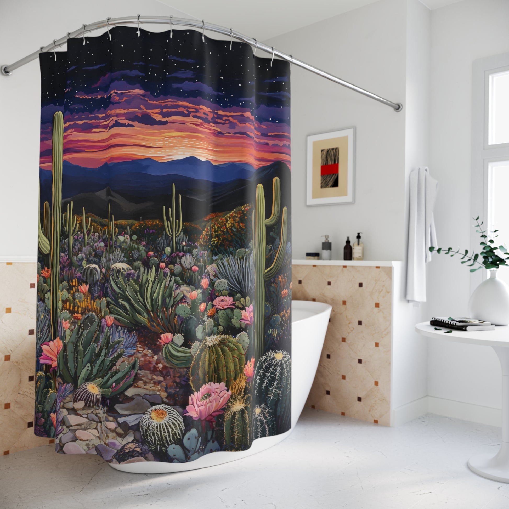 Transform your bathroom into a serene desert oasis with this stunning shower curtain. Featuring a vibrant design of cacti against a breathtaking sunset, this product brings an enchanting atmosphere to your bathing space. Perfect for those who appreciate nature's beauty, it adds a colorful touch that energizes your daily routine. This shower curtain is ideal for anyone looking to revamp their home decor, especially those with a love for bohemian or southwestern styles. It makes an excellent gift for holidays, housewarming parties, or as a thoughtful treat for loved ones celebrating special occasions like birthdays or anniversaries.