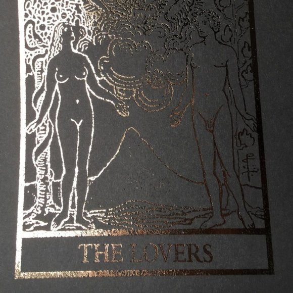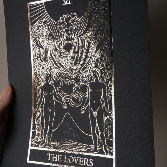 Handmade Distressed Gold Foiled The Lovers Tarot Print Printed on 65 lb cover black cardstock and foiled in gold.