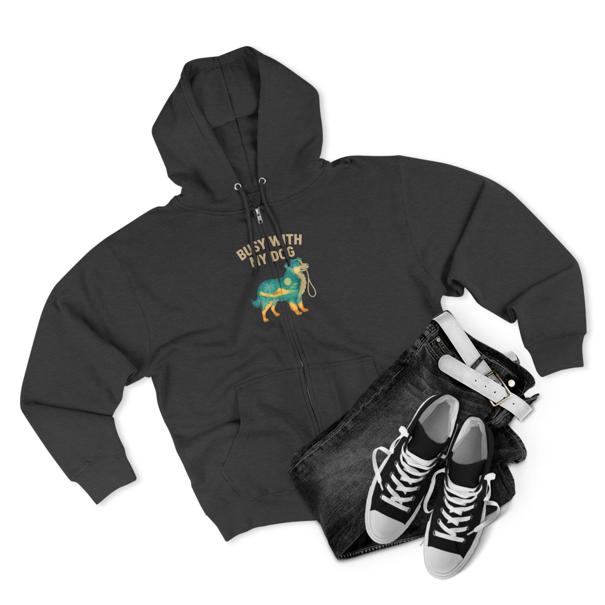 This zip hoodie carries the easy, companionable energy of a long walk with your dog. Midweight fleece and a three-panel hood wrap you in warmth; the kangaroo pocket keeps hands cozy and leash-ready. The artwork — a playful dog with a rolled leash and the words “Busy With My Dog” — sits subtly on chest and back, like a quiet inside joke between fellow dog lovers. It’s the kind of layer you reach for on cool mornings at the park, slow weekends with a hot drink, or errands when you’d rather be outside with your pup.
