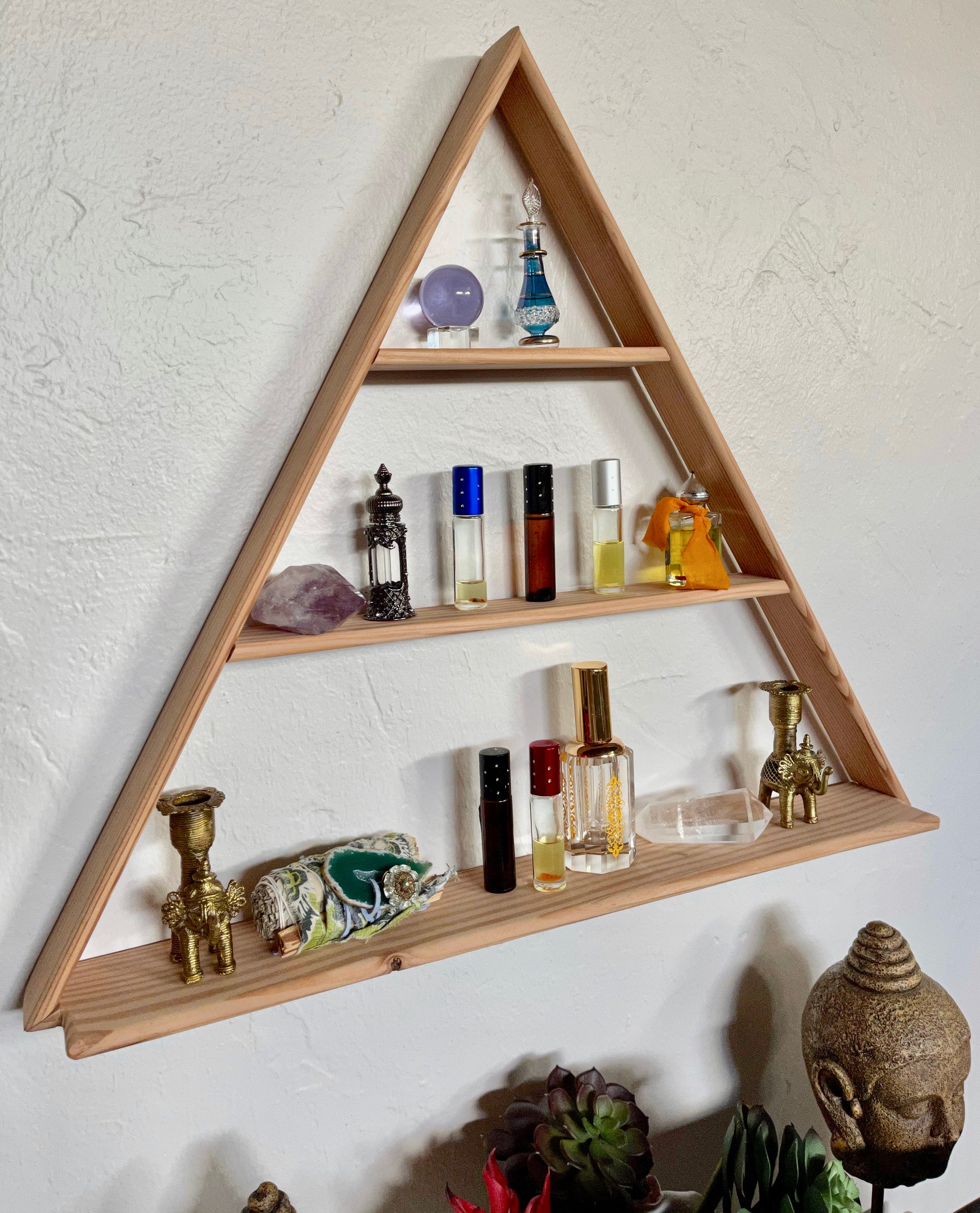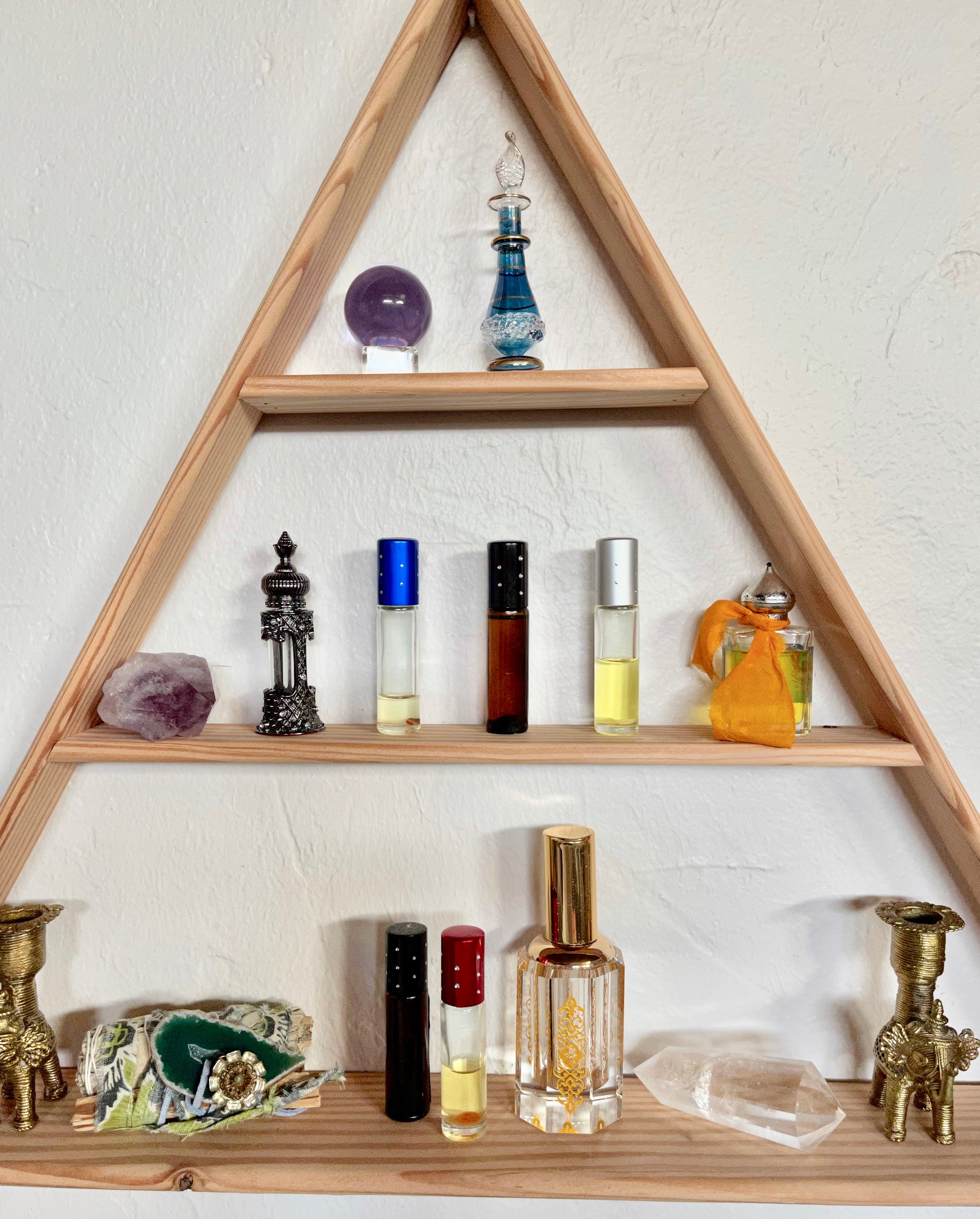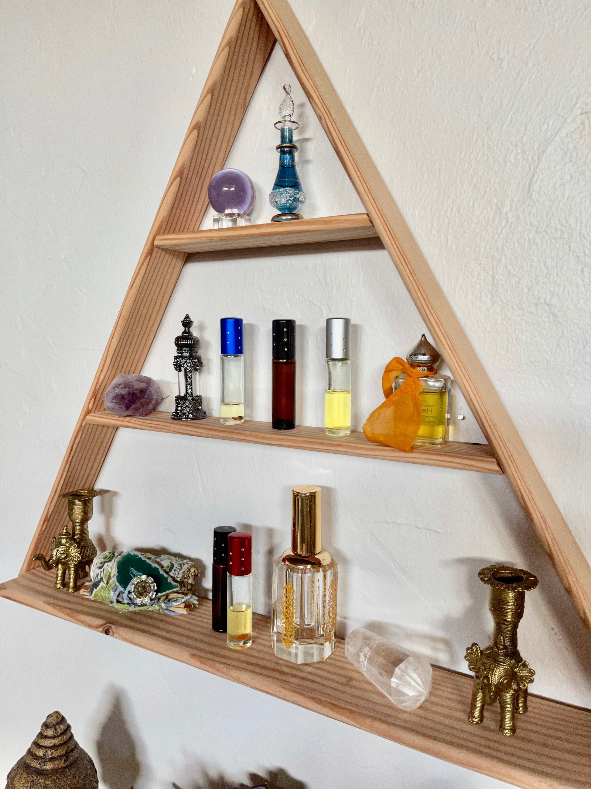 This large but lightweight triangle shelf is a perfect way to display all of your perfumes and essential oils.