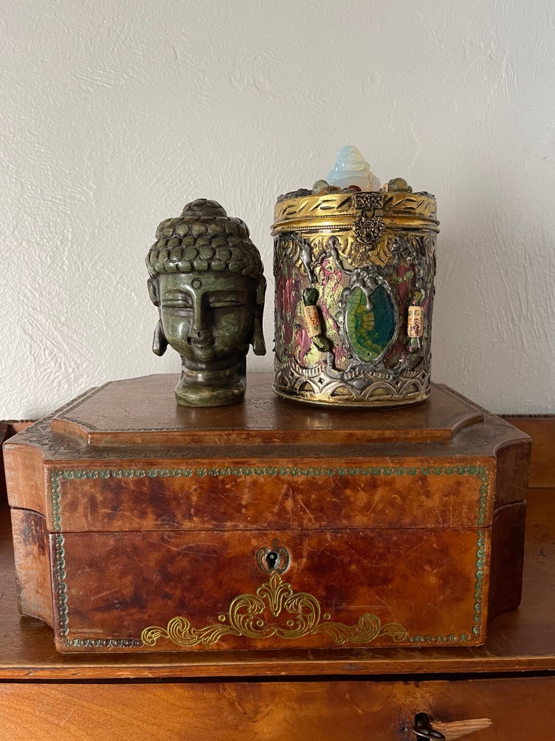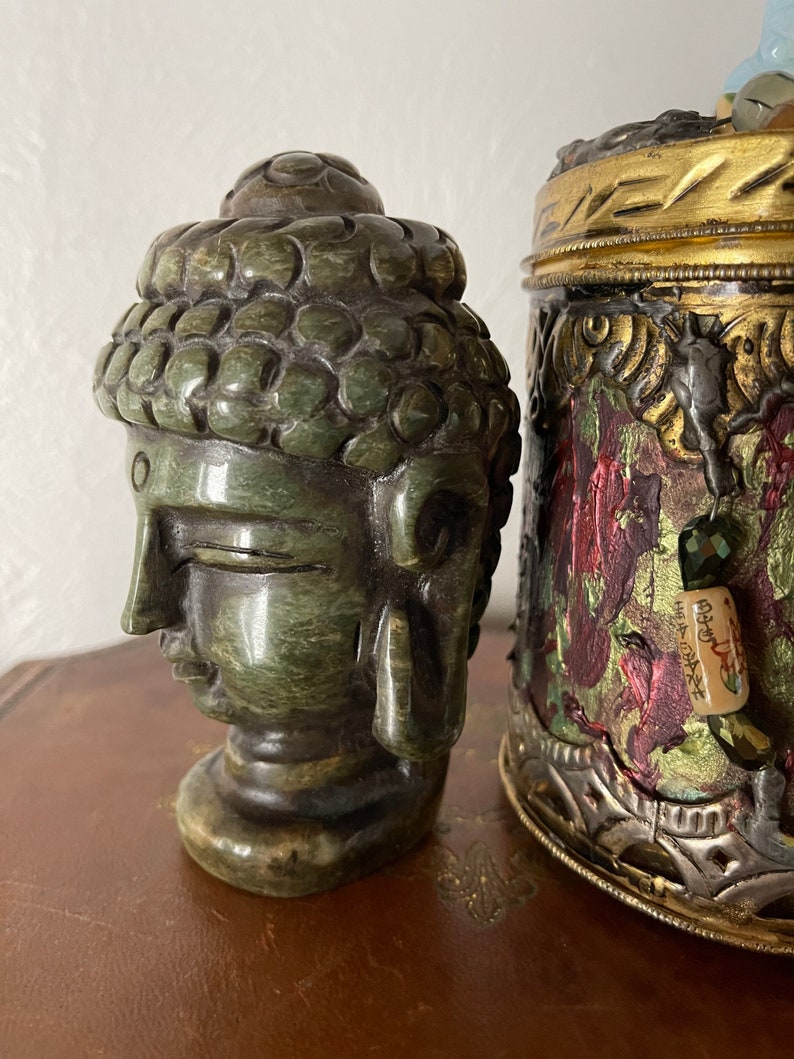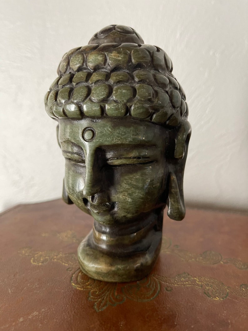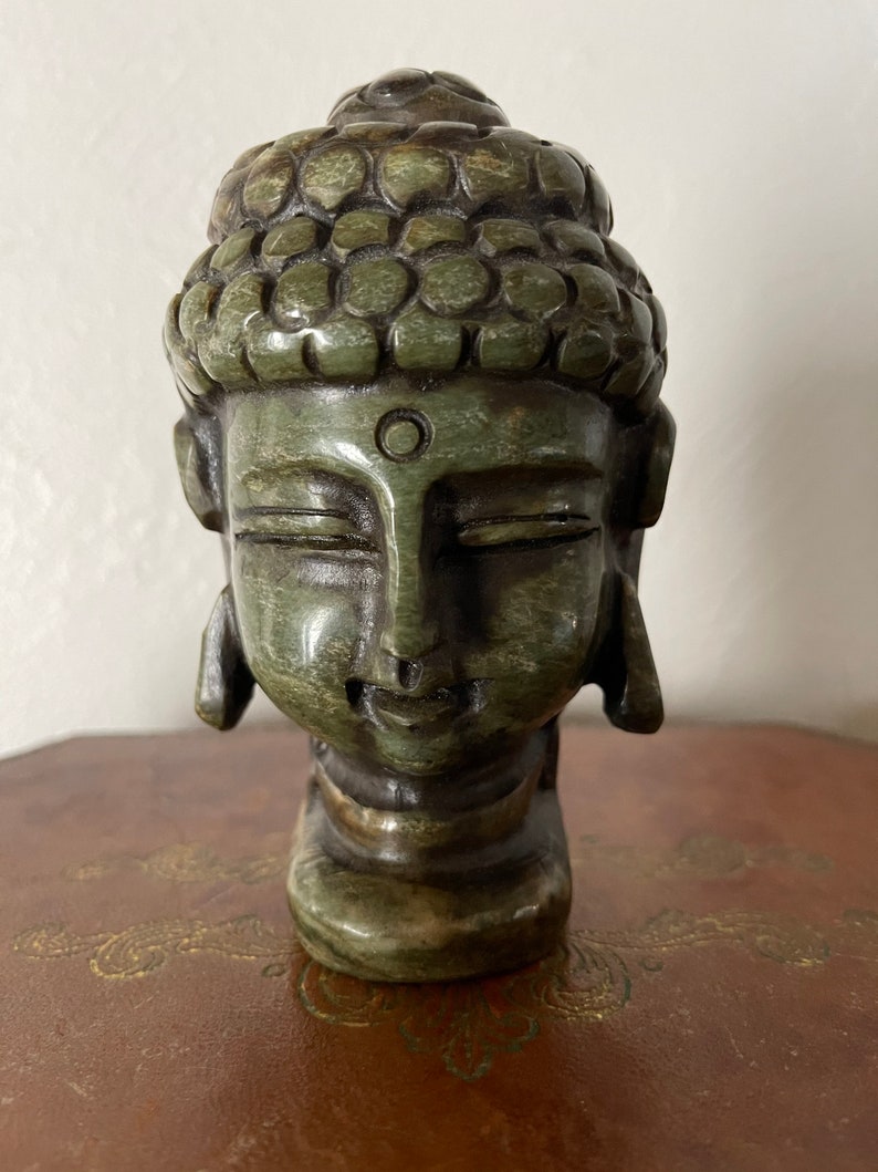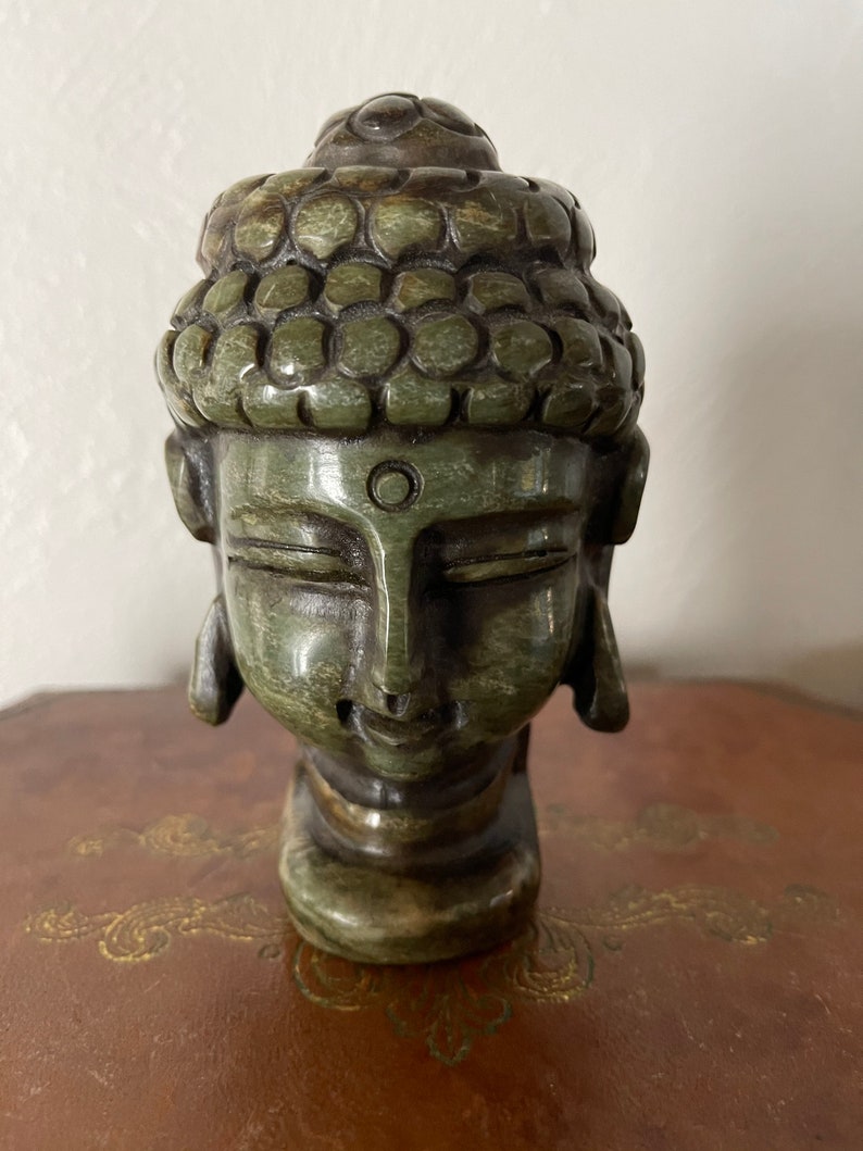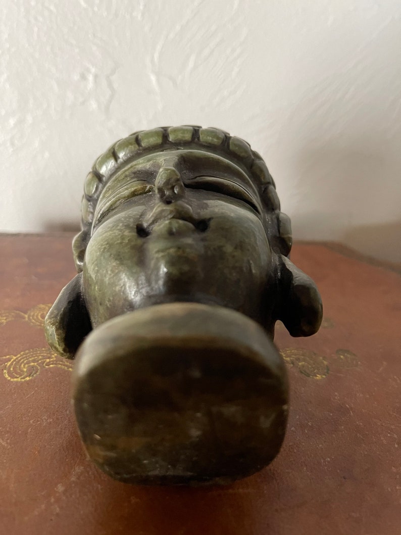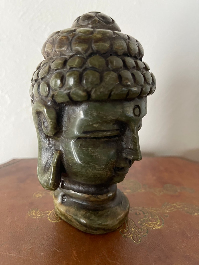 This vintage find is absolutely stunning! Carved jade Buddha head in excellent preloved condition. This would be the focal point in any sacred space with positive and prosperous energy!