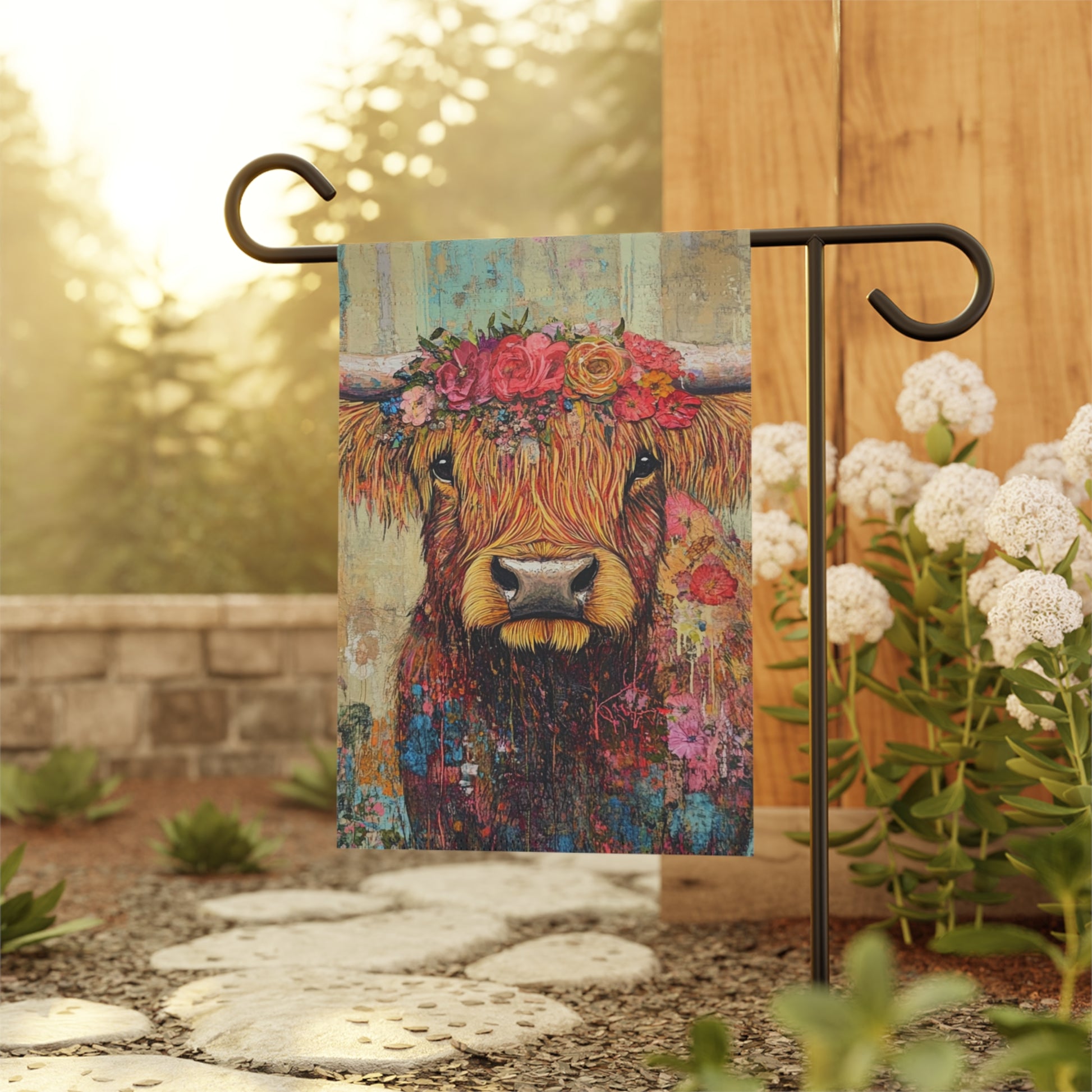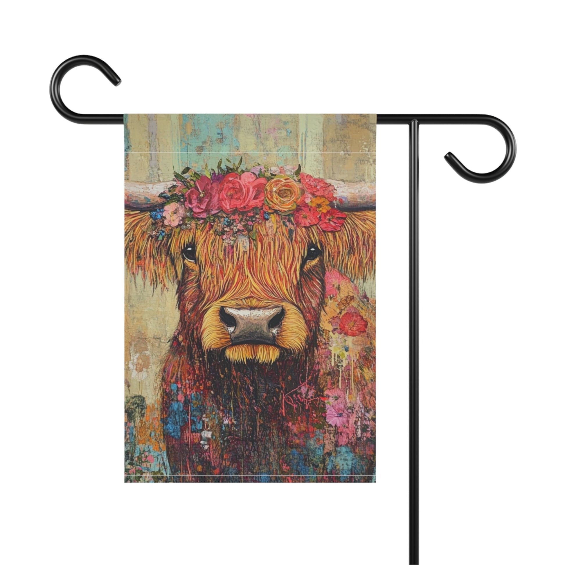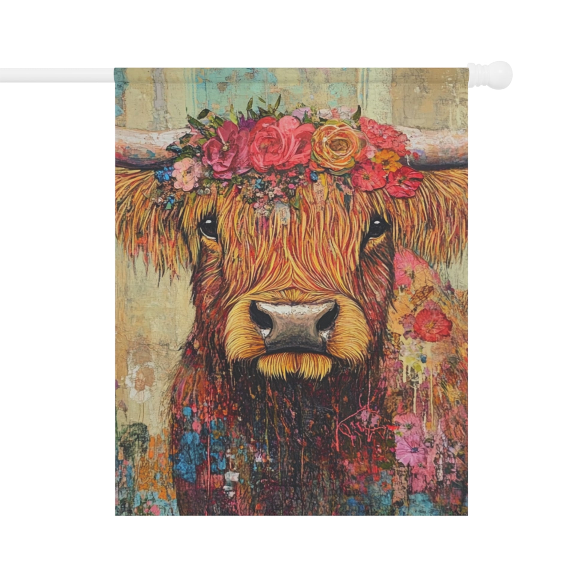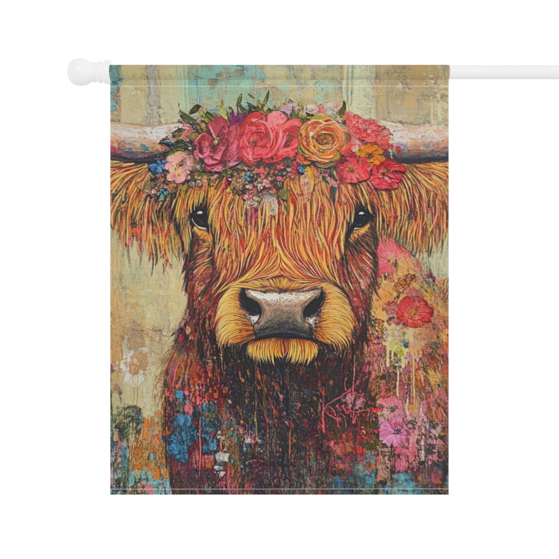 Floral Highland Cow Garden Banner, Outdoor Decor, Farmhouse Style Flag, Ranch Decor, Spring and Summer Decor, Gift for Garden Lovers
