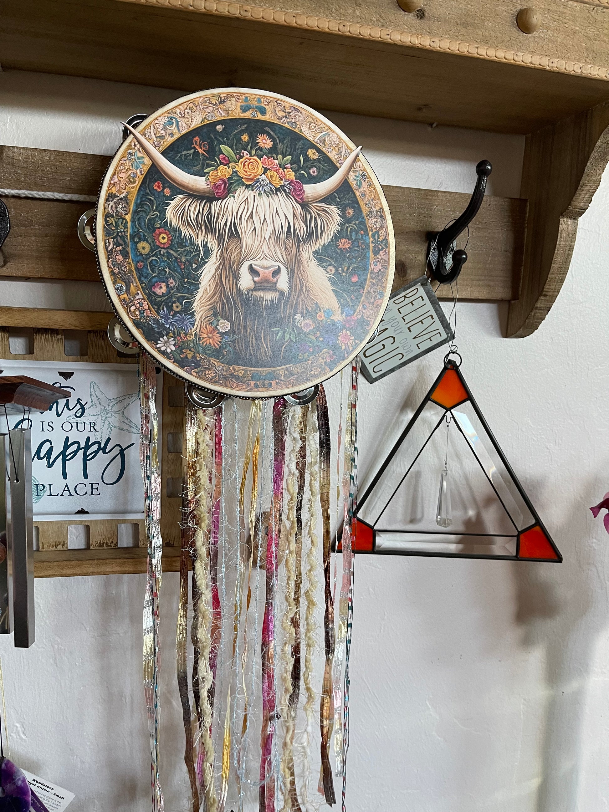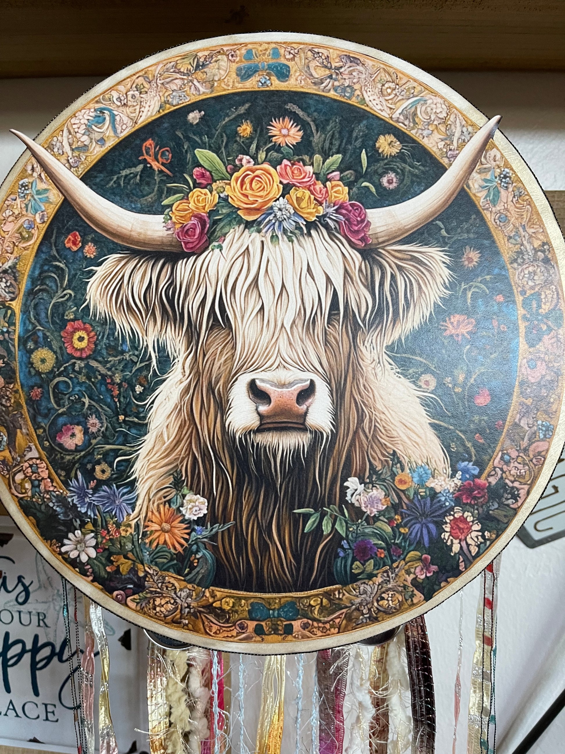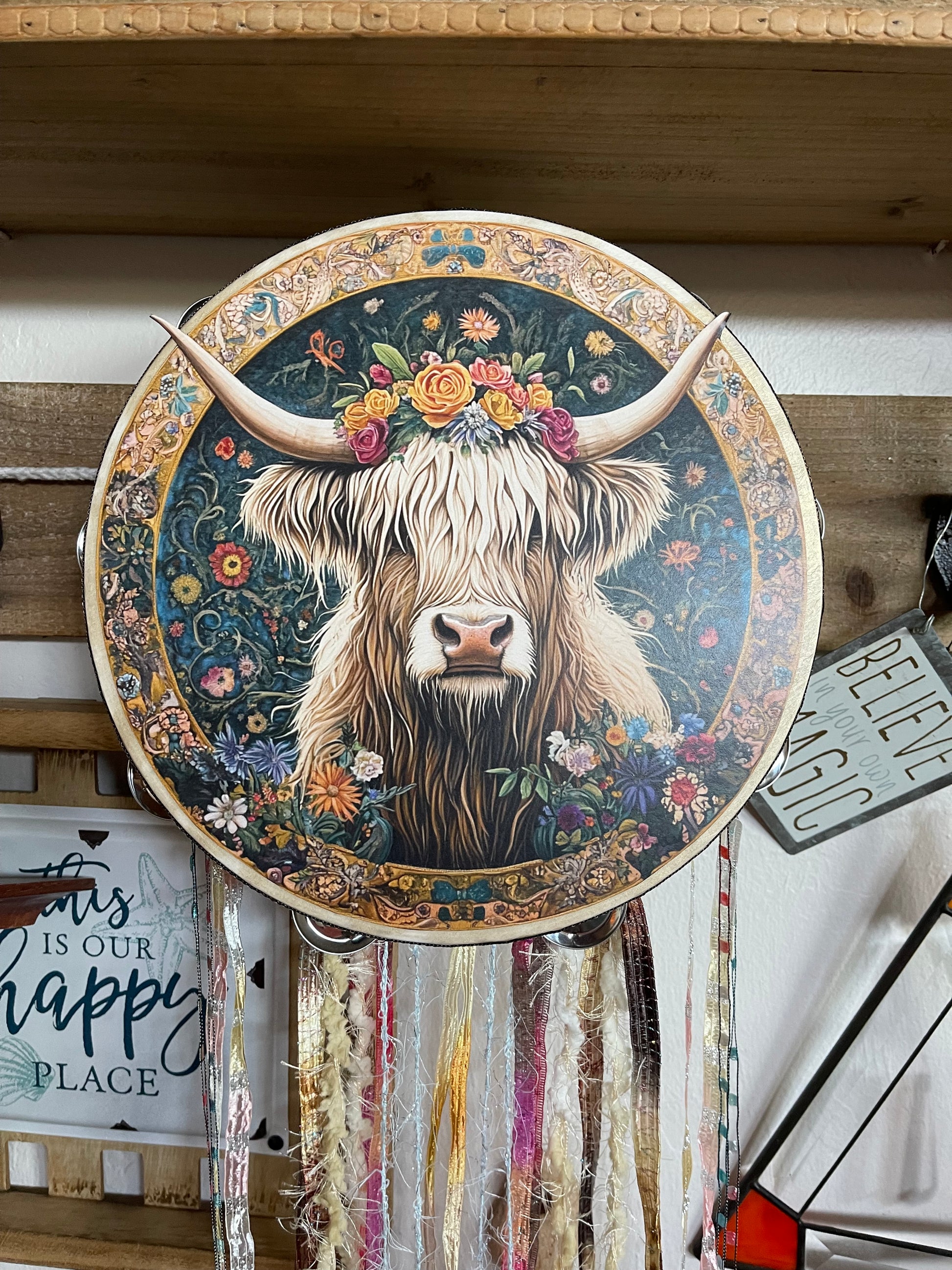 Floral Highland Cow Tambourine and Wall Decor, Farmhouse Style