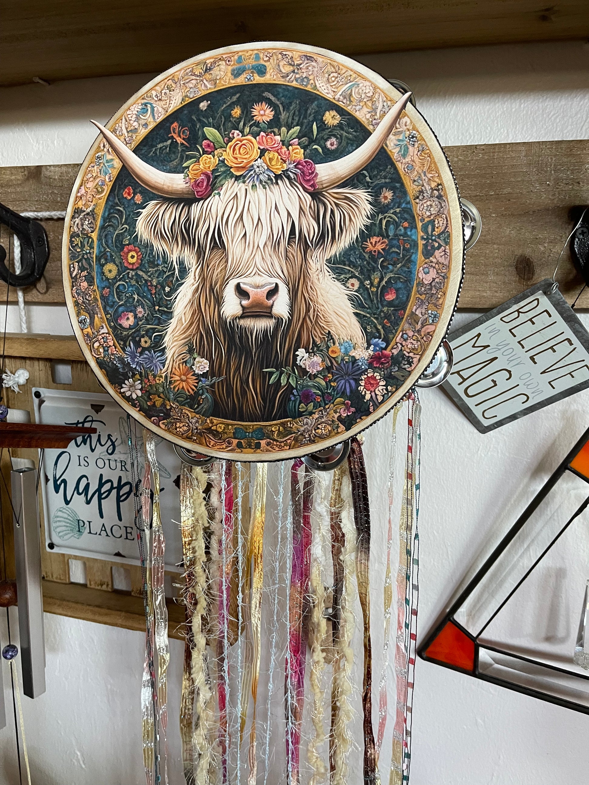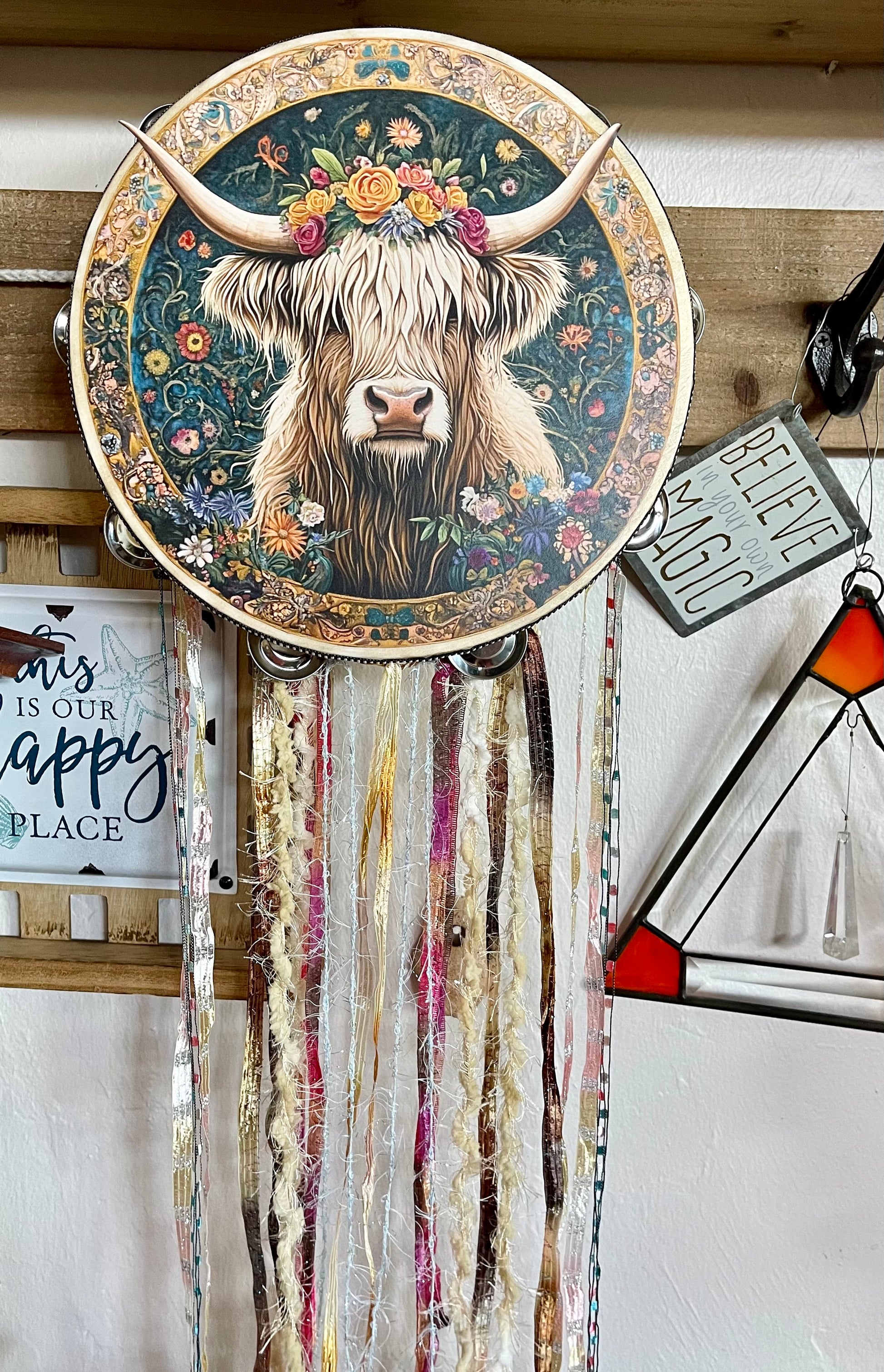 Enhance your space with this vibrant decoupaged floral Highland cow wall tambourine and ribbon decor.