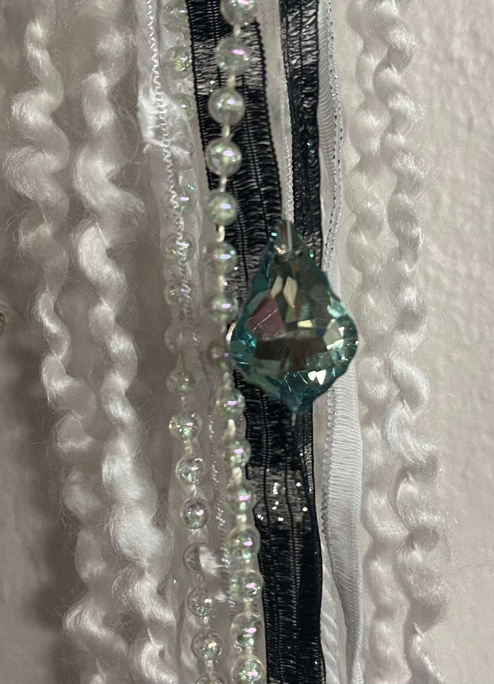 Crafted with meticulous detail, it features a vibrant cascade of quality ribbon and a captivating rainbow glass pendant.