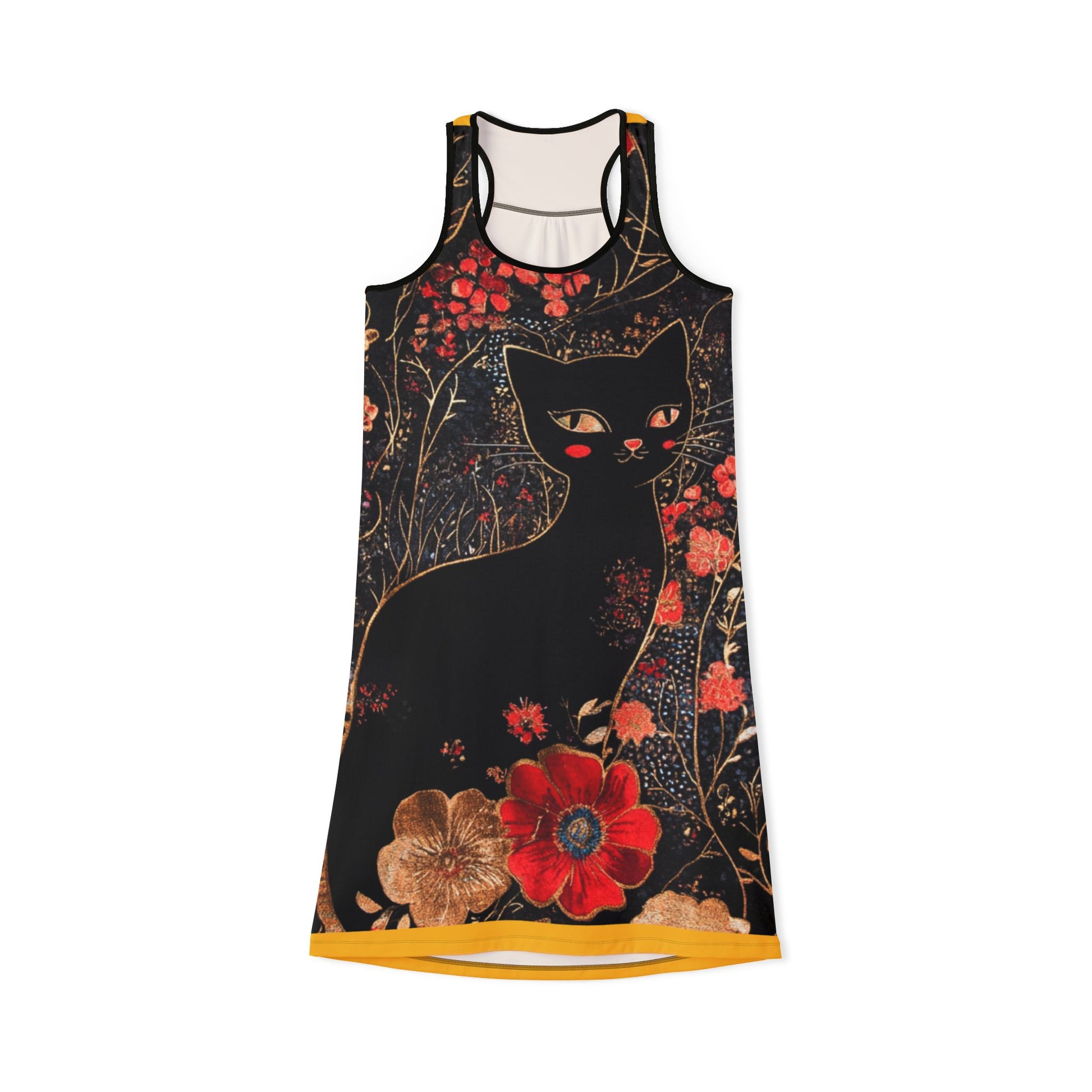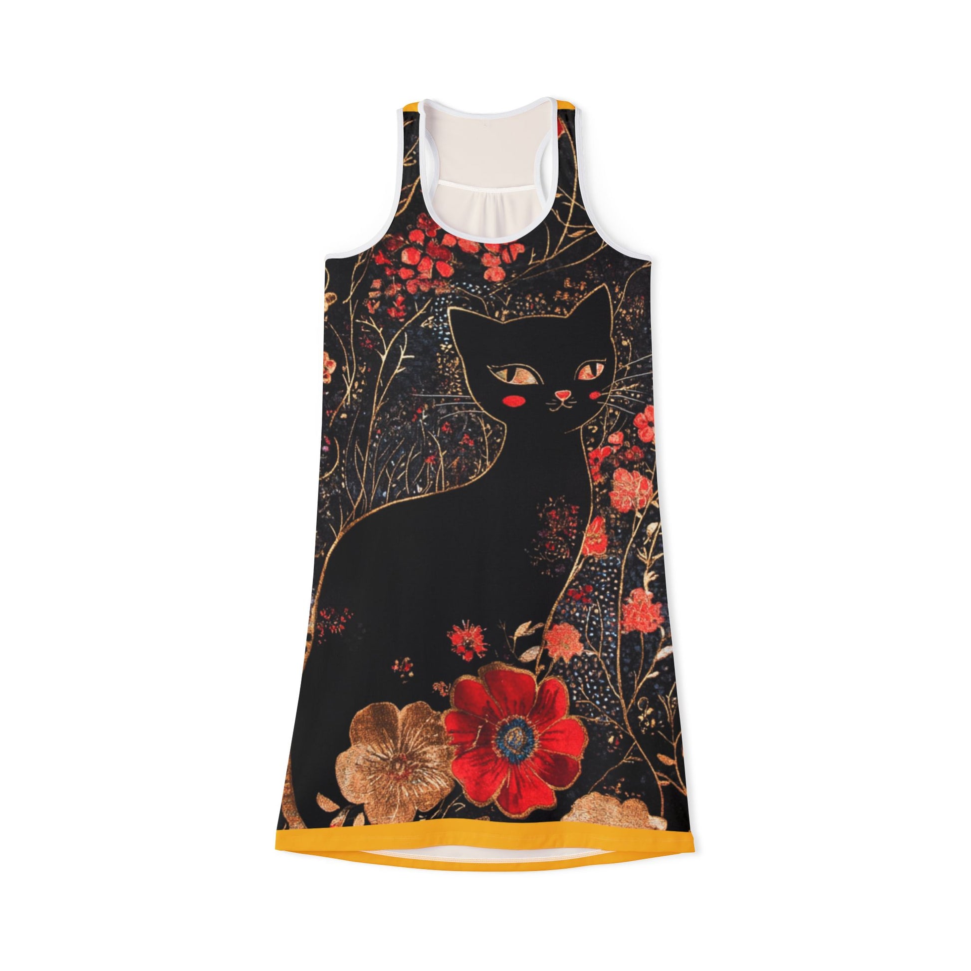 Geisha Black Cat Floral Women's Racerback Dress, Summer Dress, Beachwear, Casual Outfit, Halloween Dress, Gift for Cat Lovers, AOP Design