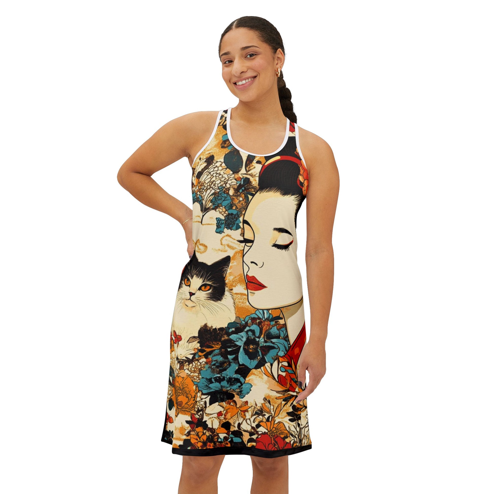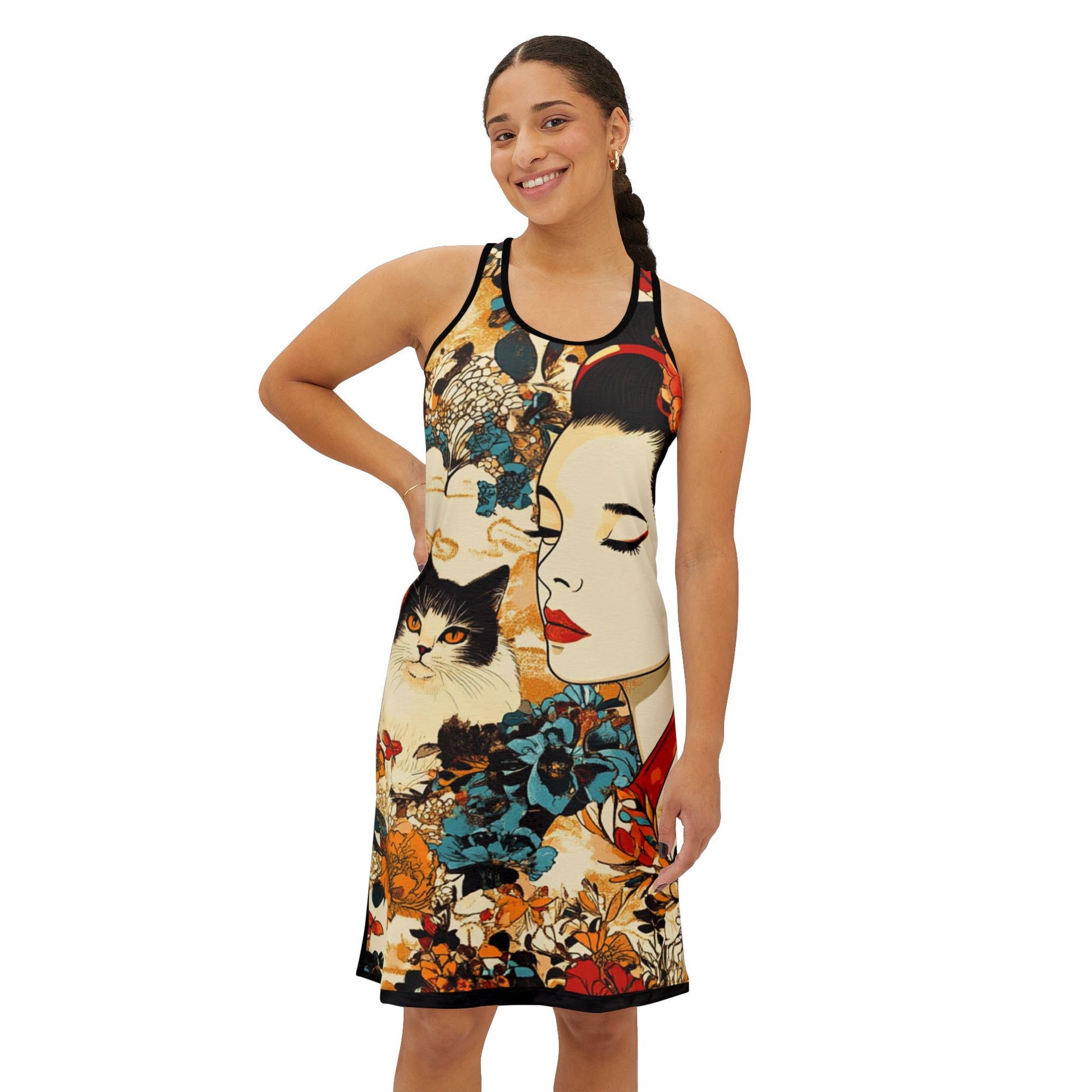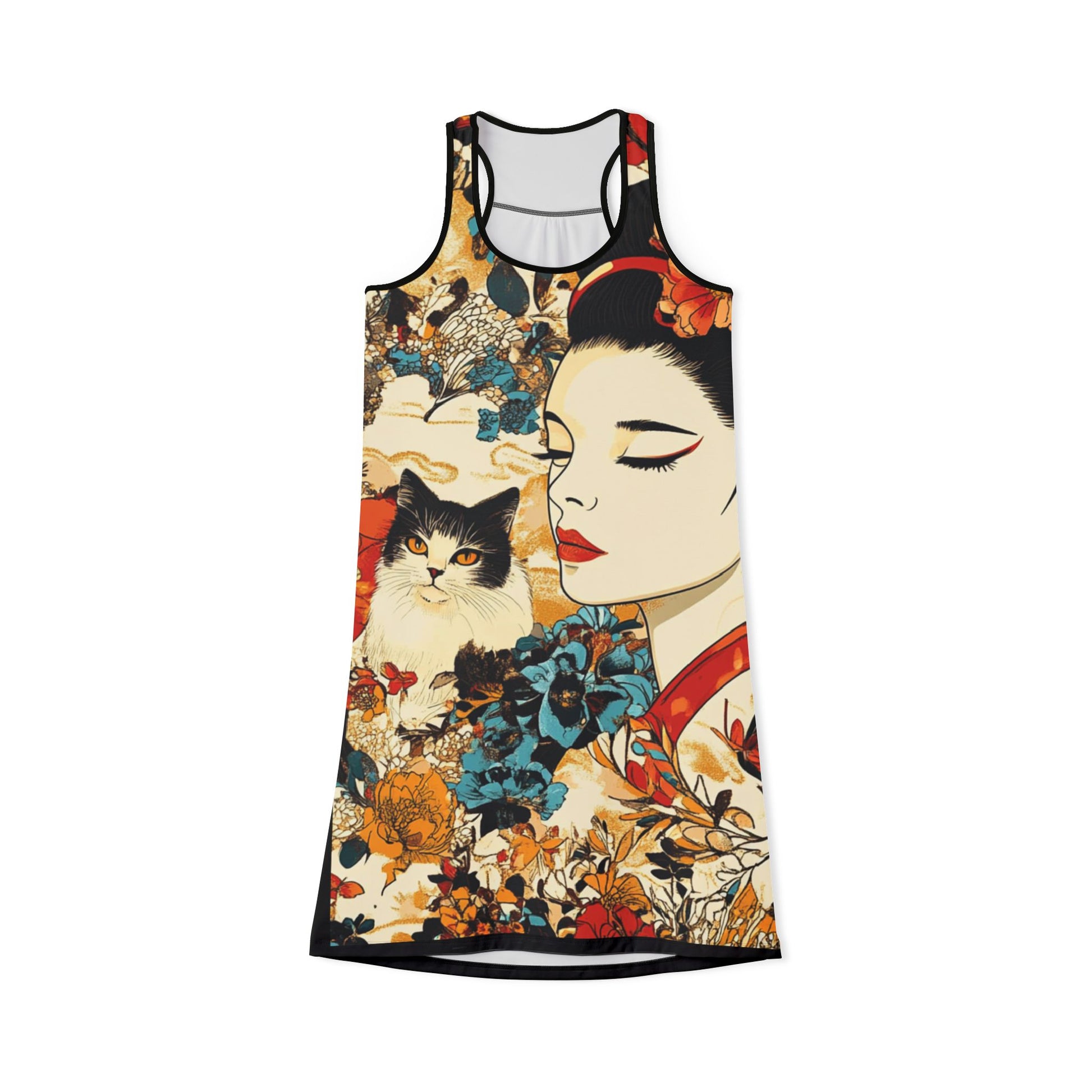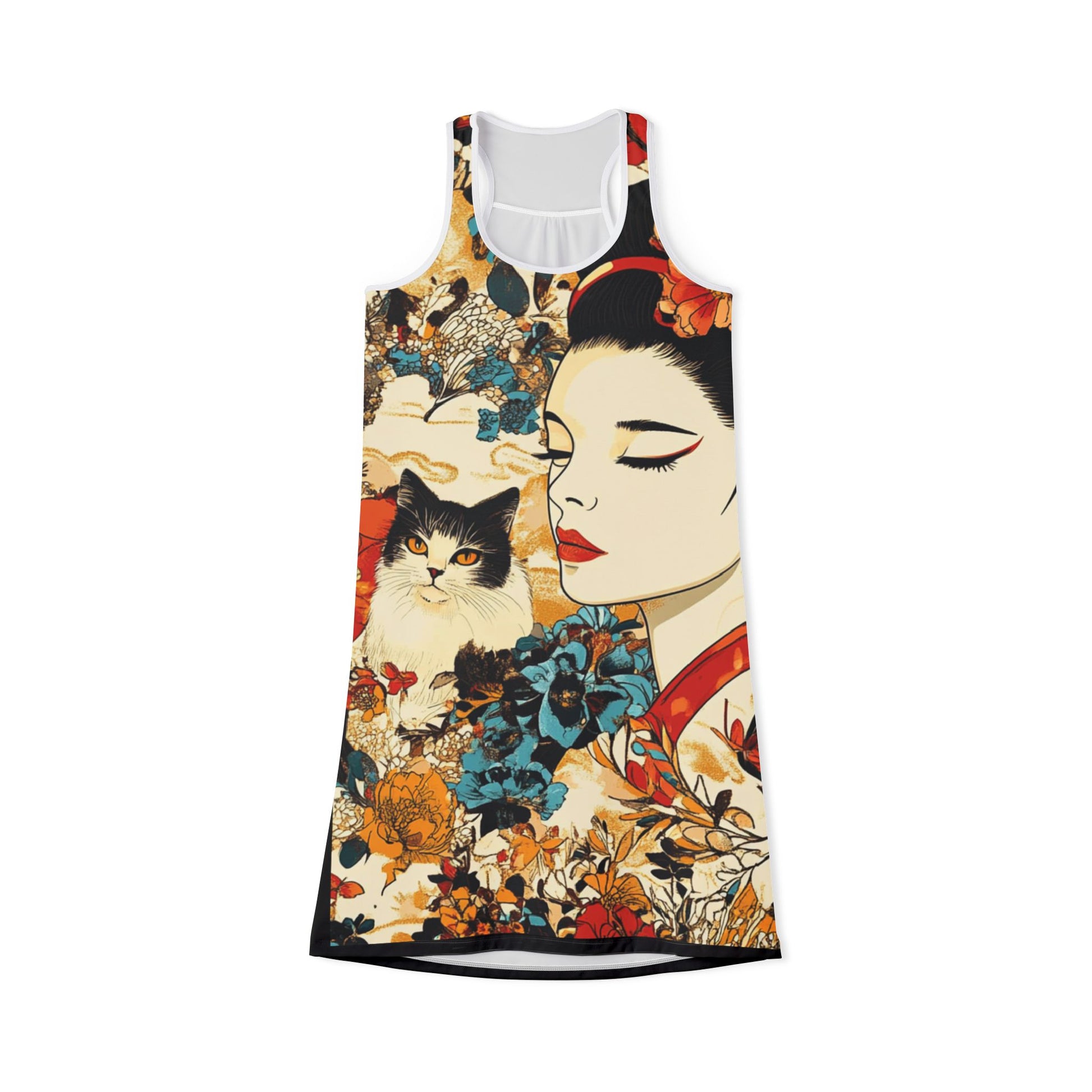 Geisha Cat Elegant Floral Racerback Dress, Bohemian Style, Summer Dress, Casual Outfit, Vintage Aesthetic, Everyday Wear