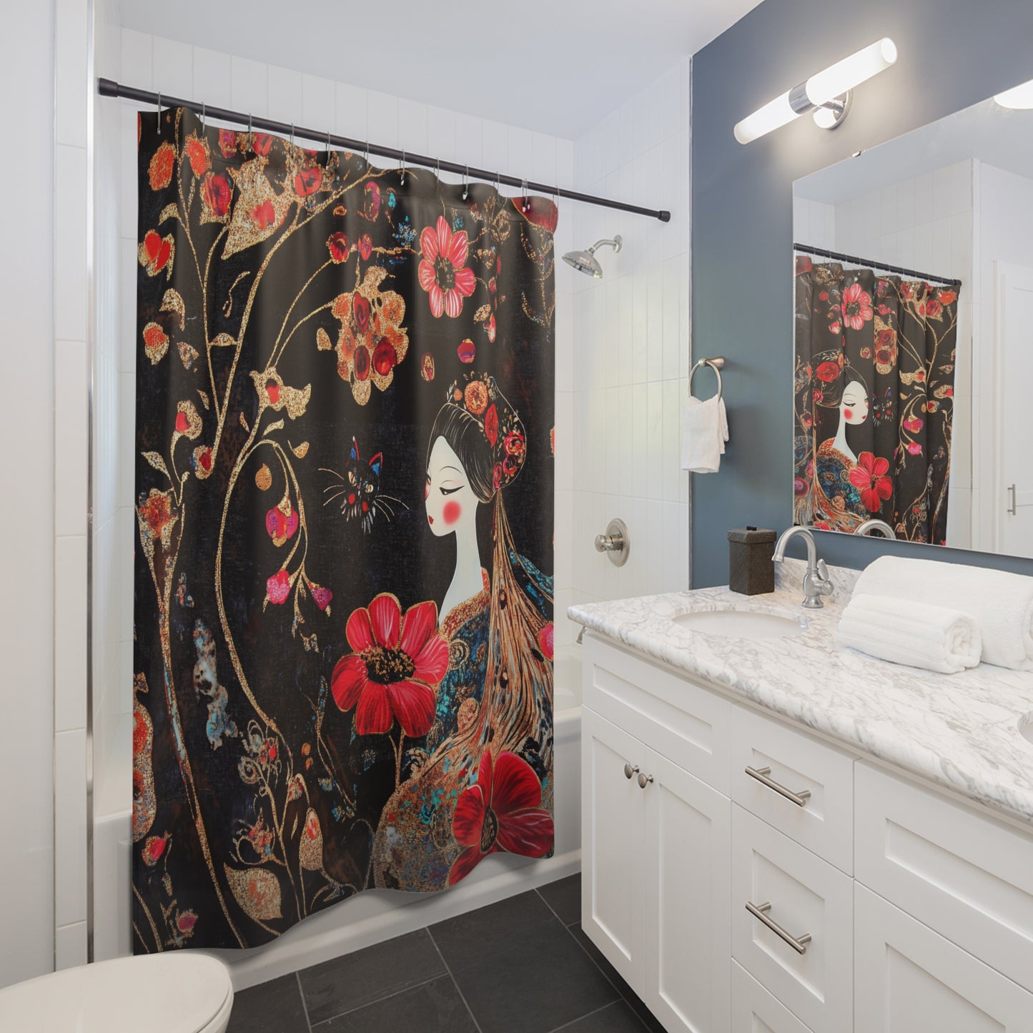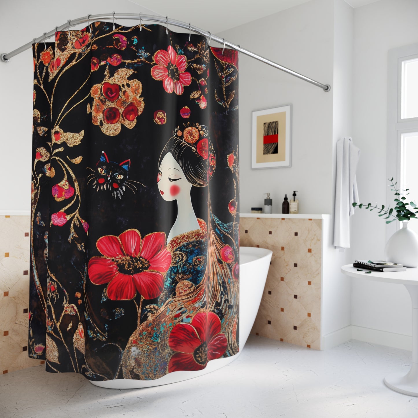 Geisha Cat Shower Curtain, Bohemian Home Decor, Nautical Bathroom Accessory, Unique Gift for Her, Zen Oasis Decoration