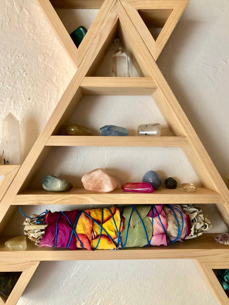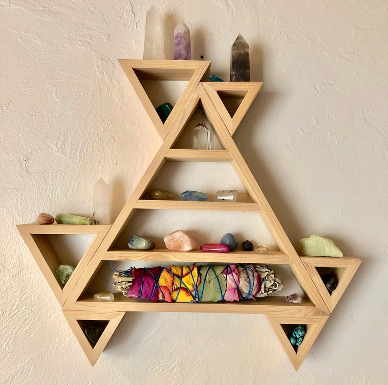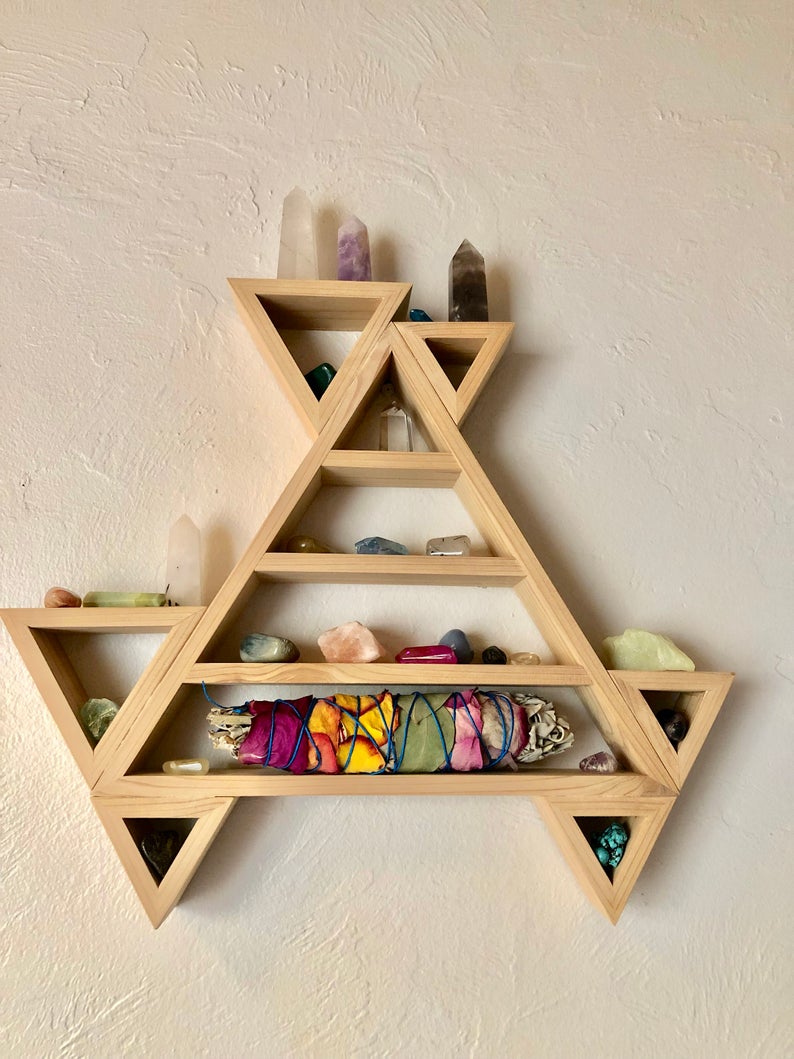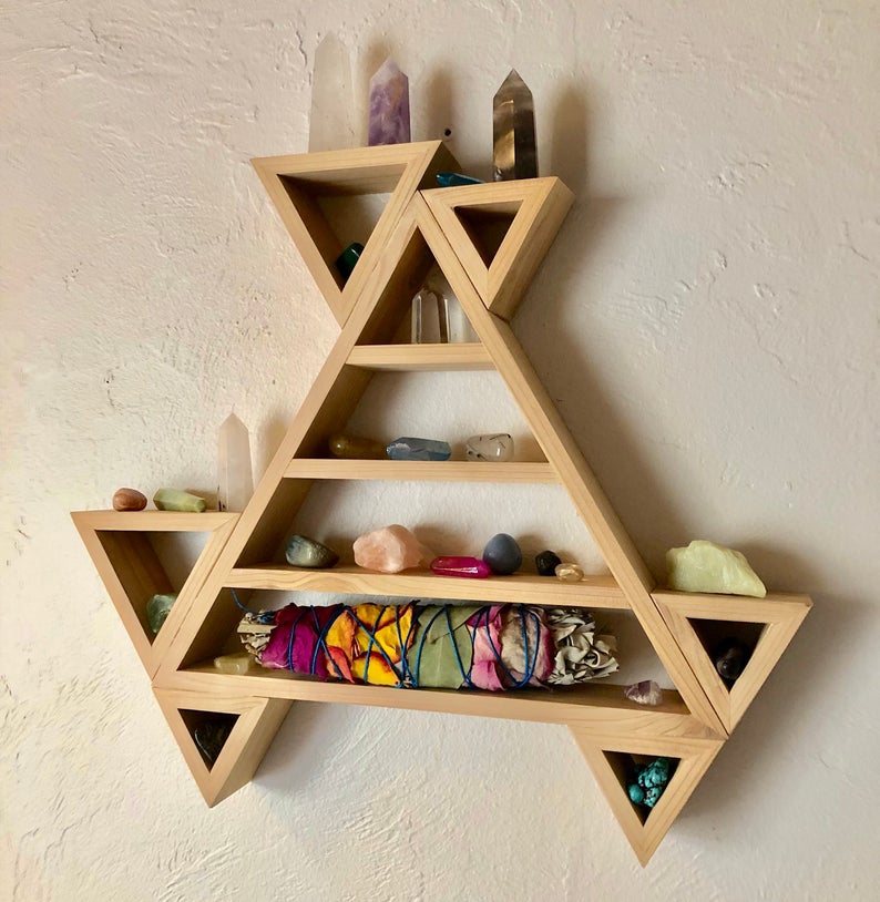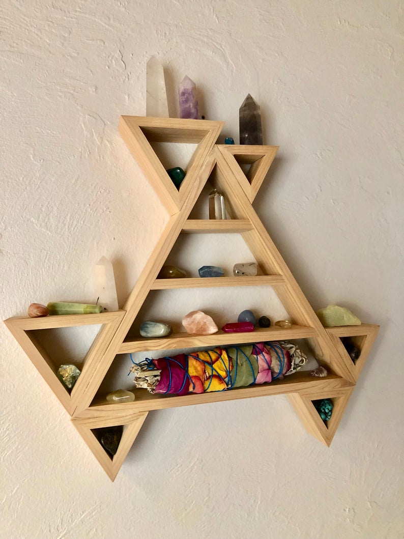 This listing is for one beautiful all natural cedar triangle shelf for displaying crystals and gemstones. These shelves are individually handcrafted and take many hours to make. There are many shelves out there where they overlay the pieces... all of my shelves are cut precisely to come to a perfect point on top.