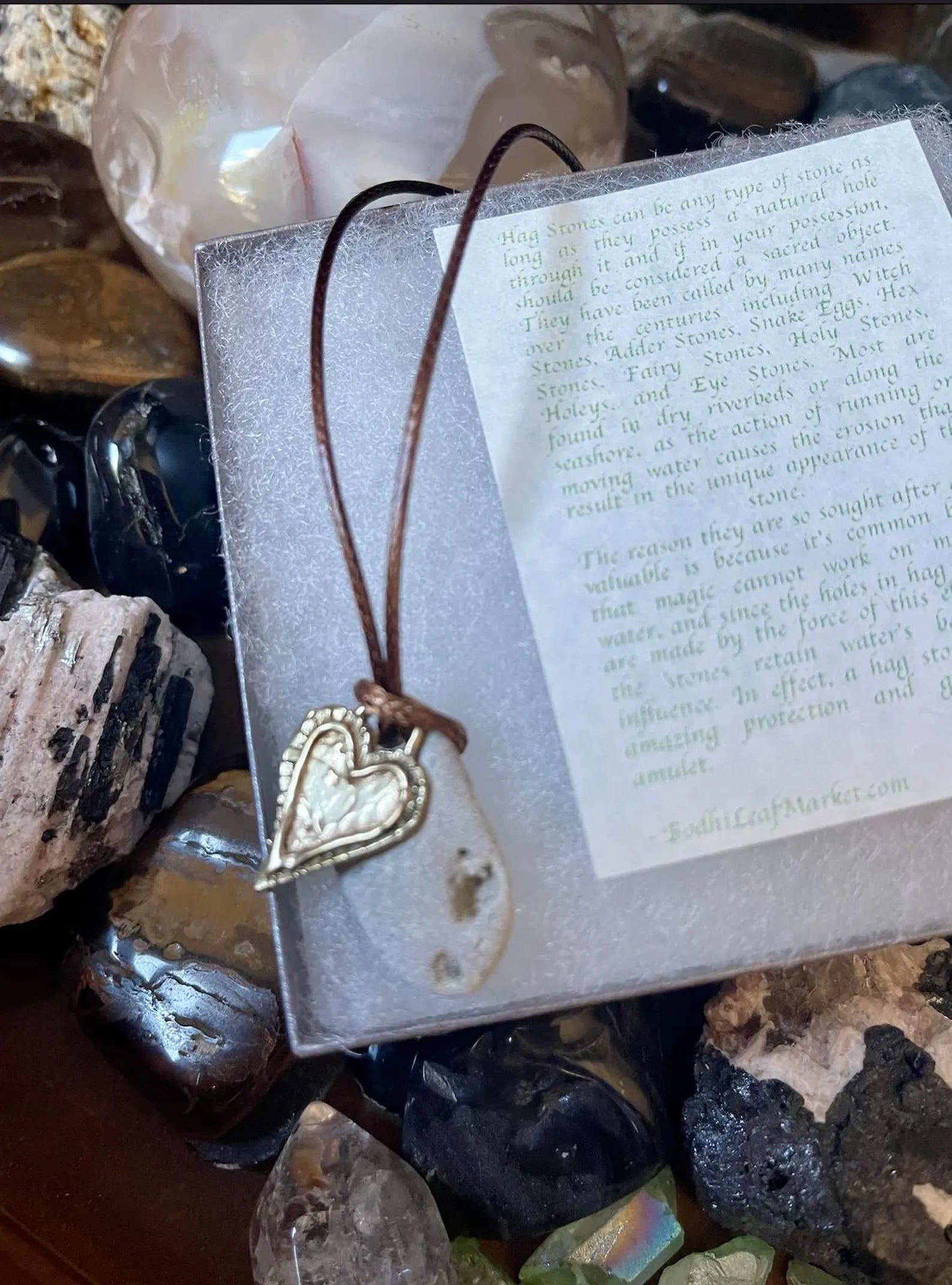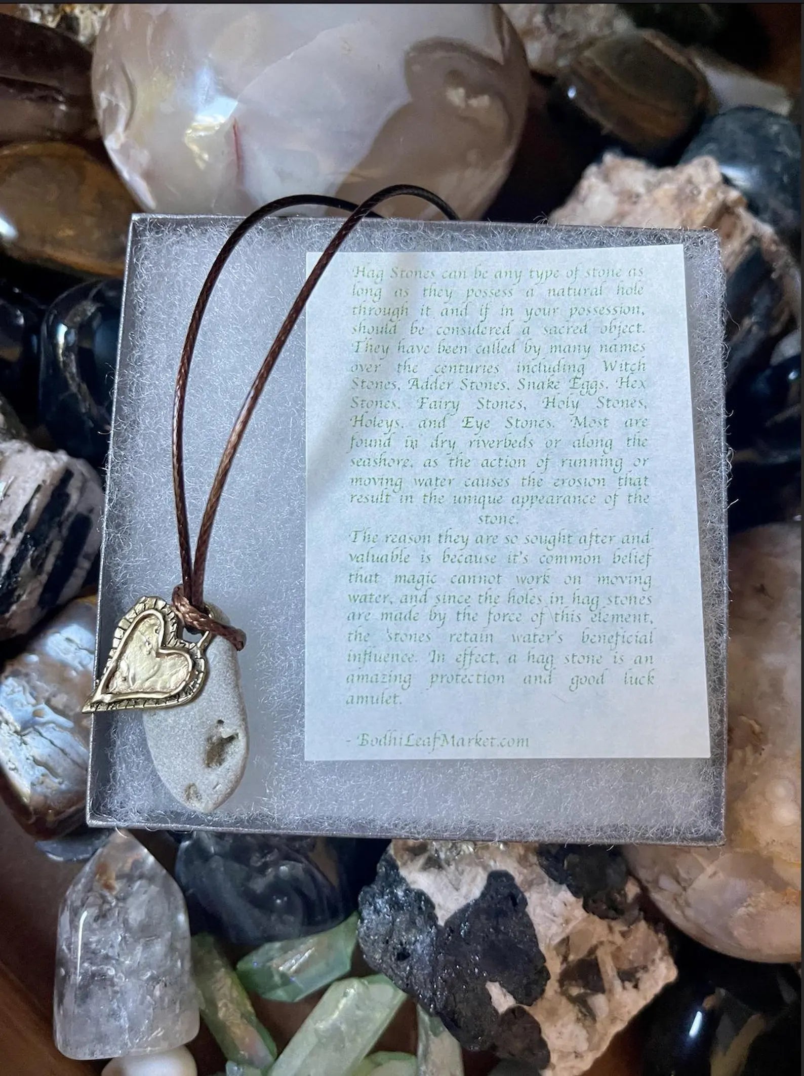 This stone measures approx 1" across and the necklace measures approx 16" with a 2 inch chain extender. You will receive the exact stone and artisan bronze heart in this picture. Comes gift boxed with a brief description of the magical properties of the hagstone.