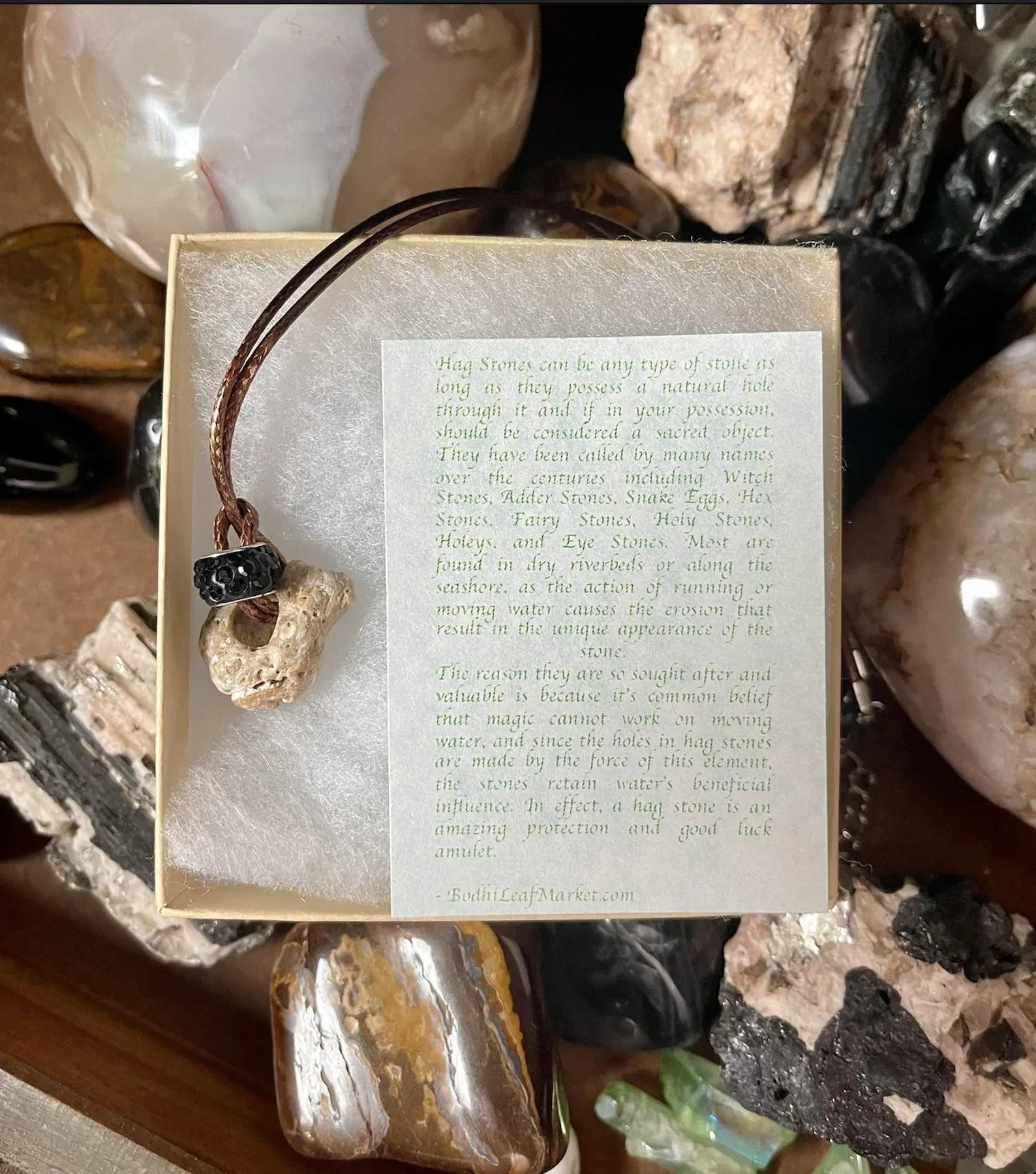 Hag Stones can be any type of stone as long as they possess a natural hole through it and if in your possession, should be considered a sacred object. They have been called by many names over the centuries including Witch Stones, Adder Stones, Snake Eggs, Hex Stones, Fairy Stones, Holy Stones, Holeys, and Eye Stones. Most are found in dry riverbeds or along the seashore, as the action of running or moving water causes the erosion that result in the unique appearance of the stone.