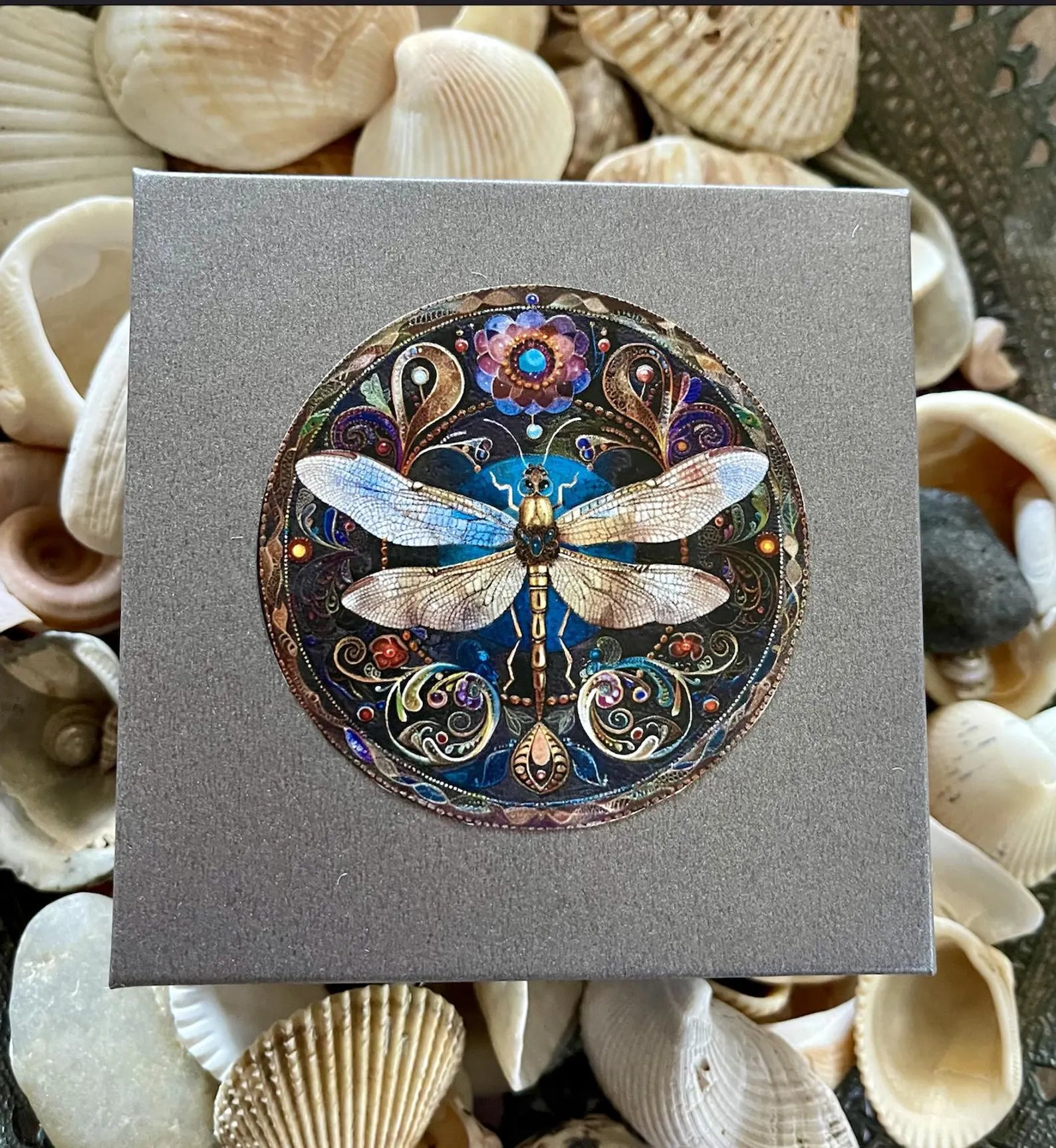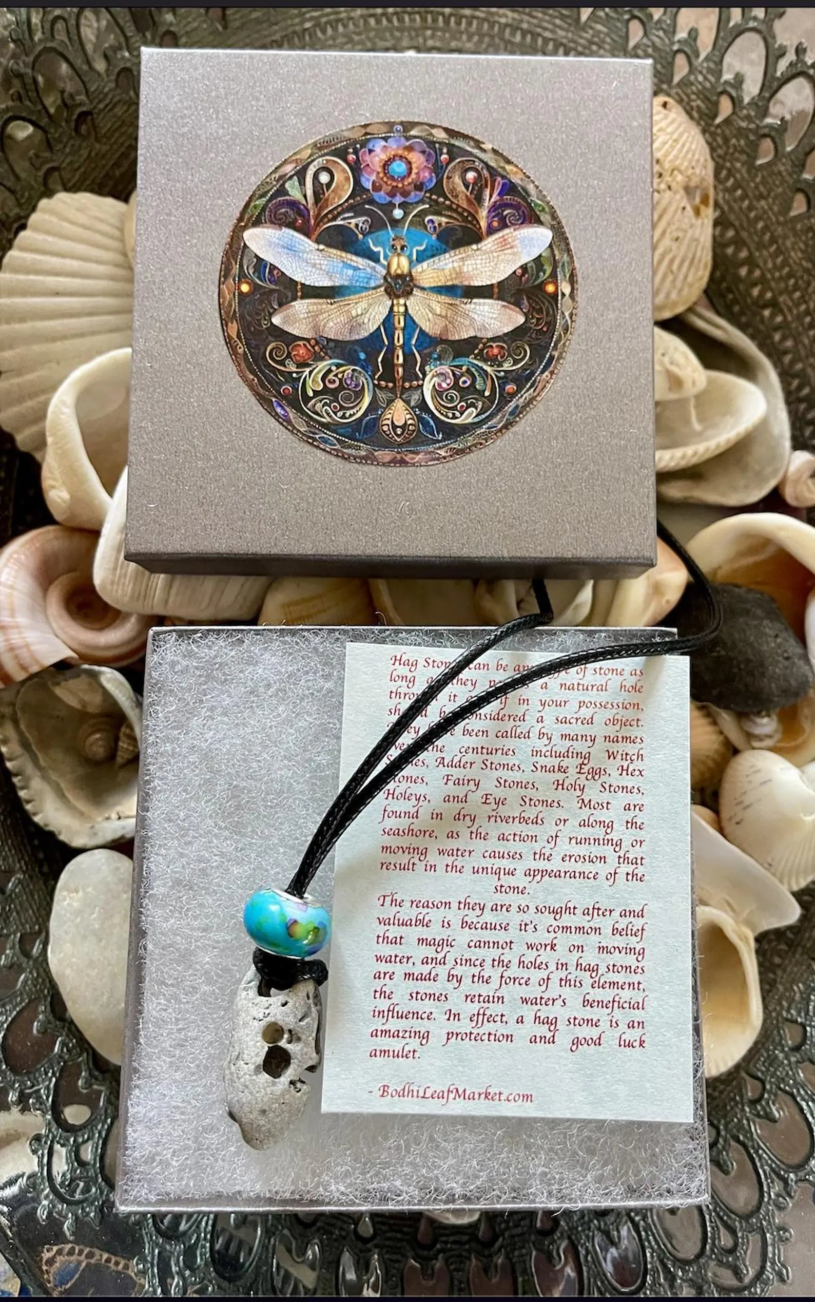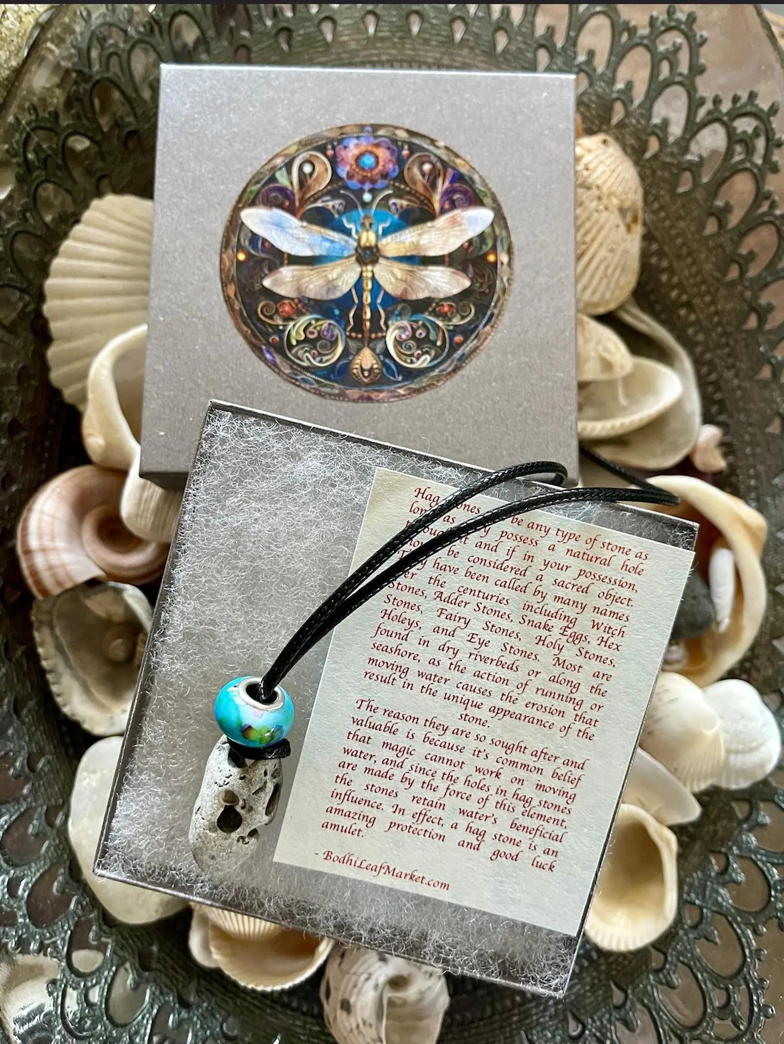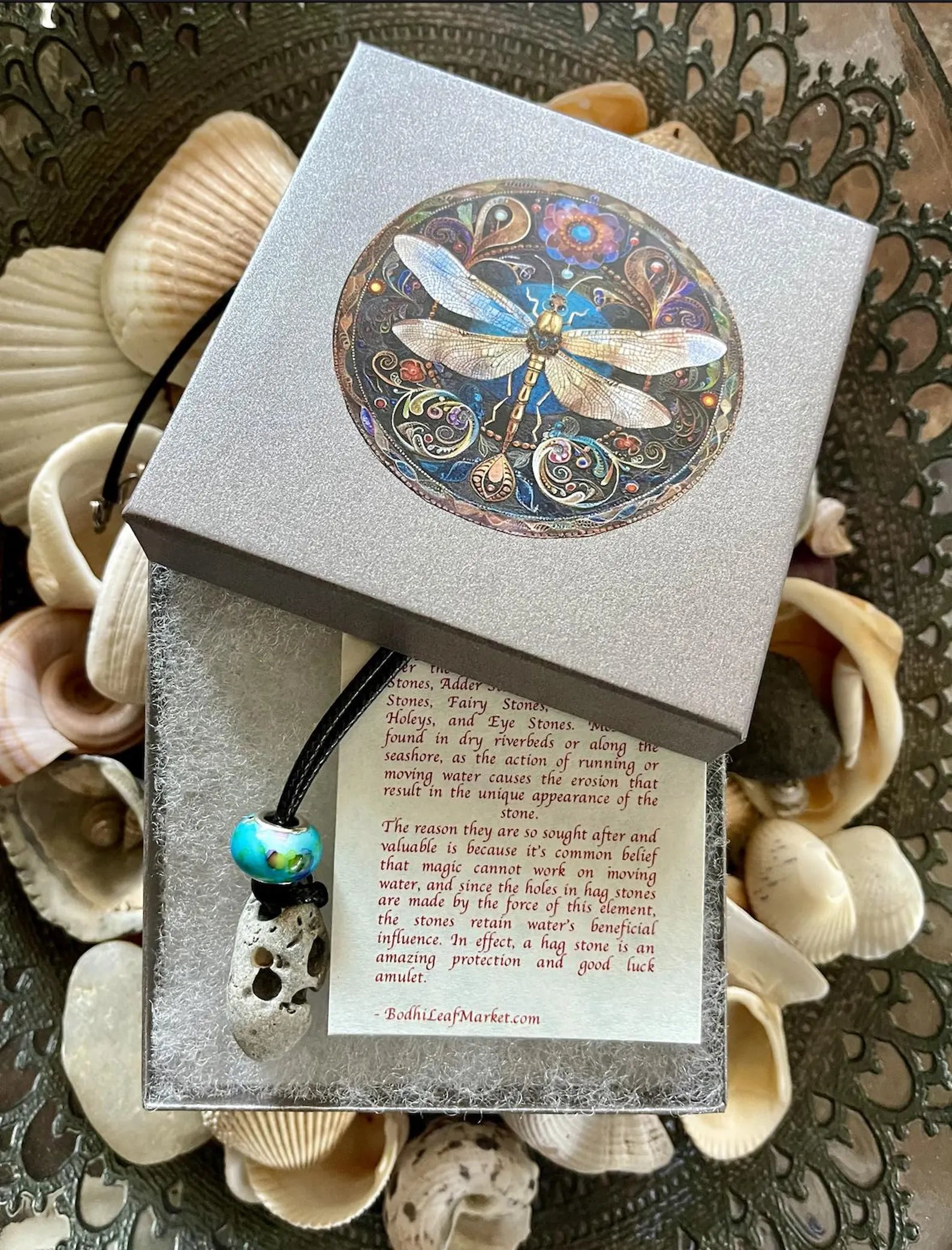 Gift Boxed Mystical Dragonfly Hag Stone and Watercolor Bead, Bodhi Jewelry, USA