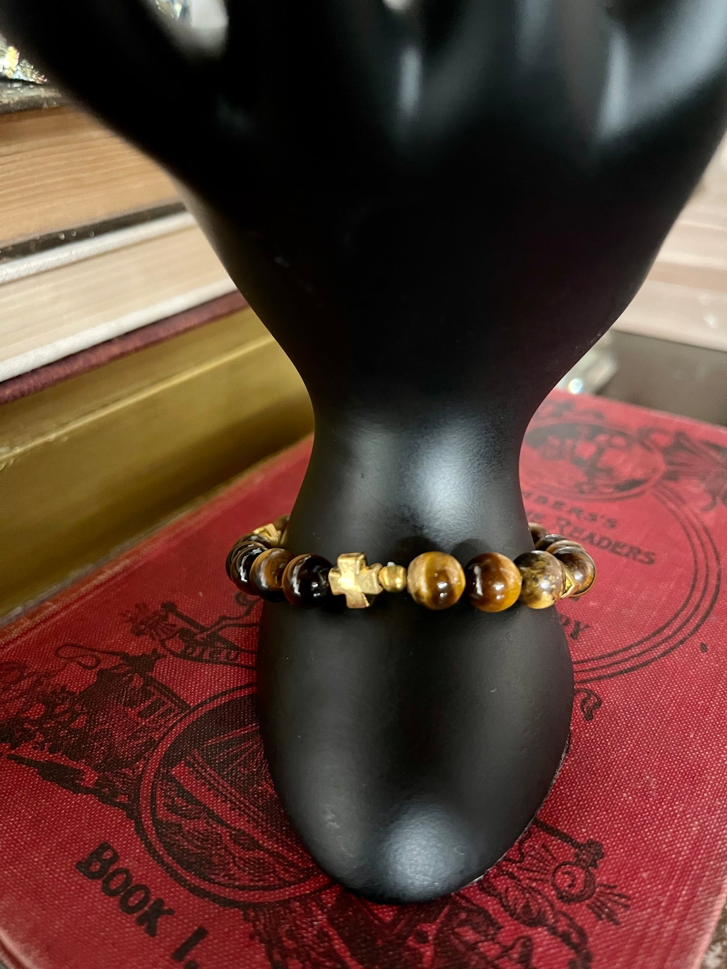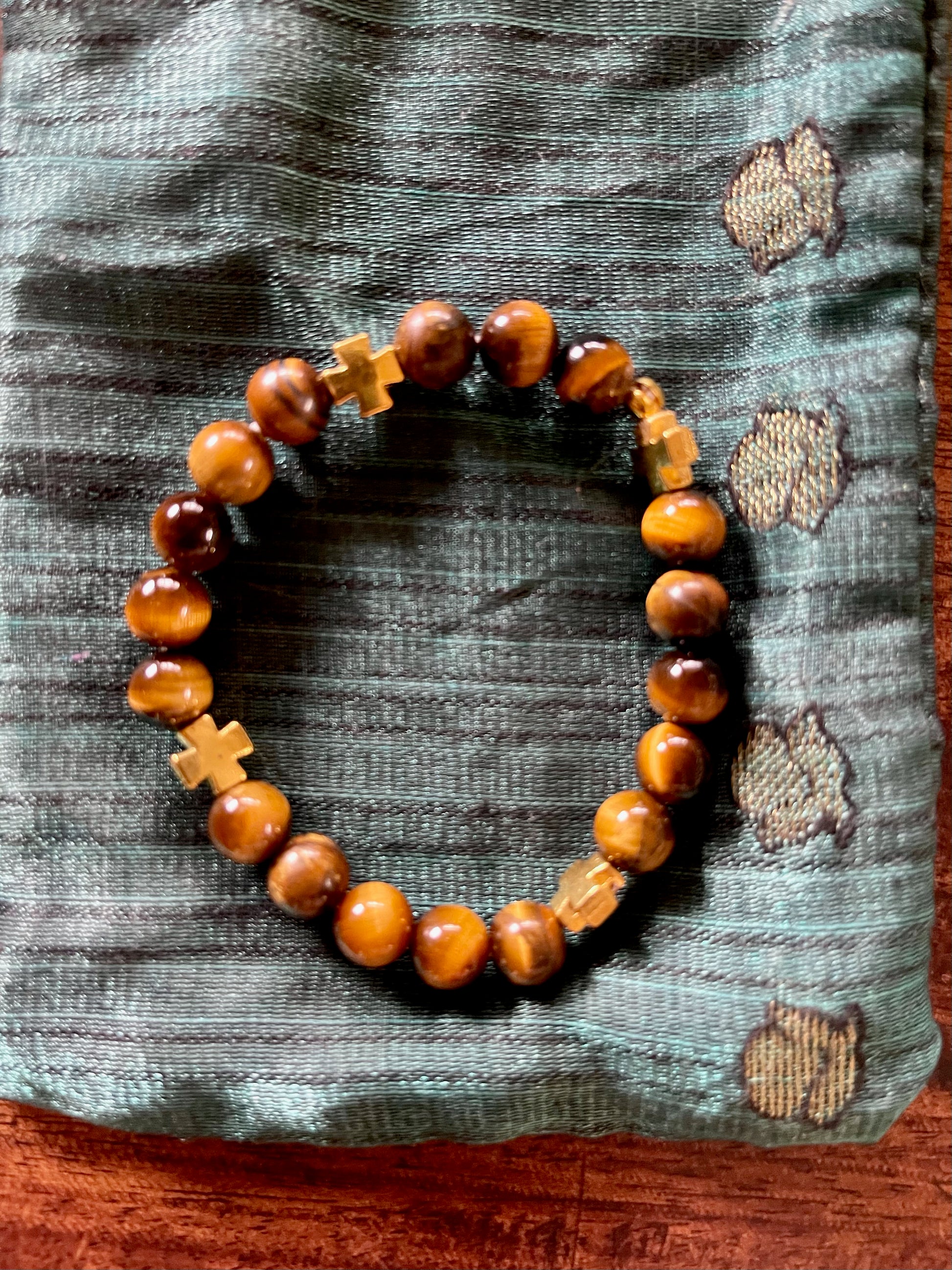 It includes real tiger's eye beads and gold metal crosses.