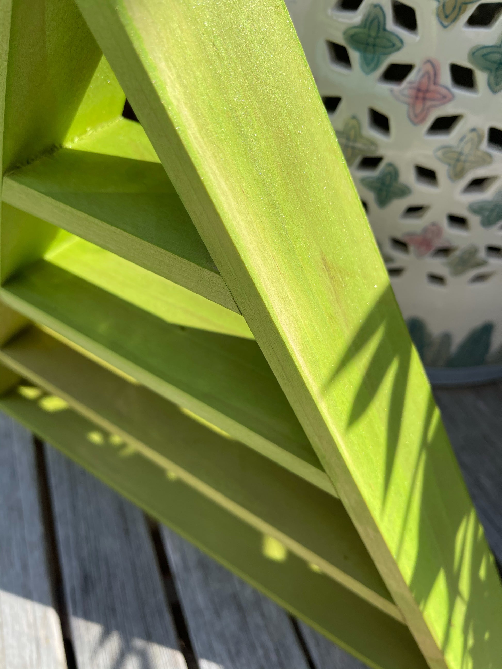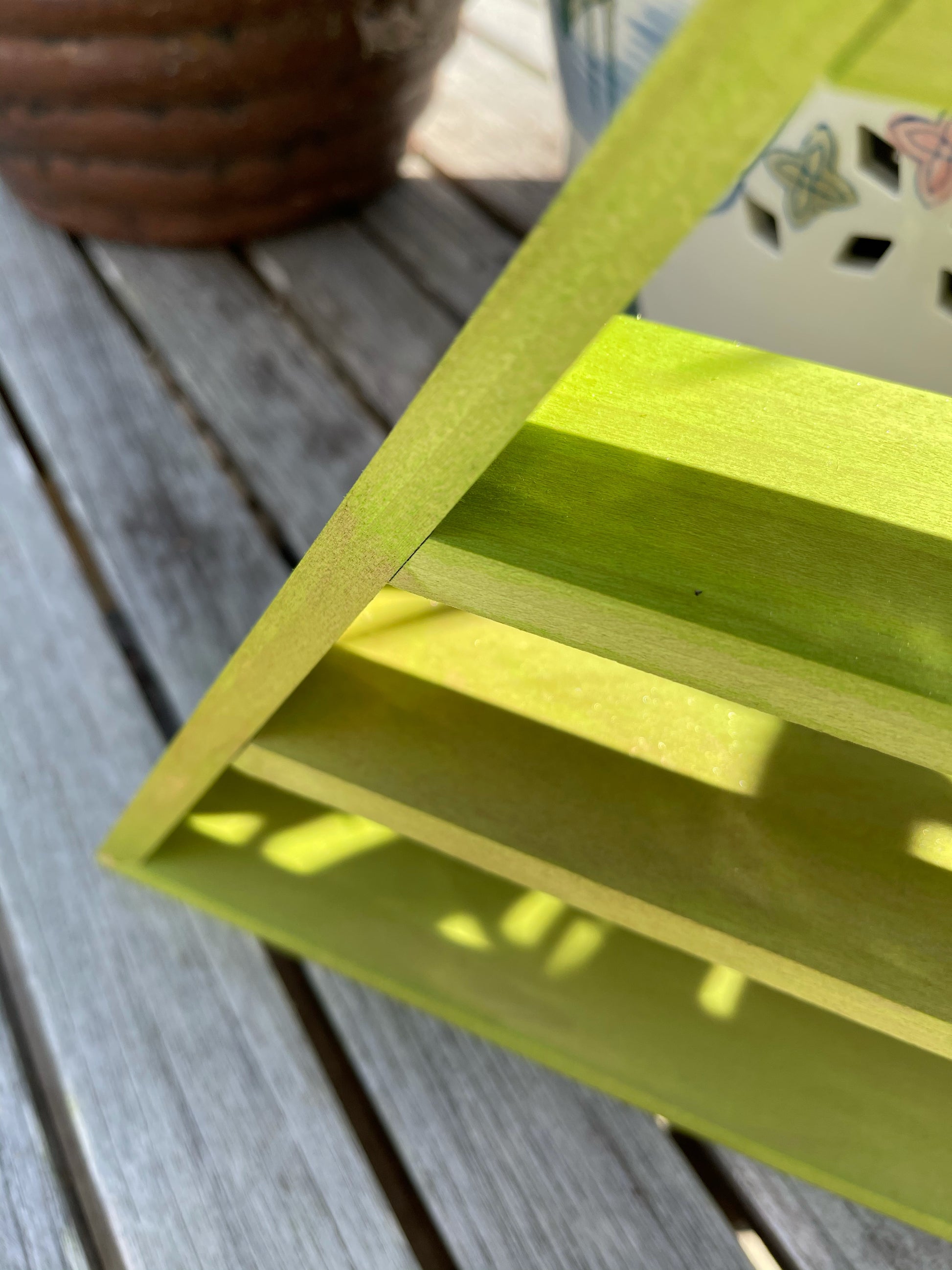 This particular shelf is done in a new verdi wash which has hints of green, yellows, gold and copper. Gorgeous in the sunlight and quite possibly a new favorite of mine!