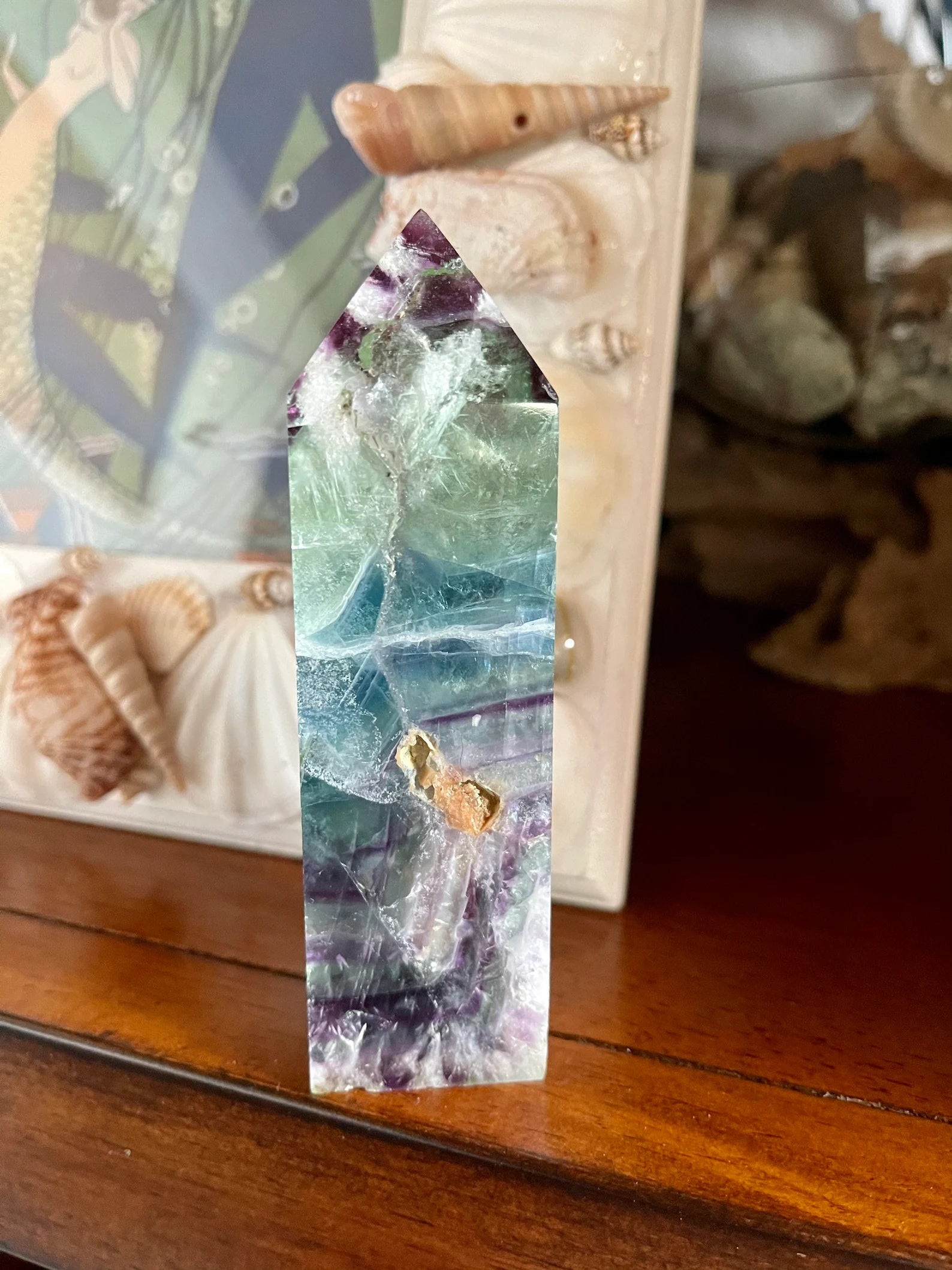 Multi-colored or rainbow fluorite cleanses one’s energy fields on all levels as well as connects the crown, third eye, throat, solar plexus and heart chakras.