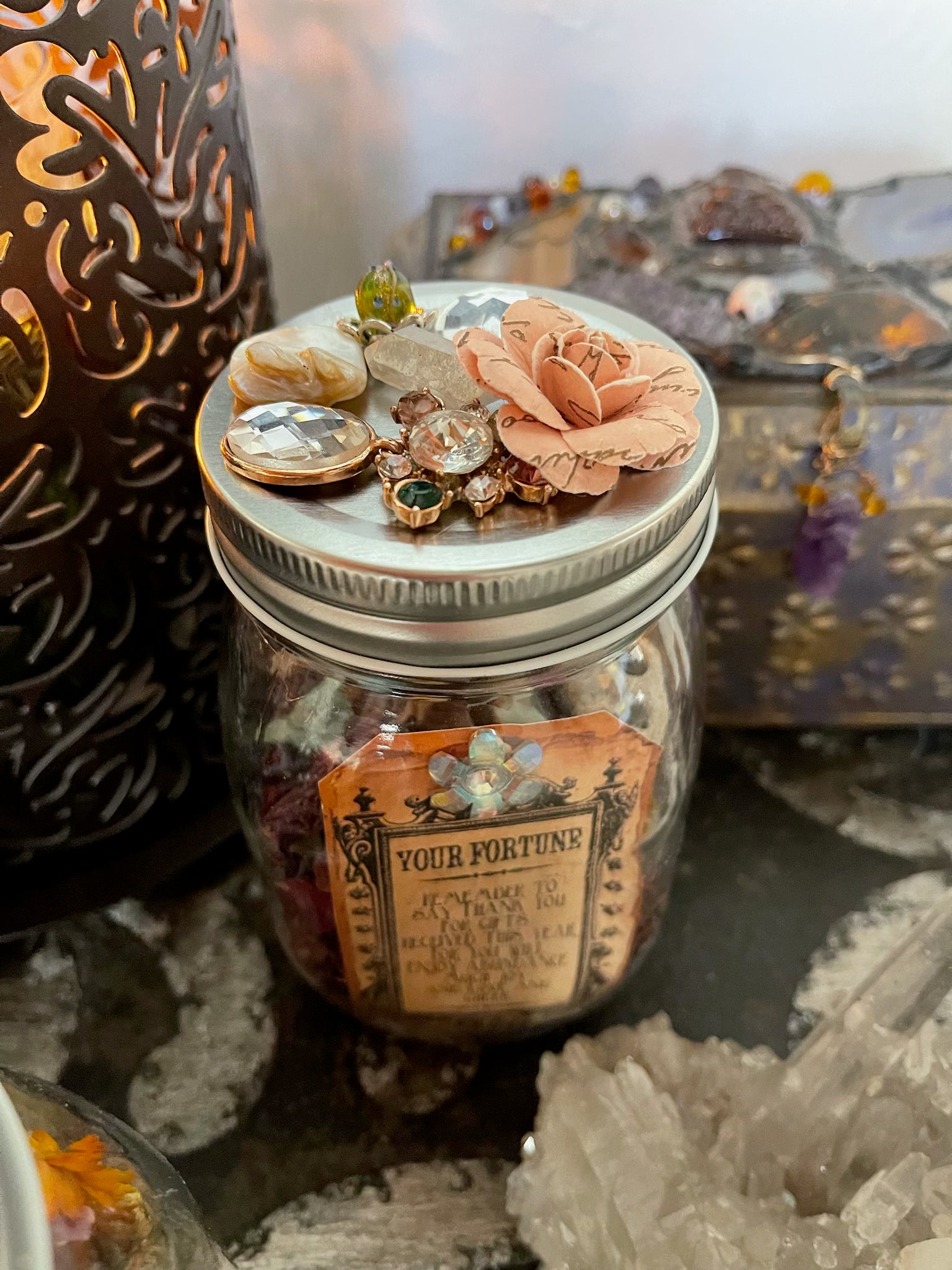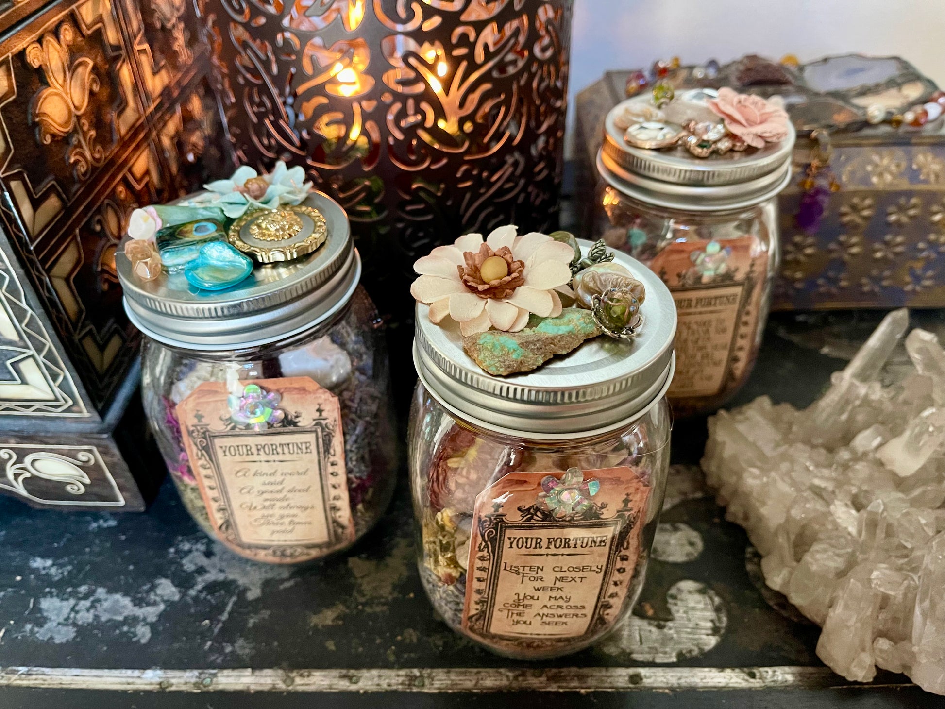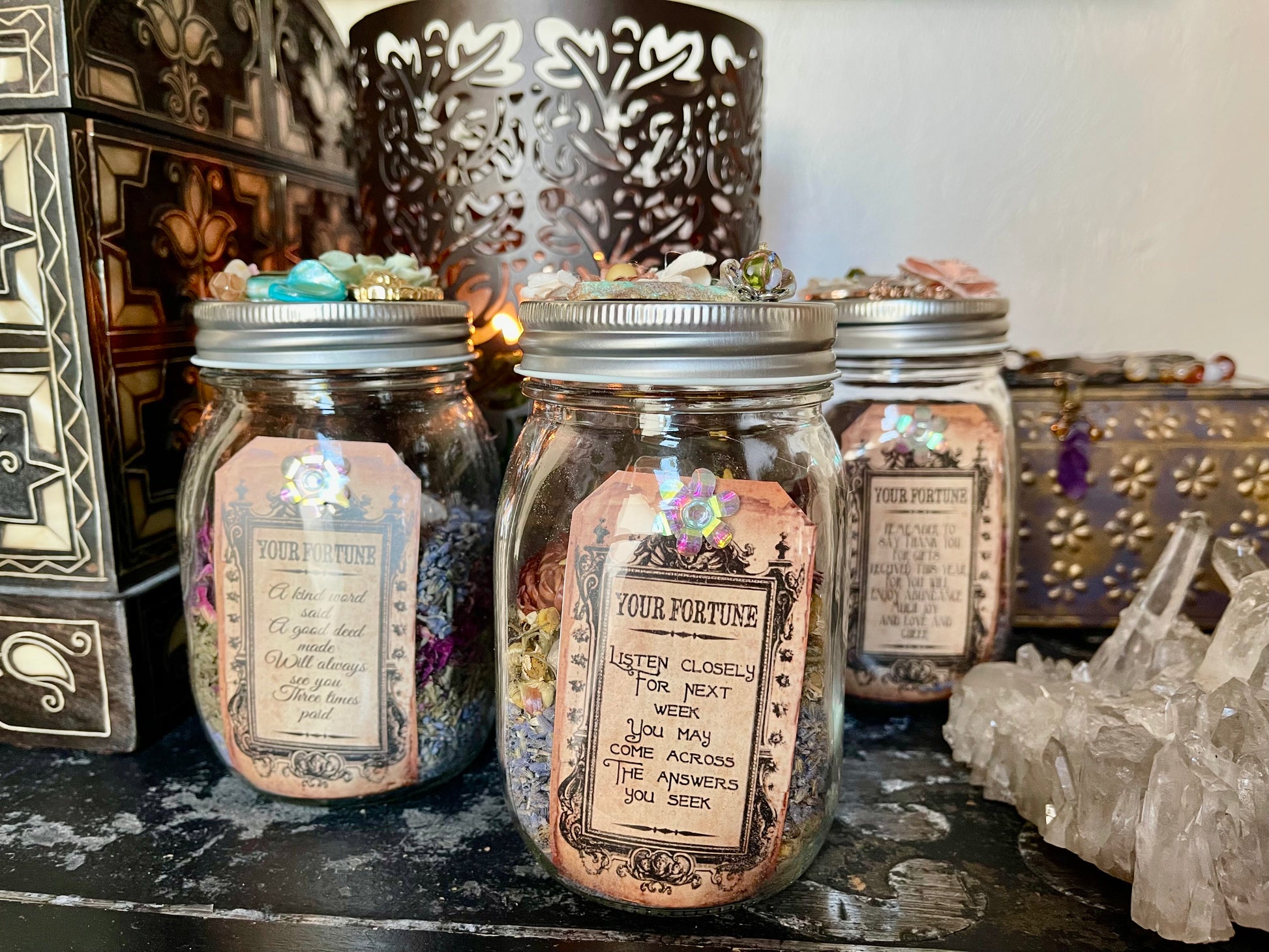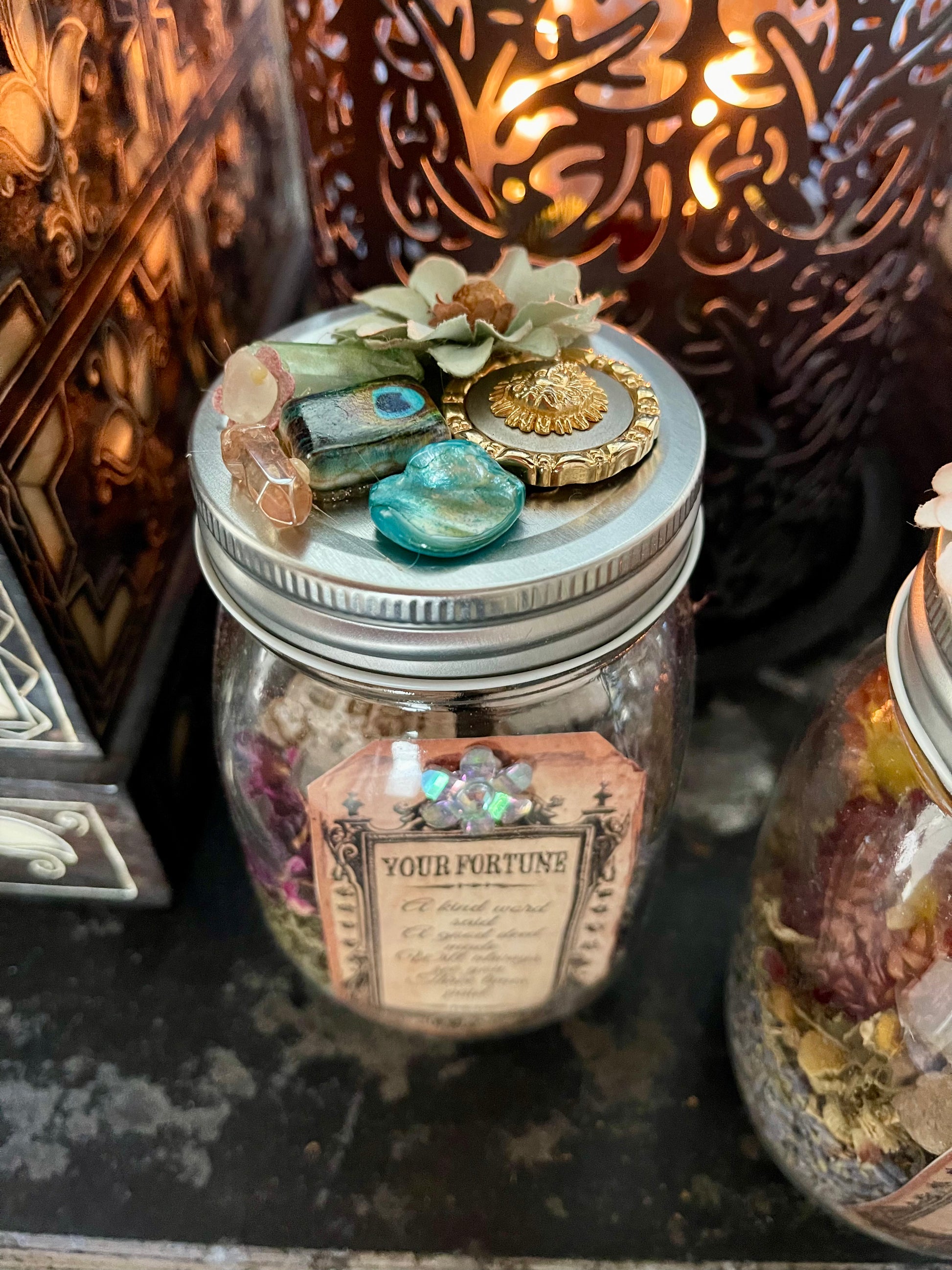 These magic jars are a fun and lighthearted way to give yourself or loved one that little life boost. Made with 100% organic herbs and resins and cleansed crystals, this will look and smell wonderful for years.