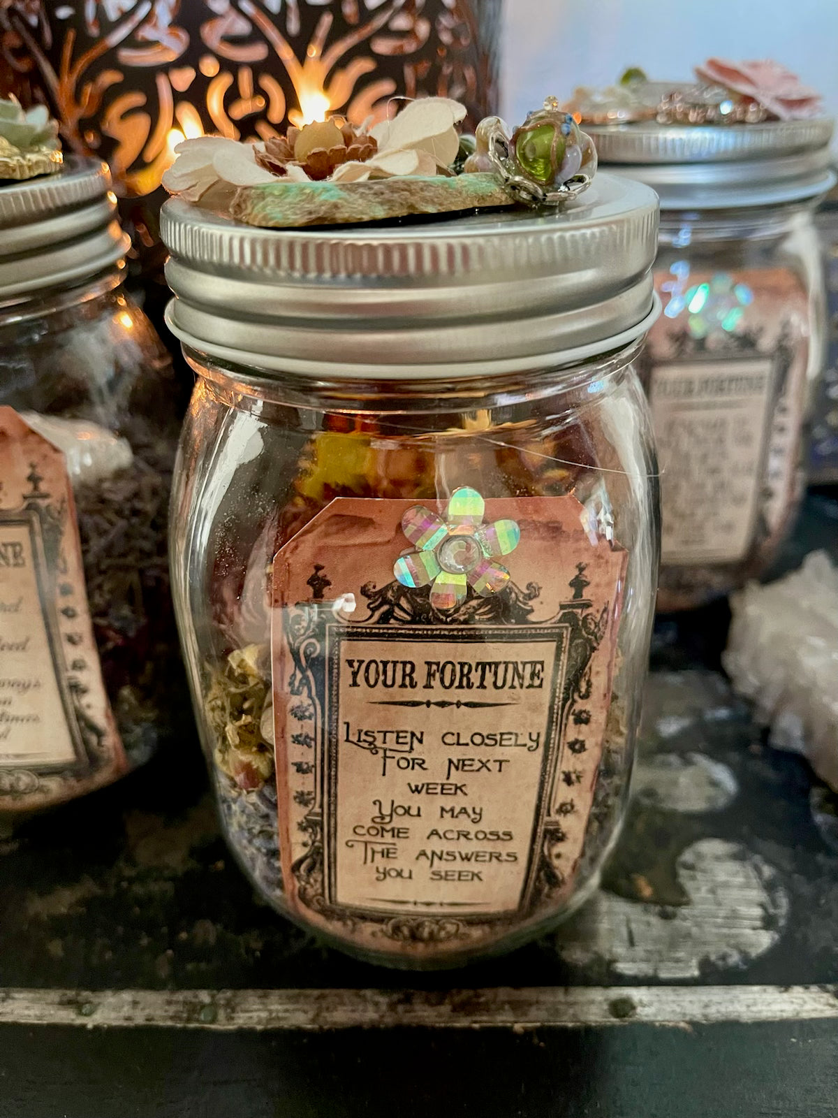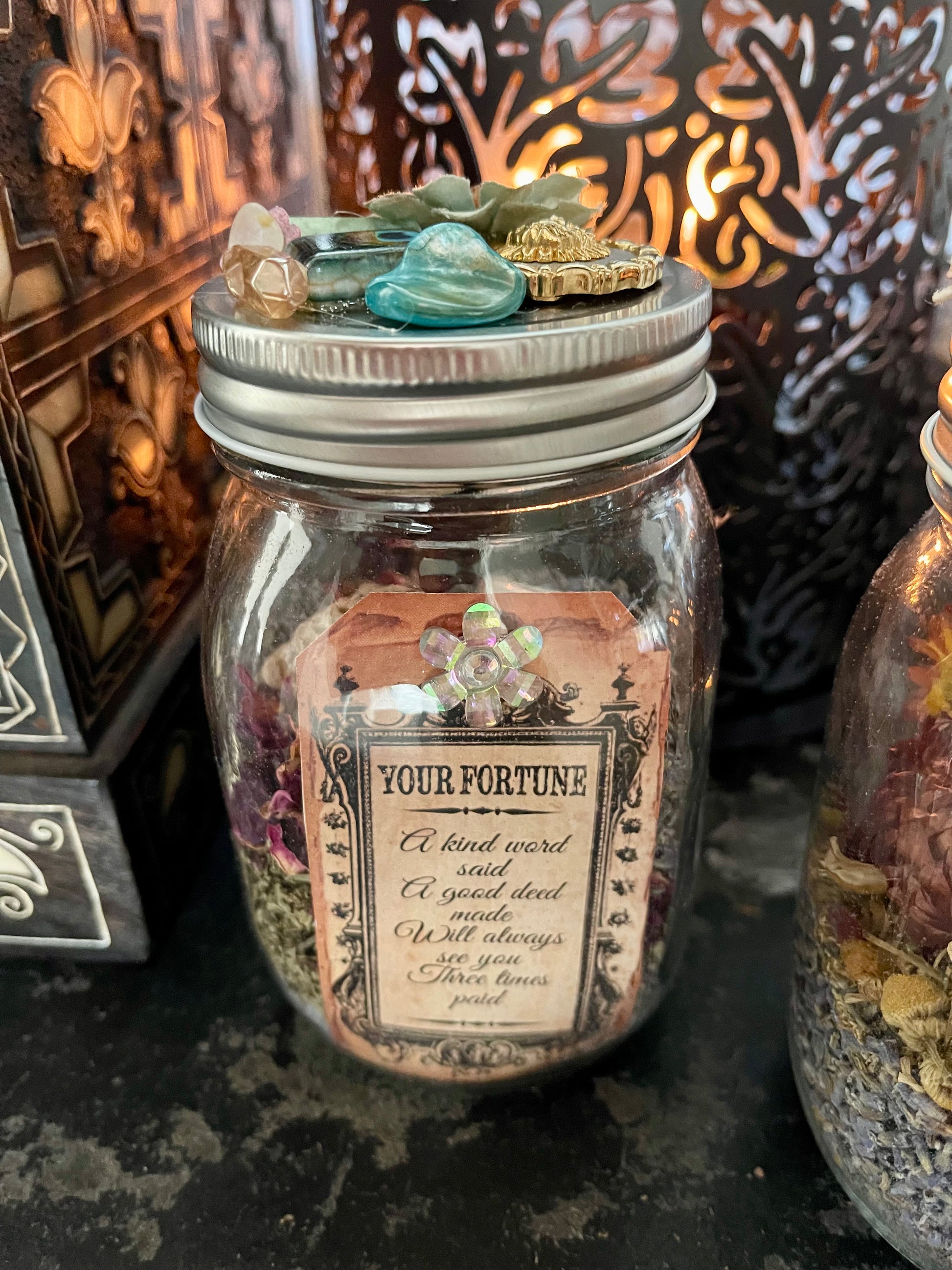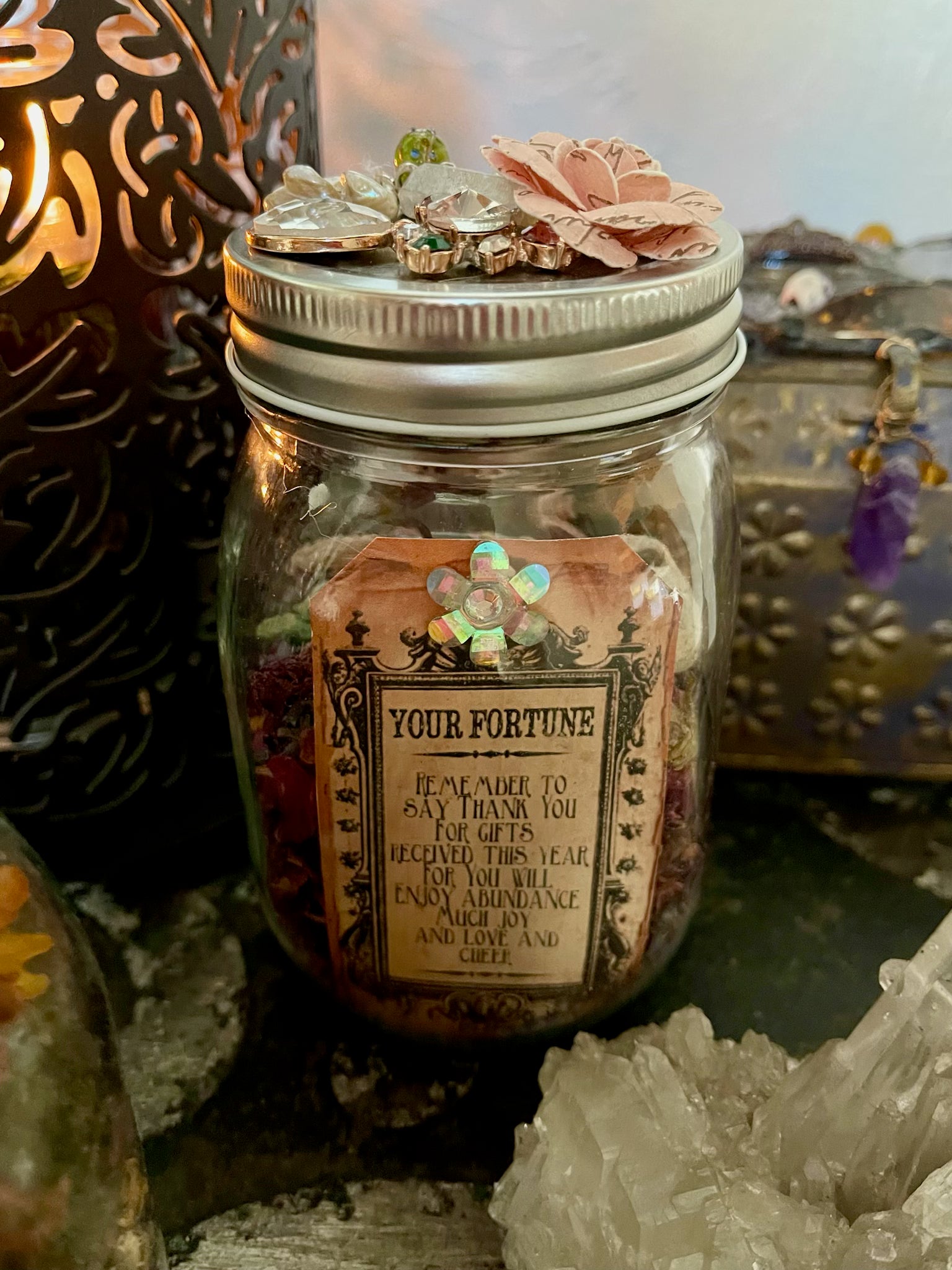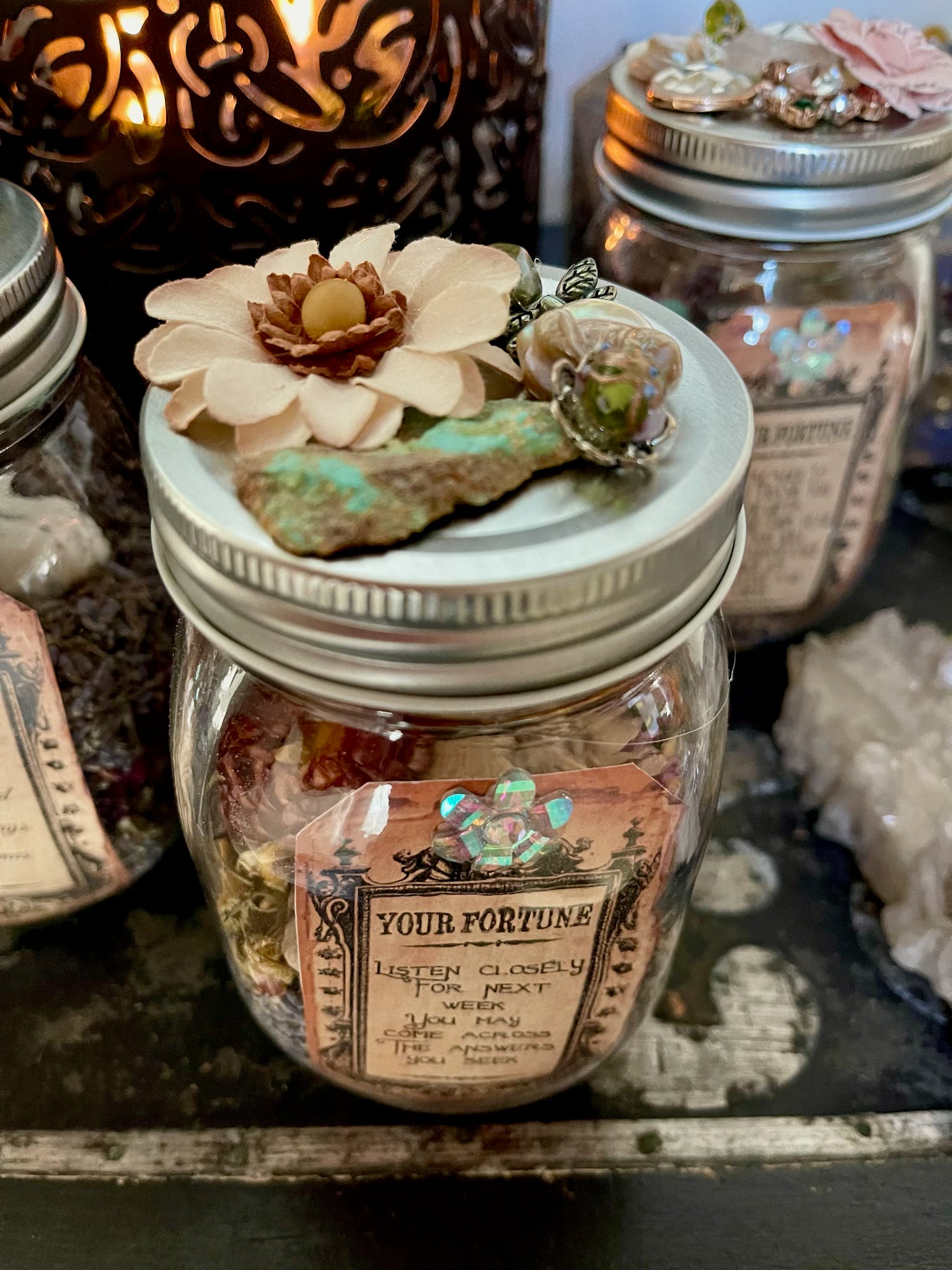 These magic jars are a fun and lighthearted way to give yourself or loved one that little life boost. Made with 100% organic herbs and resins and cleansed crystals, this will look and smell wonderful for years.