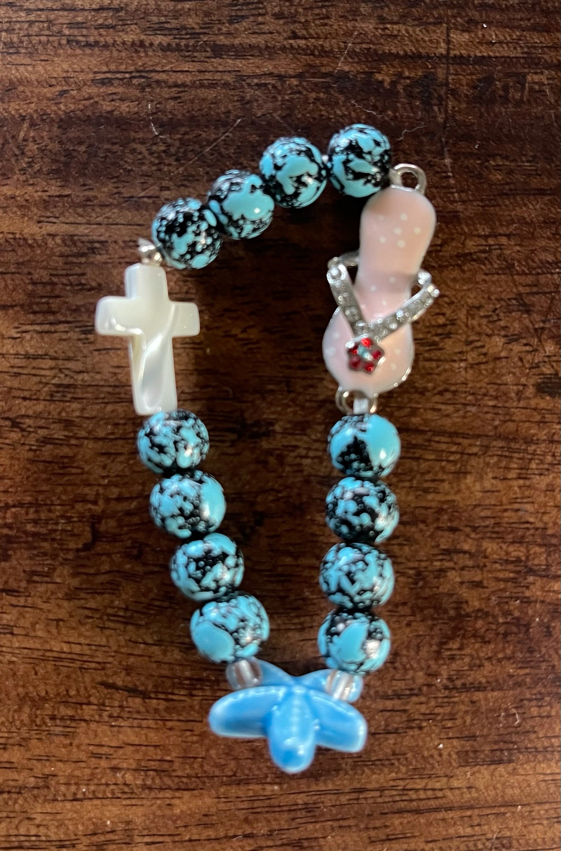 Made with love it includes faux dyed howlite beads, mother of pearl cross and a fun bedazled flip flop.