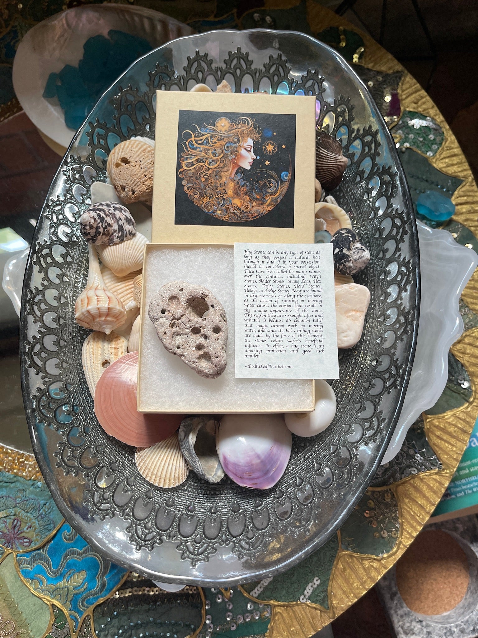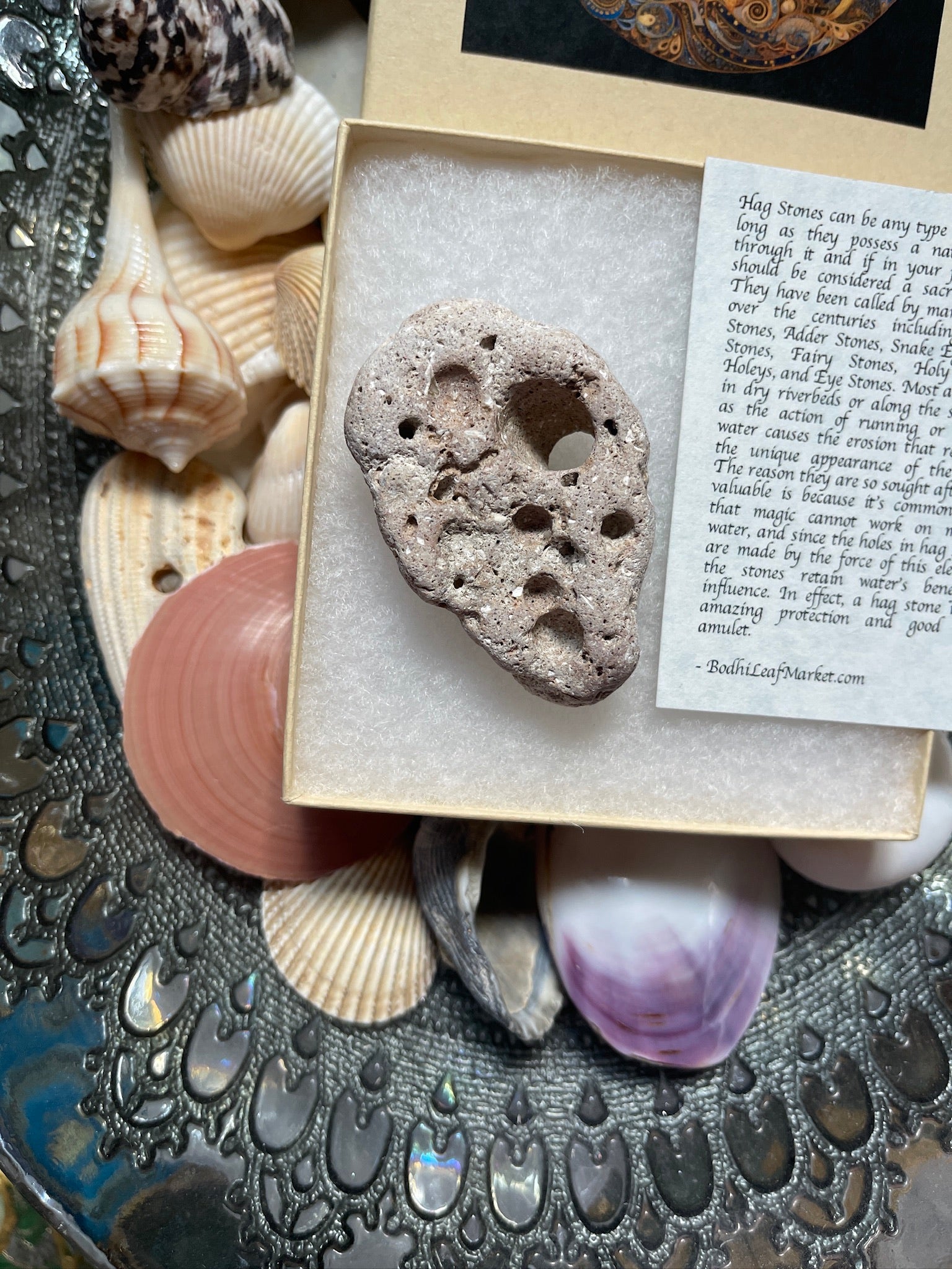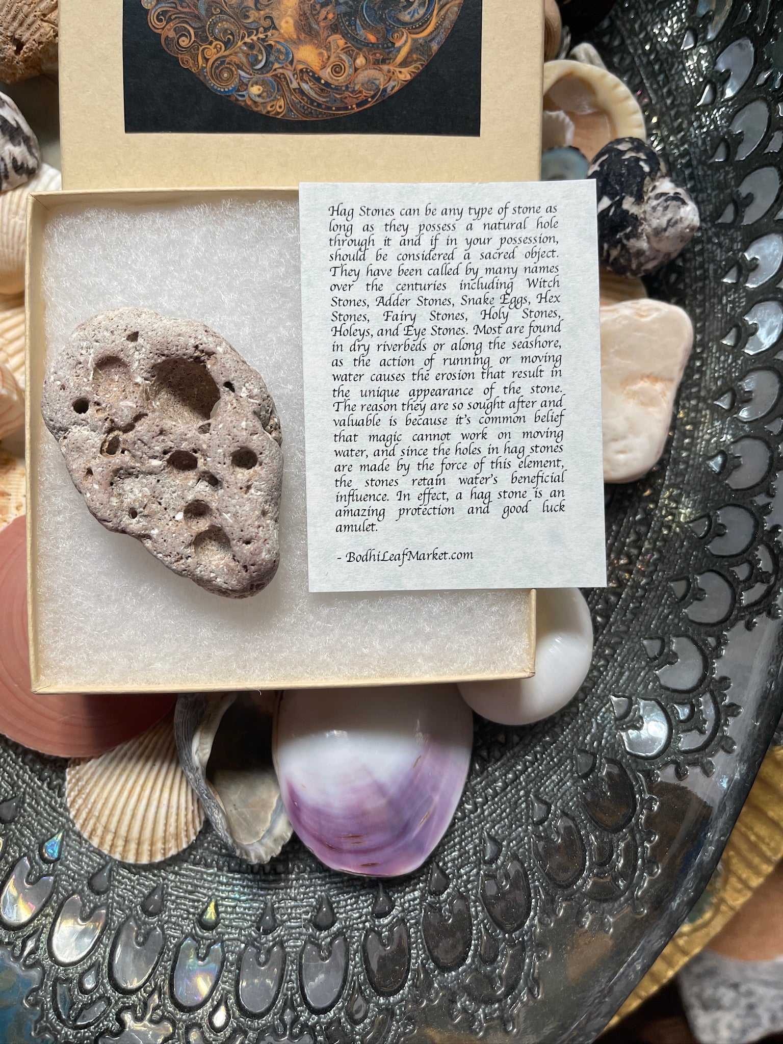 Hag Stones can be any type of stone as long as they possess a natural hole through it and if in your possession, should be considered a sacred object. They have been called by many names over the centuries including Witch Stones, Adder Stones, Snake Eggs, Hex Stones, Fairy Stones, Holy Stones, Holeys, and Eye Stones. Most are found in dry riverbeds or along the seashore, as the action of running or moving water causes the erosion that result in the unique appearance of the stone.
