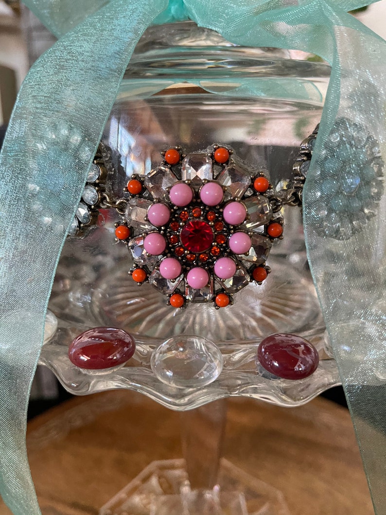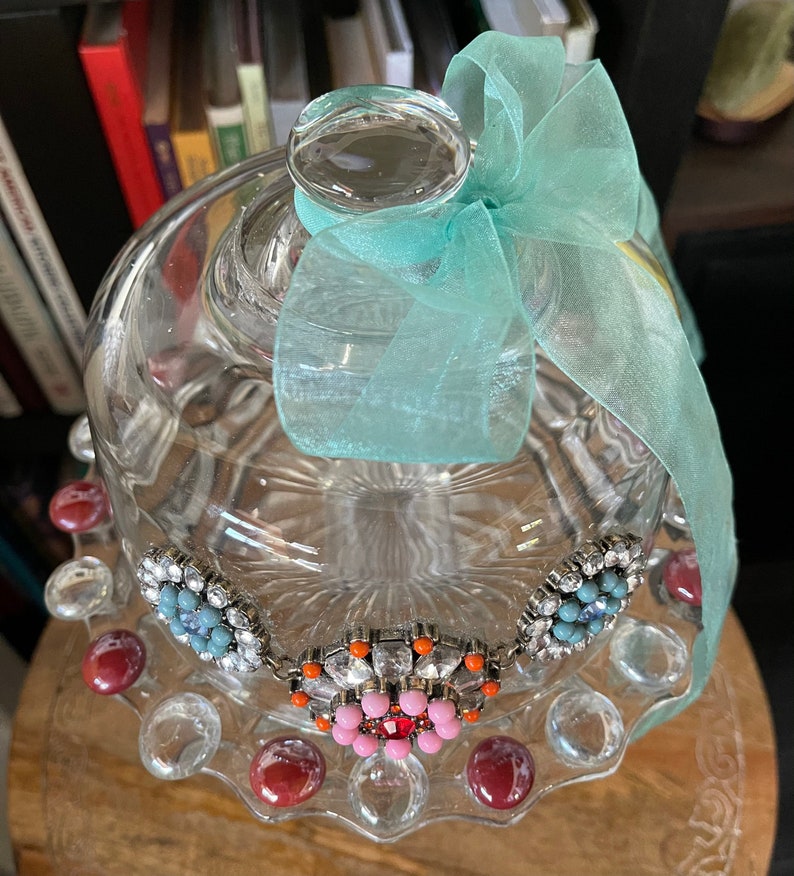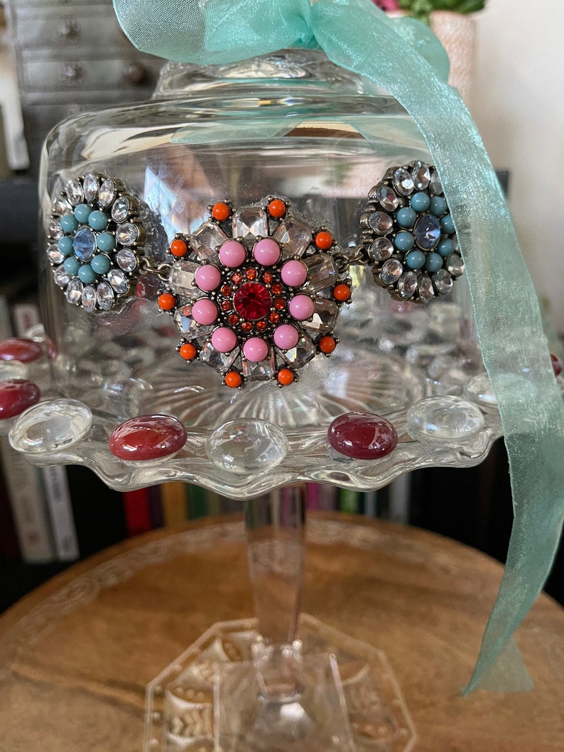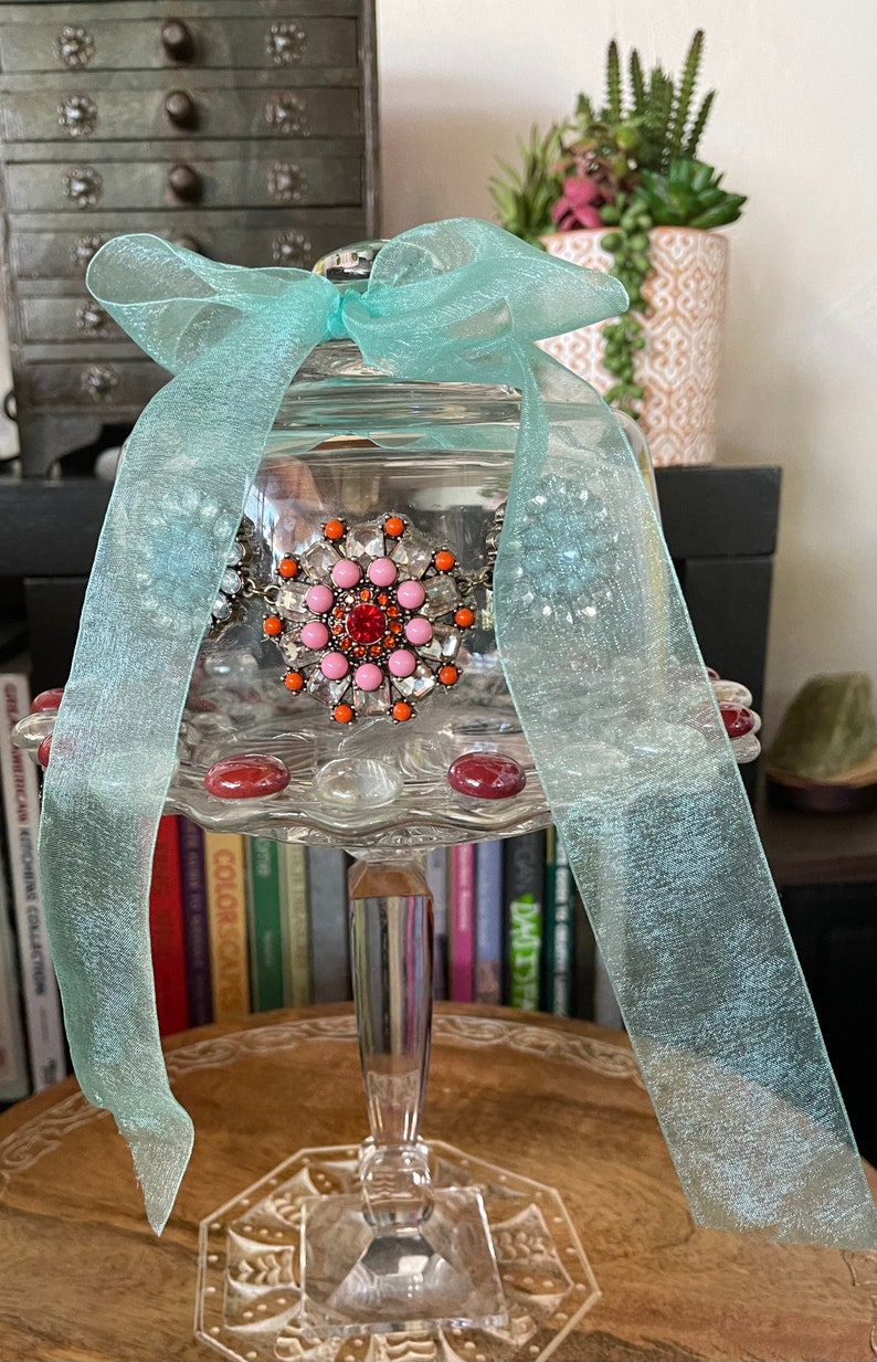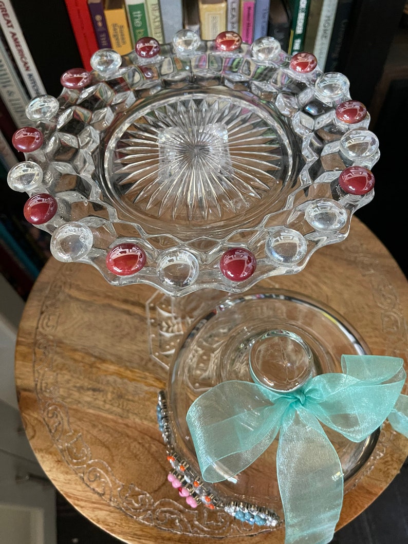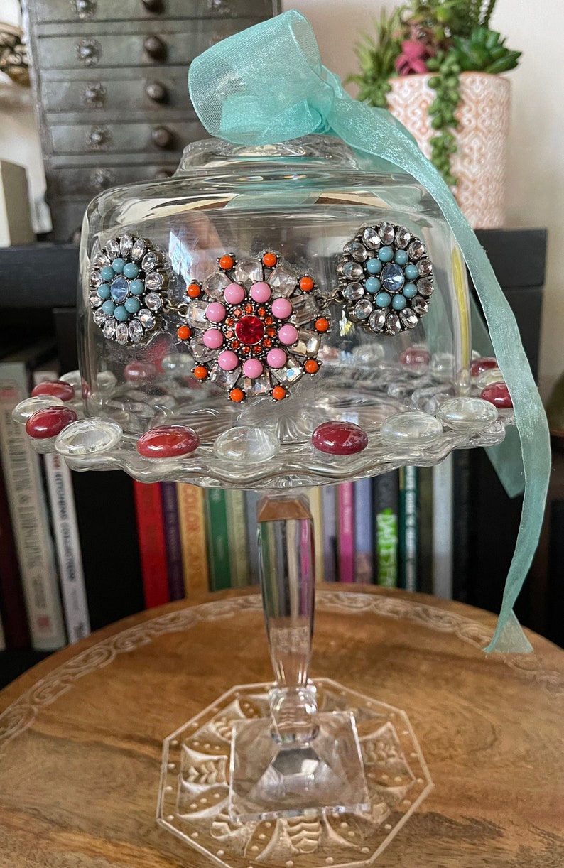 This beautiful and heavy vintage glass cake stand has been lovingly bedazzled for some extra glam.
