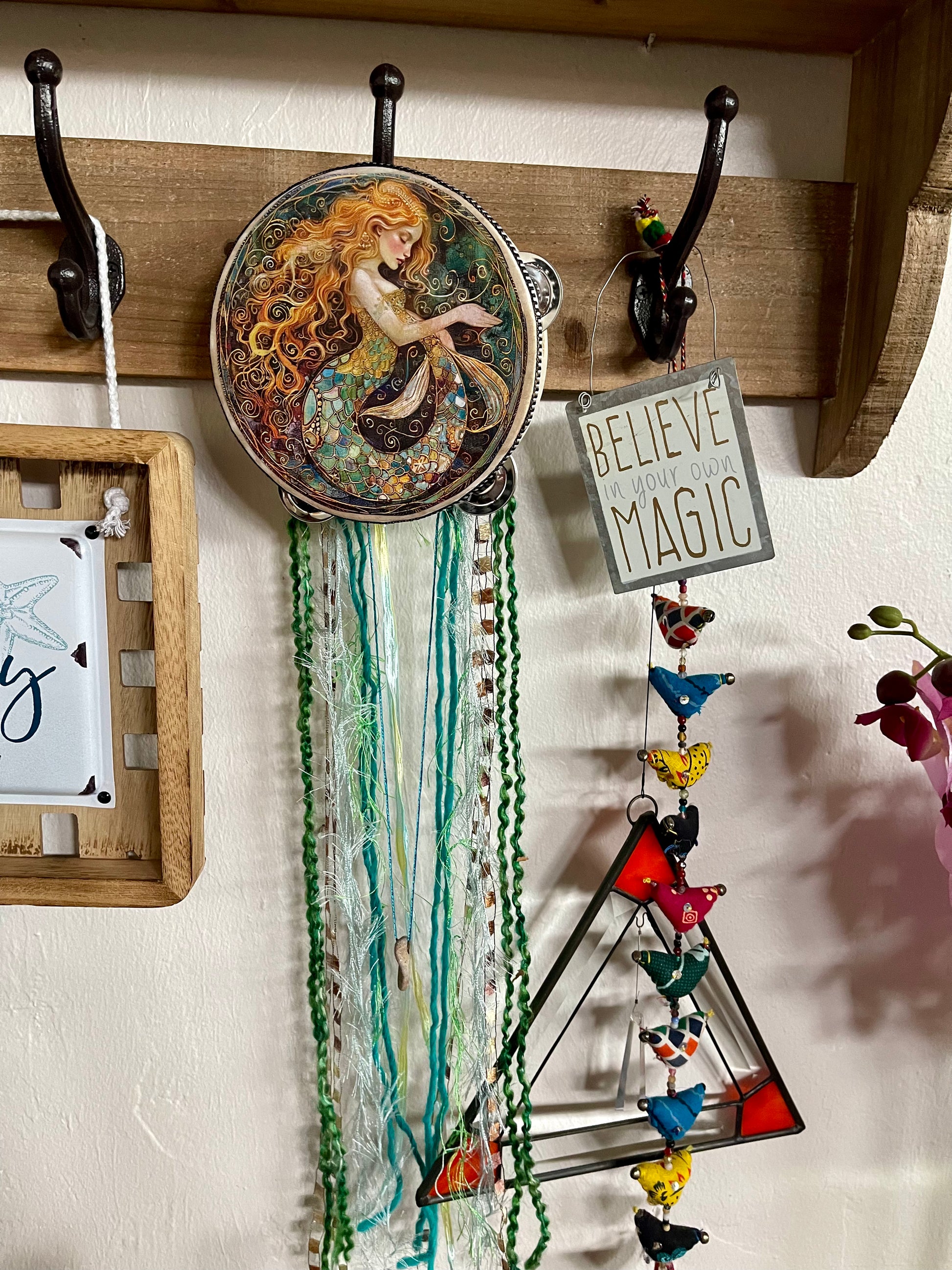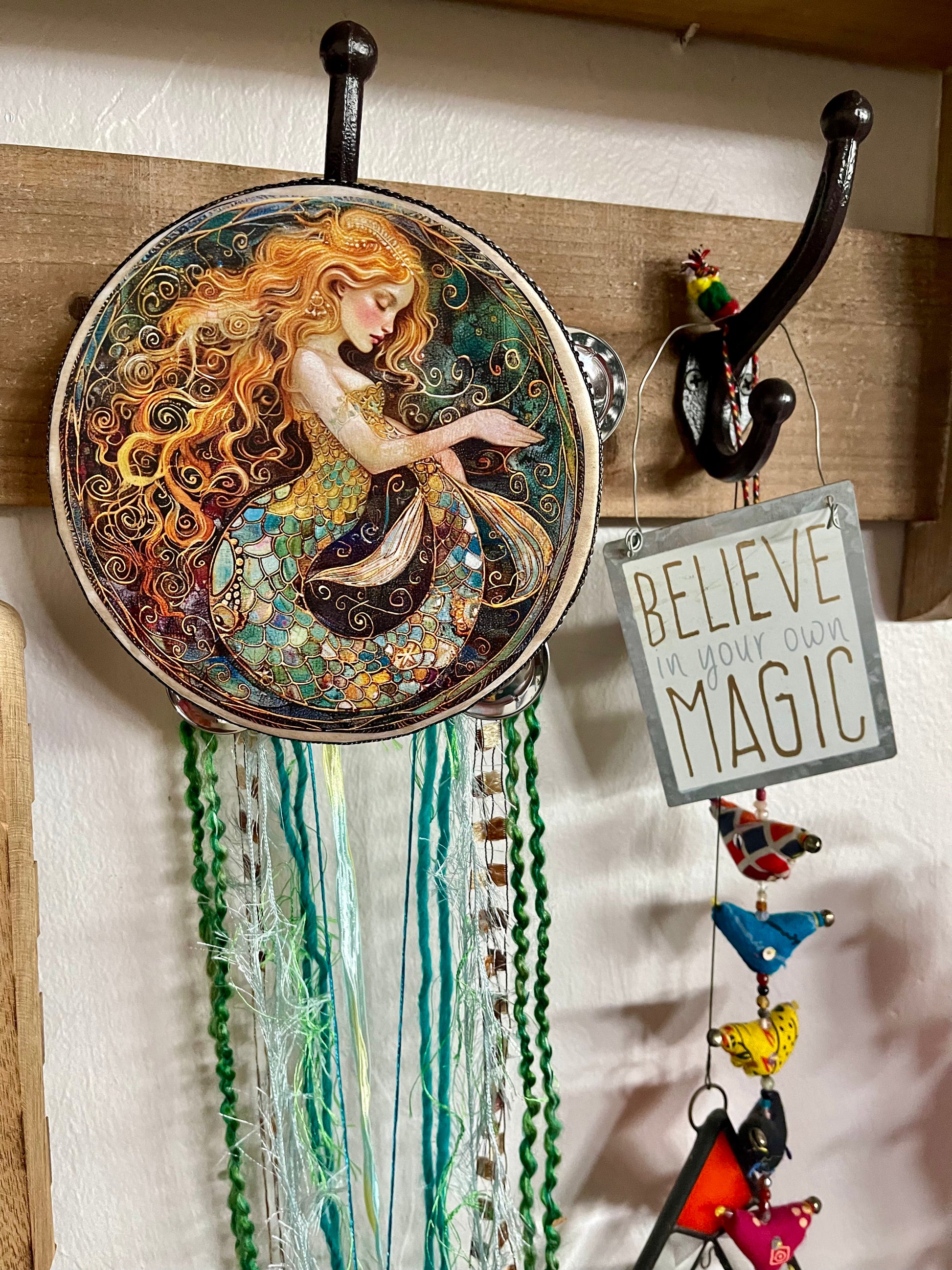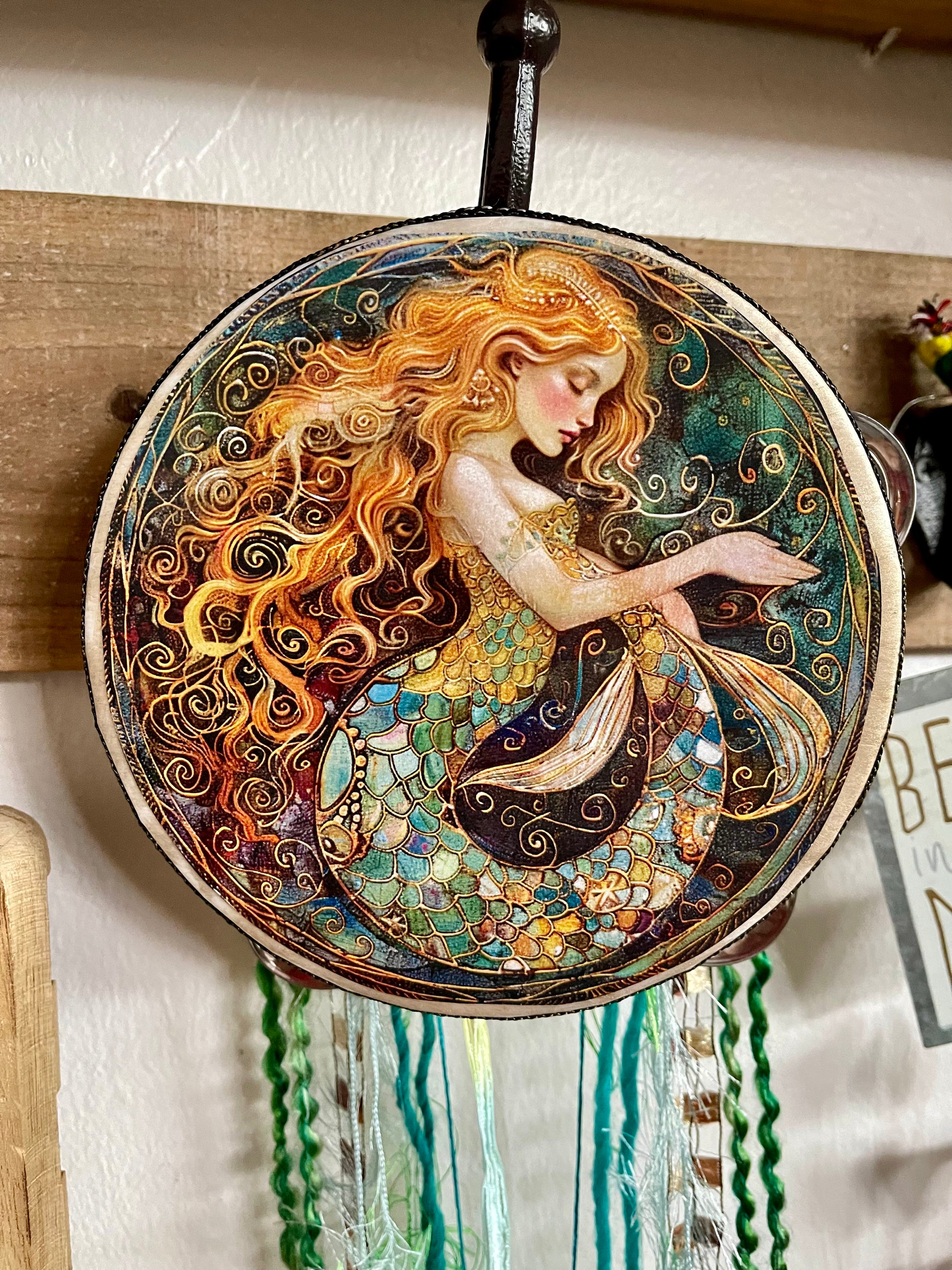 This is a beautiful printed mixed media mermaid decoupaged on a real tambourine. Tambourine measures approx 6".