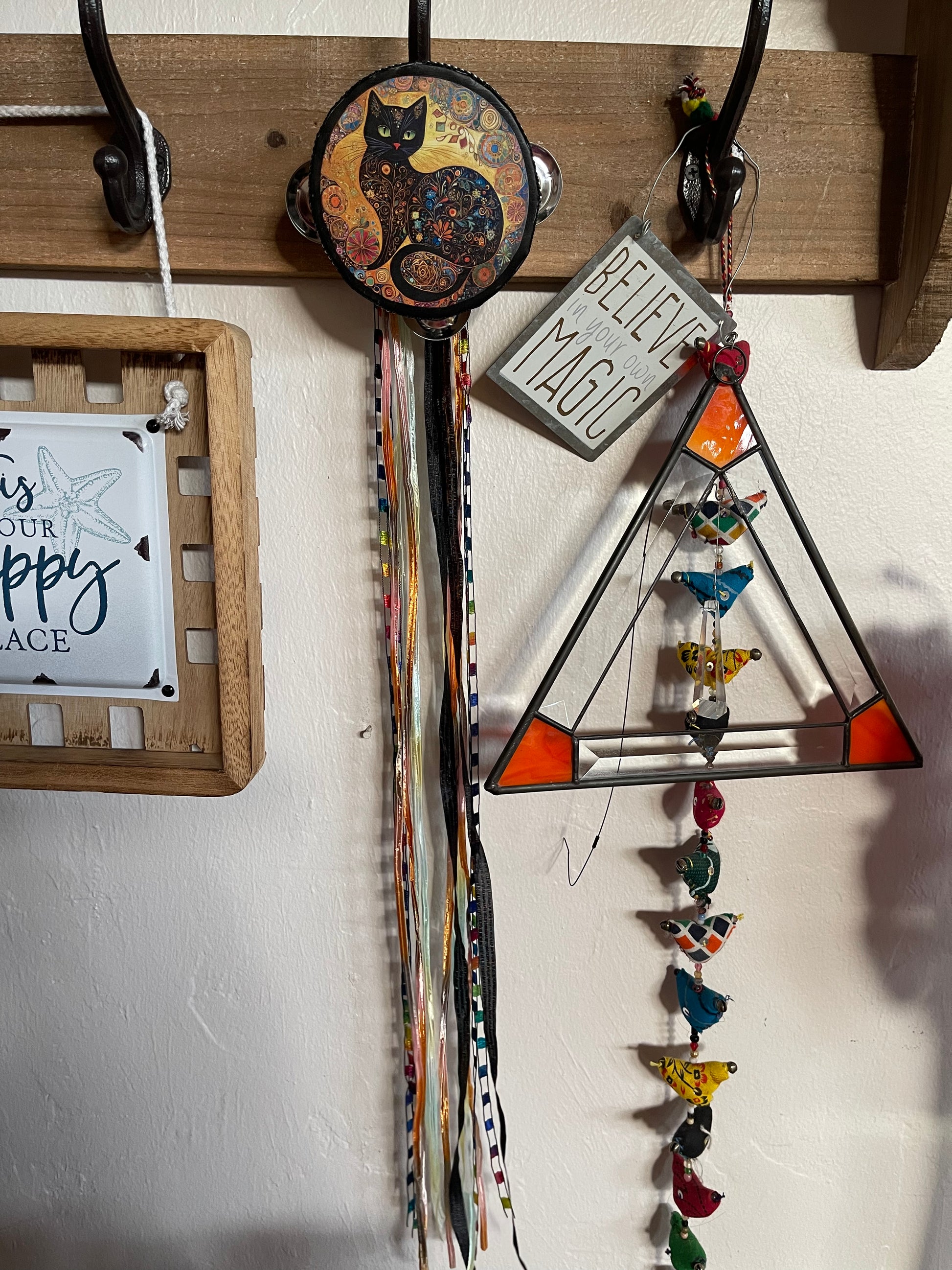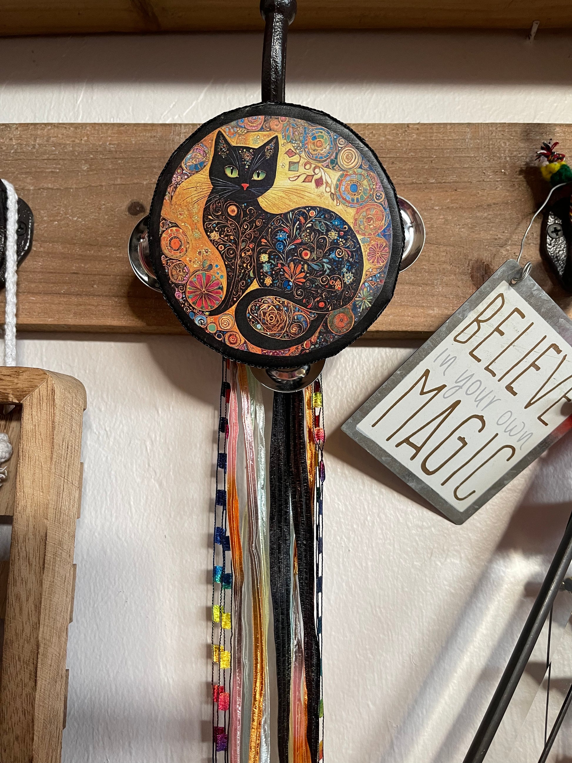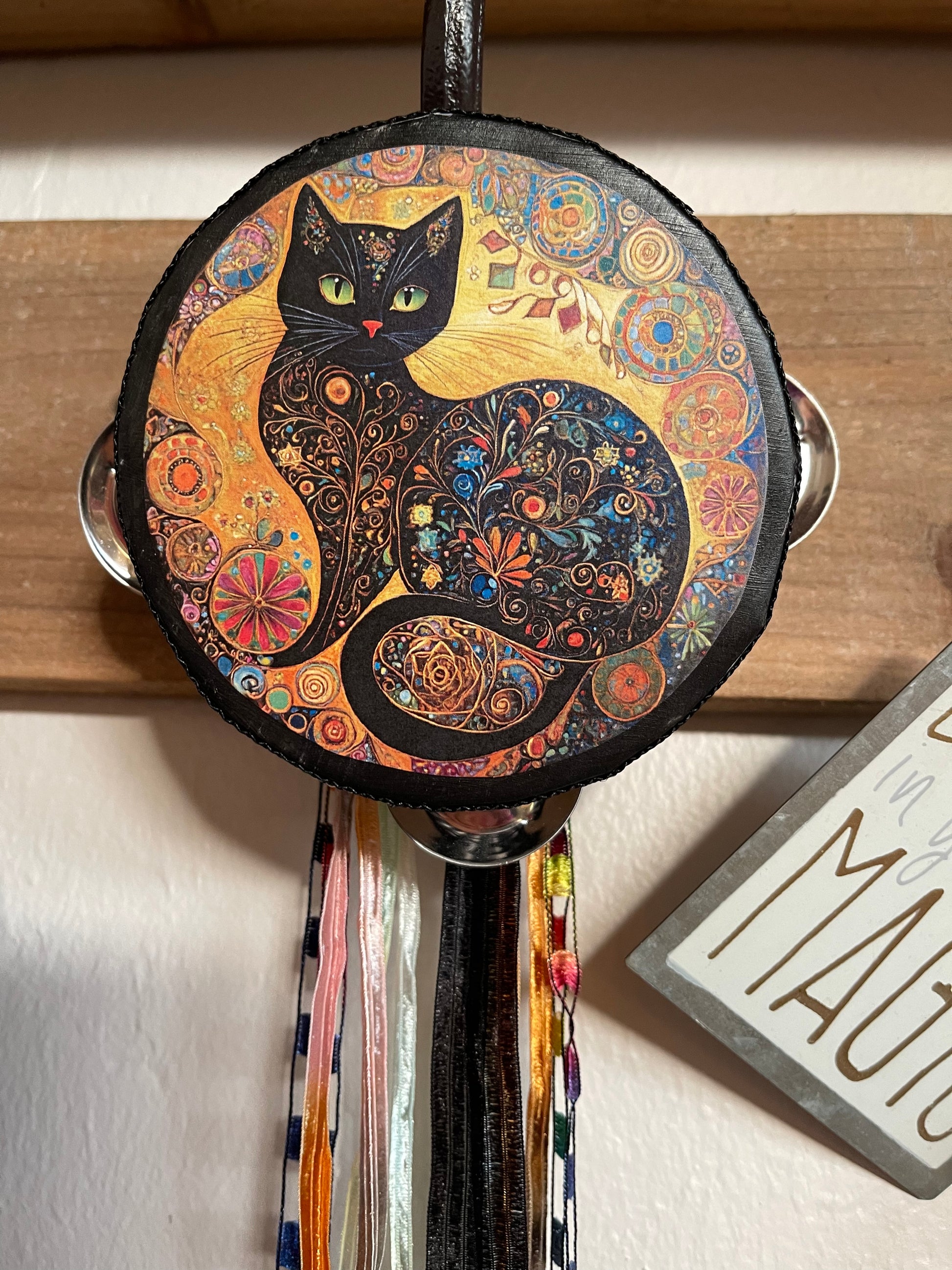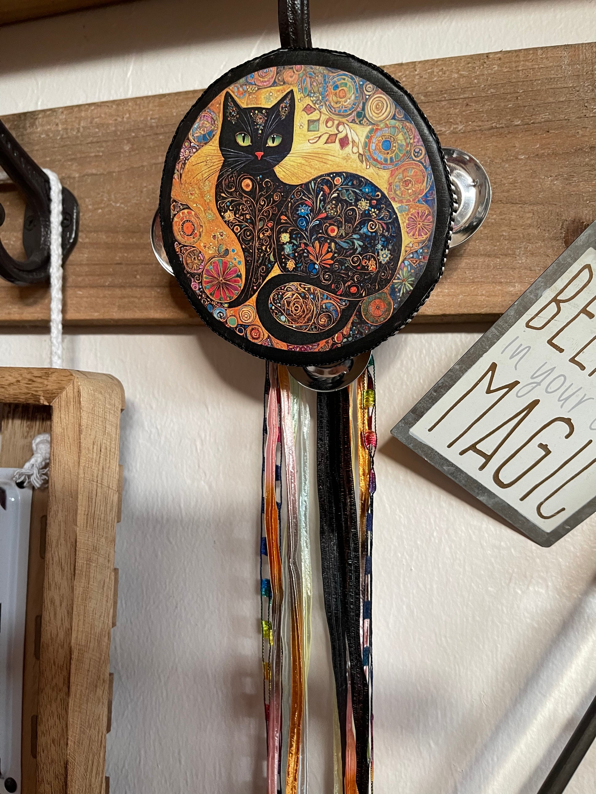 Mystical Black Cat Tambourine and Ribbon Wall Hanging, Bodhi Home Decor