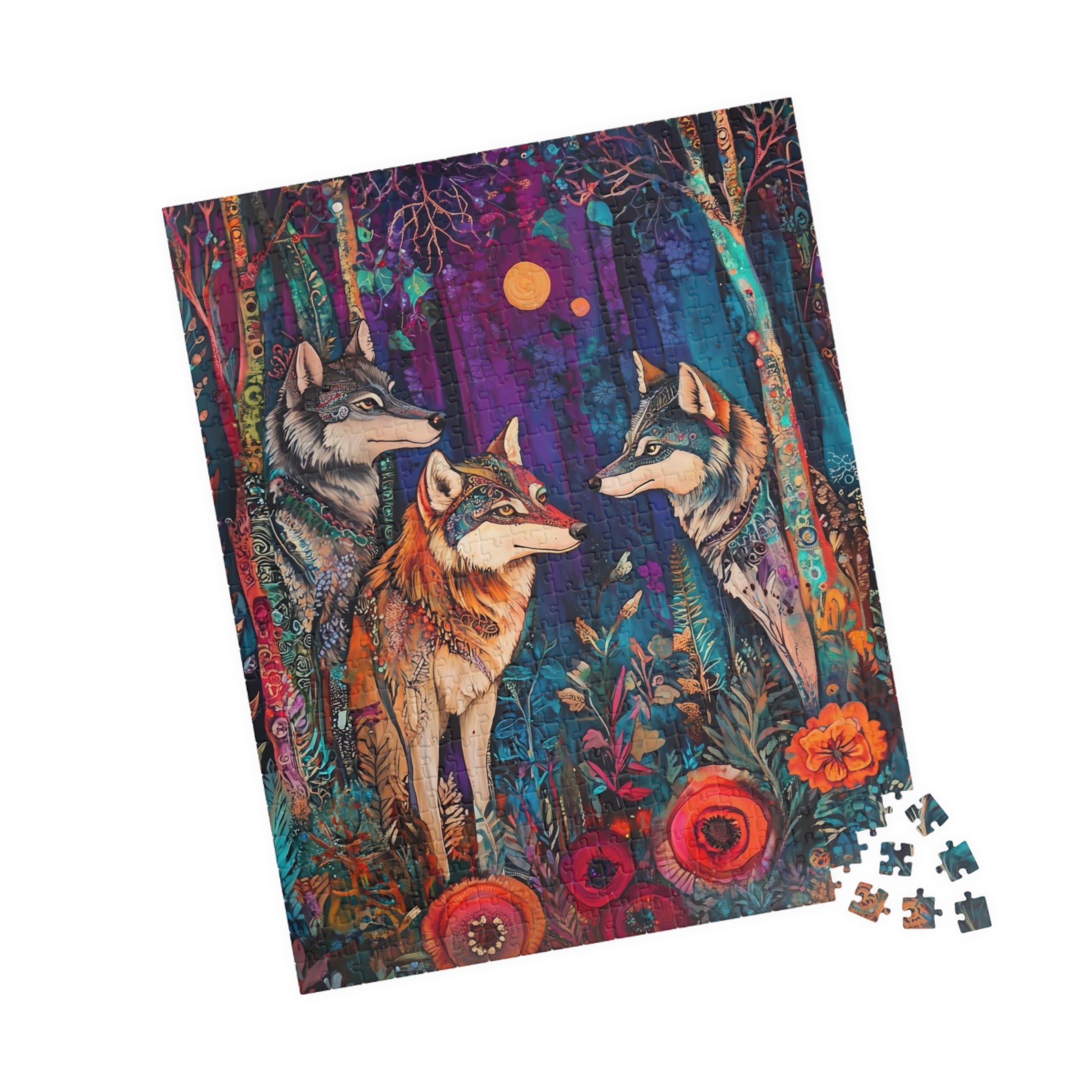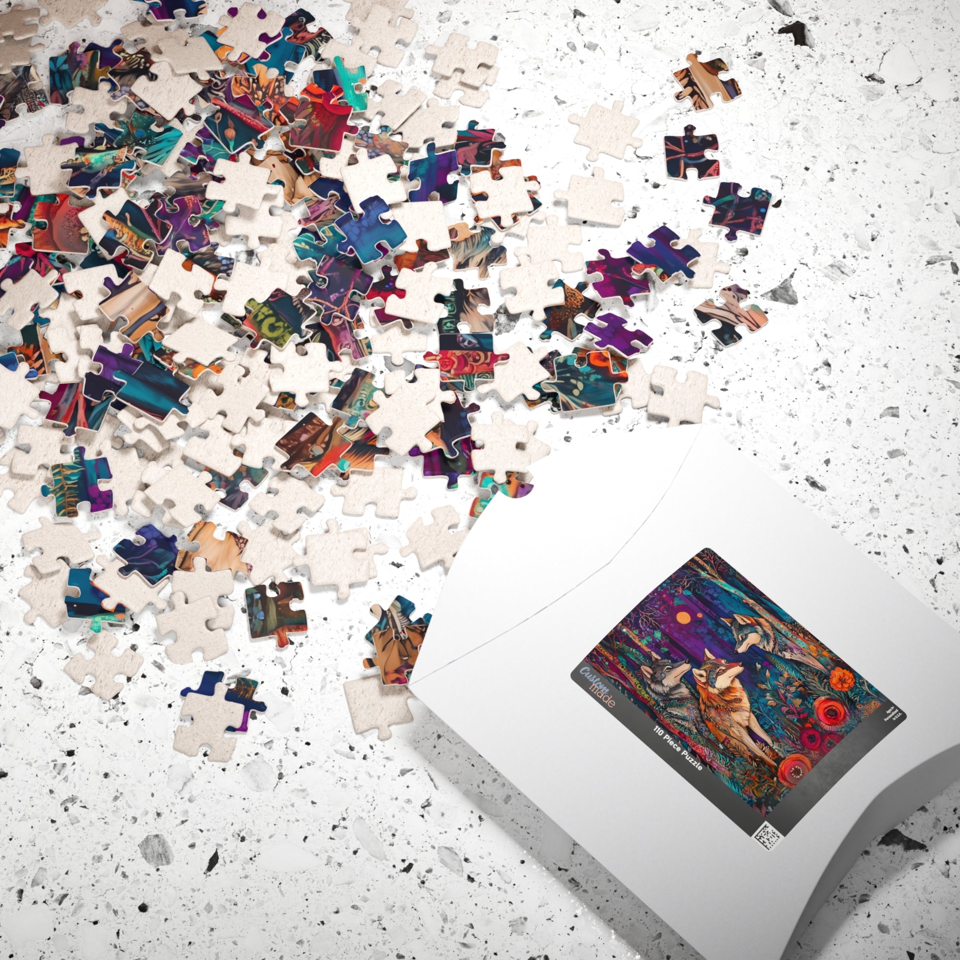 Gather around a low table, pour a cup of tea, and settle into the quiet joy of piecing this scene together. This puzzle lets you lose track of time among moonlit trees, jewel-toned florals, and three watchful wolves — each piece a small step into a story-rich forest. The glossy finish deepens the colors and brings out fine linework, while sturdy chipboard pieces click together with satisfying weight. Choose the level of immersion — from a quick 110-piece calm to the meditative focus of 1014 pieces — and orient the artwork vertical or horizontal to suit your space. The printed paper box makes it easy to tuck away or share with someone who loves intricate art and woodland nights.