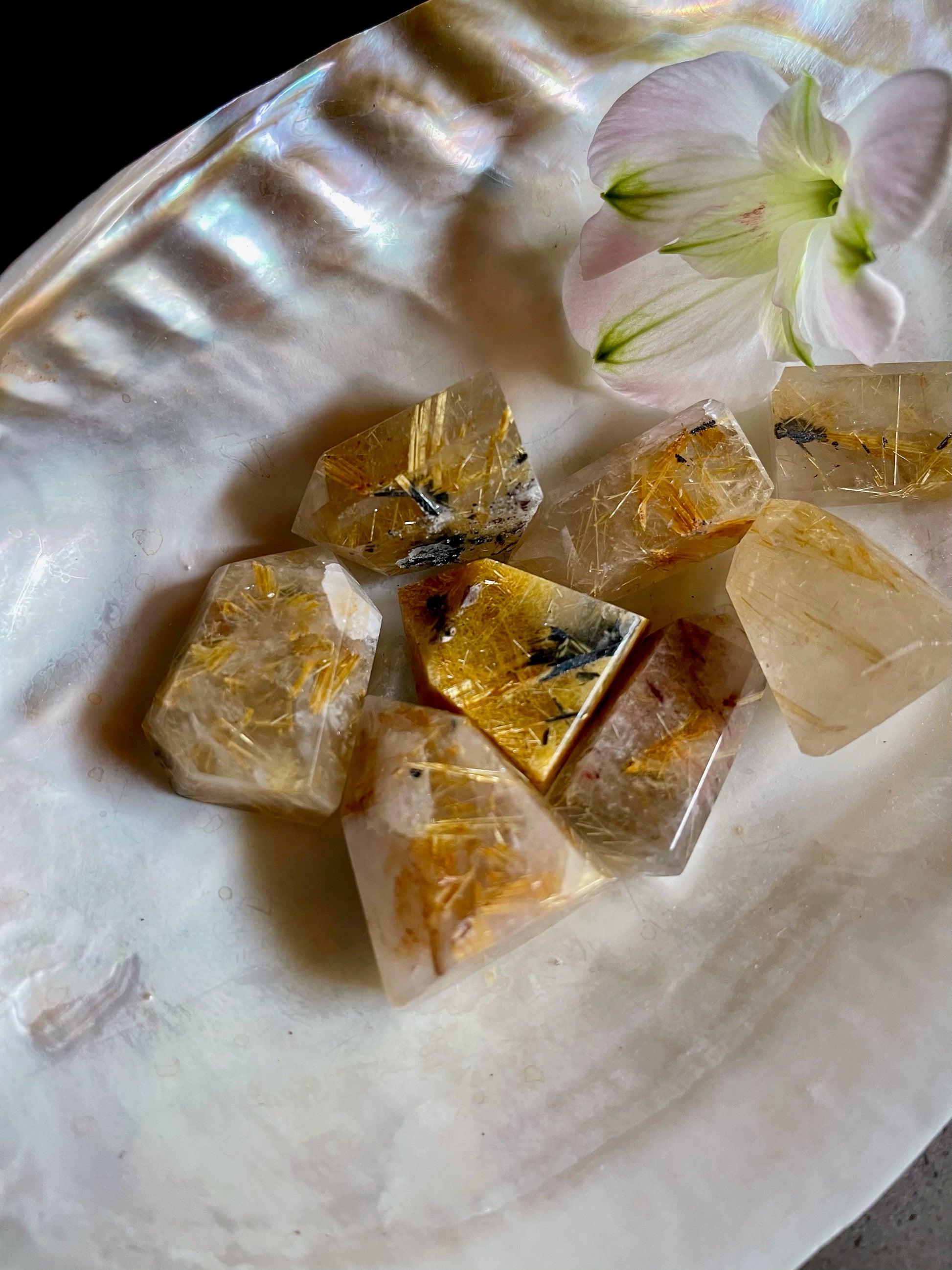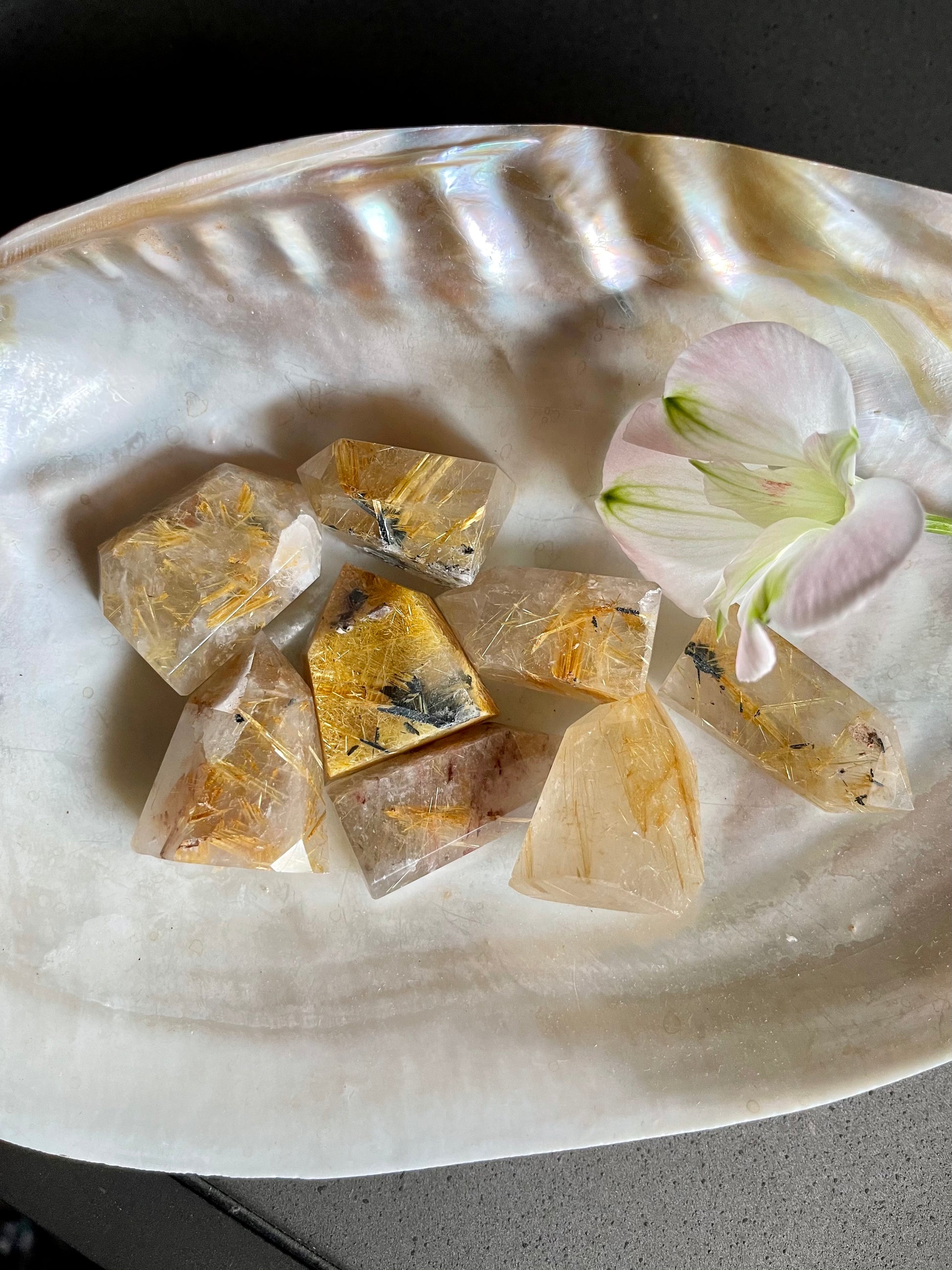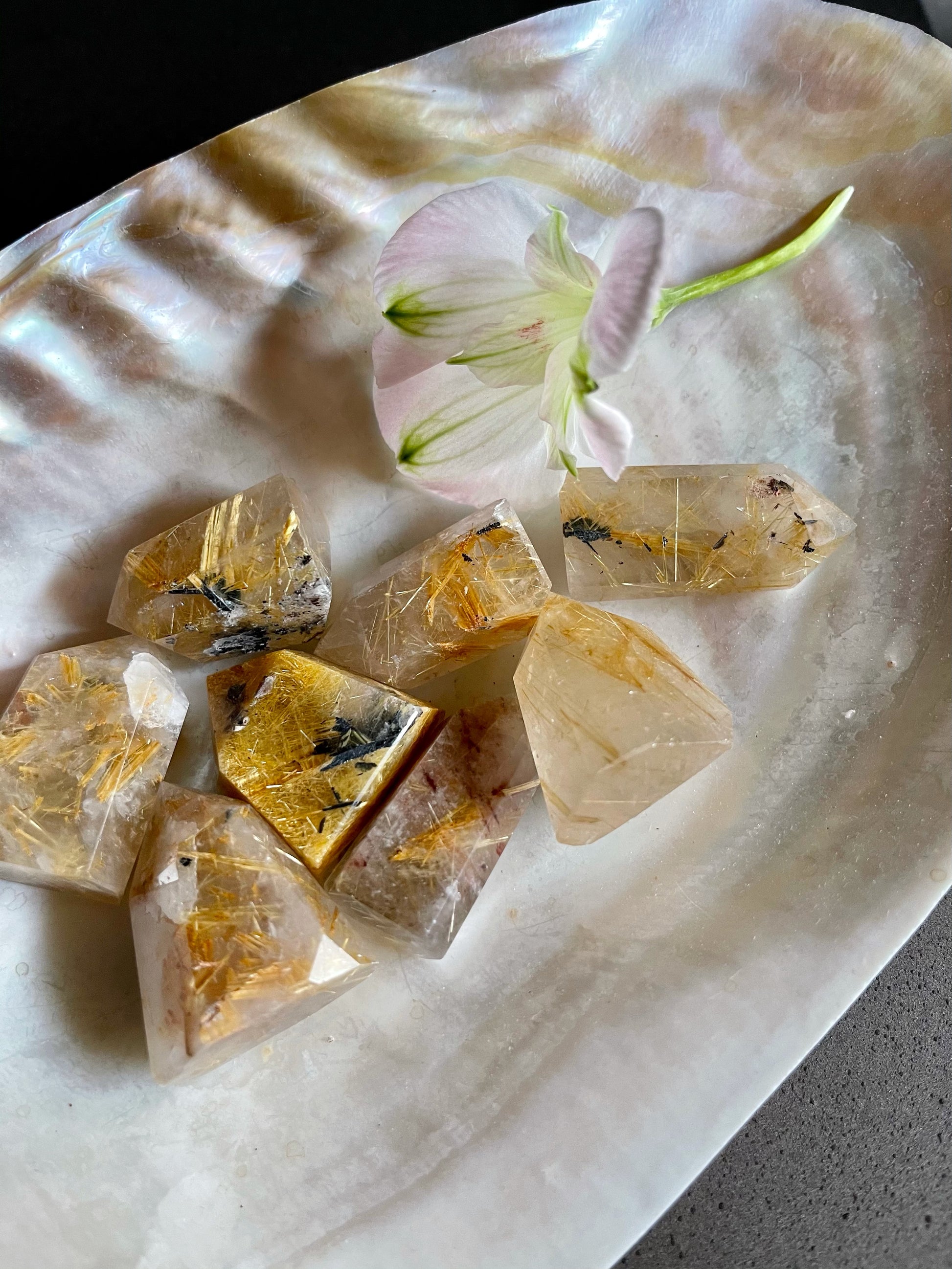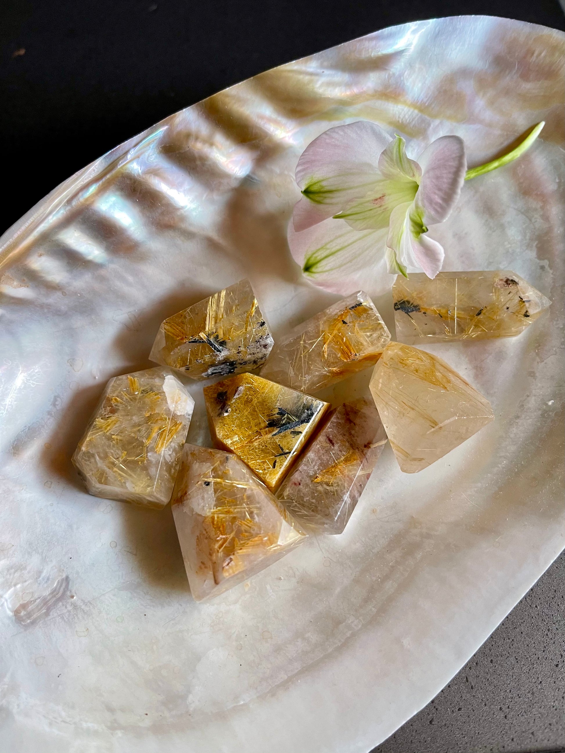 Gold Rutile Quartz ~ Rutile Quartz is said to represent self-confidence, reduce stress, and bring inner peace. It’s often used in spiritual practices because of the meaning it holds within crystal healing circles.