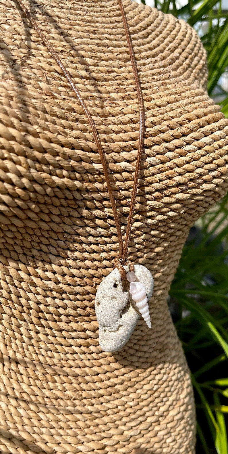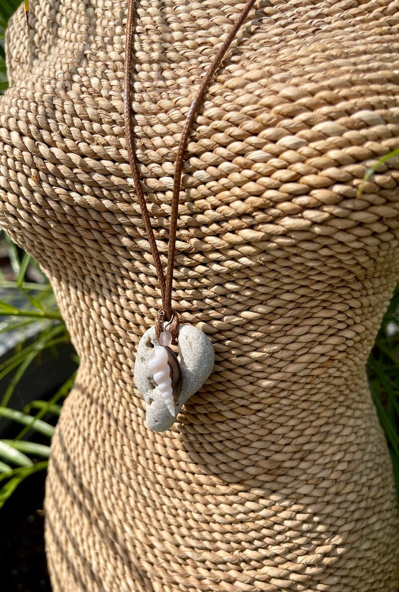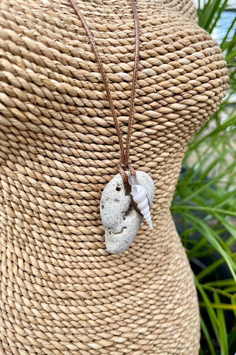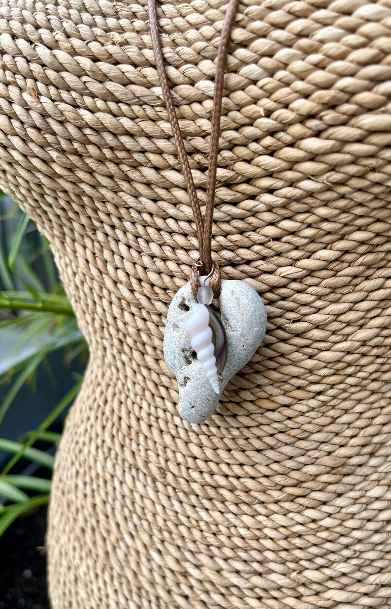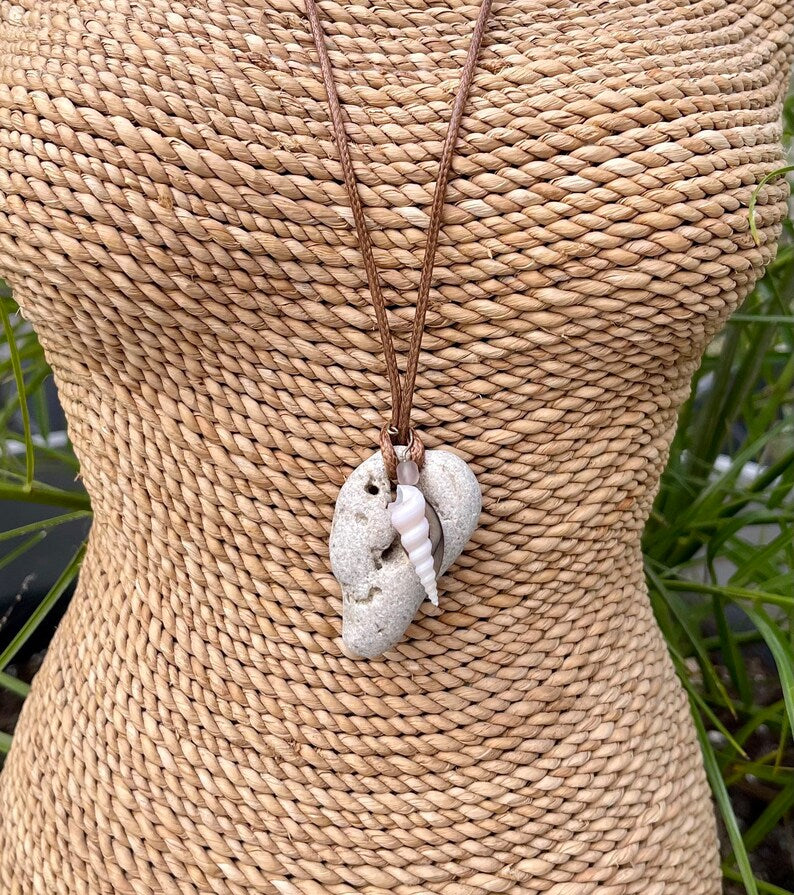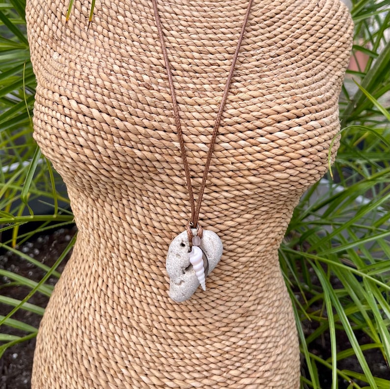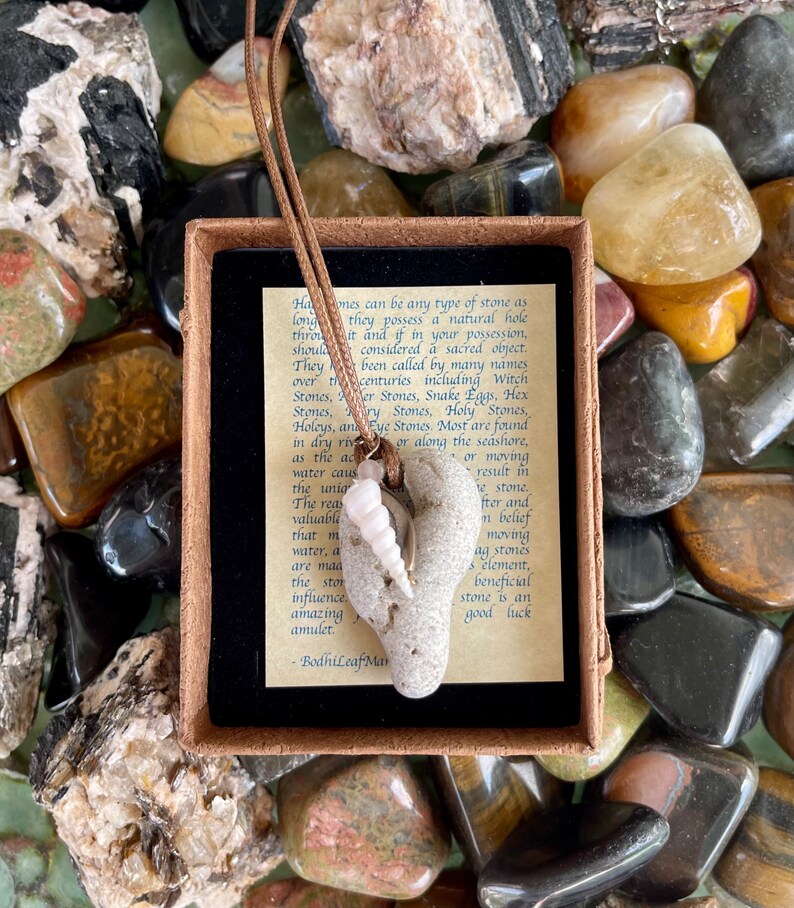 This stone measures approx 1/2" across and the necklace measures approx 16" with a 2 inch chain extender. You will receive the exact stone and shell in this picture. This will be gift boxed with a brief description of the magical properties of the hagstone.