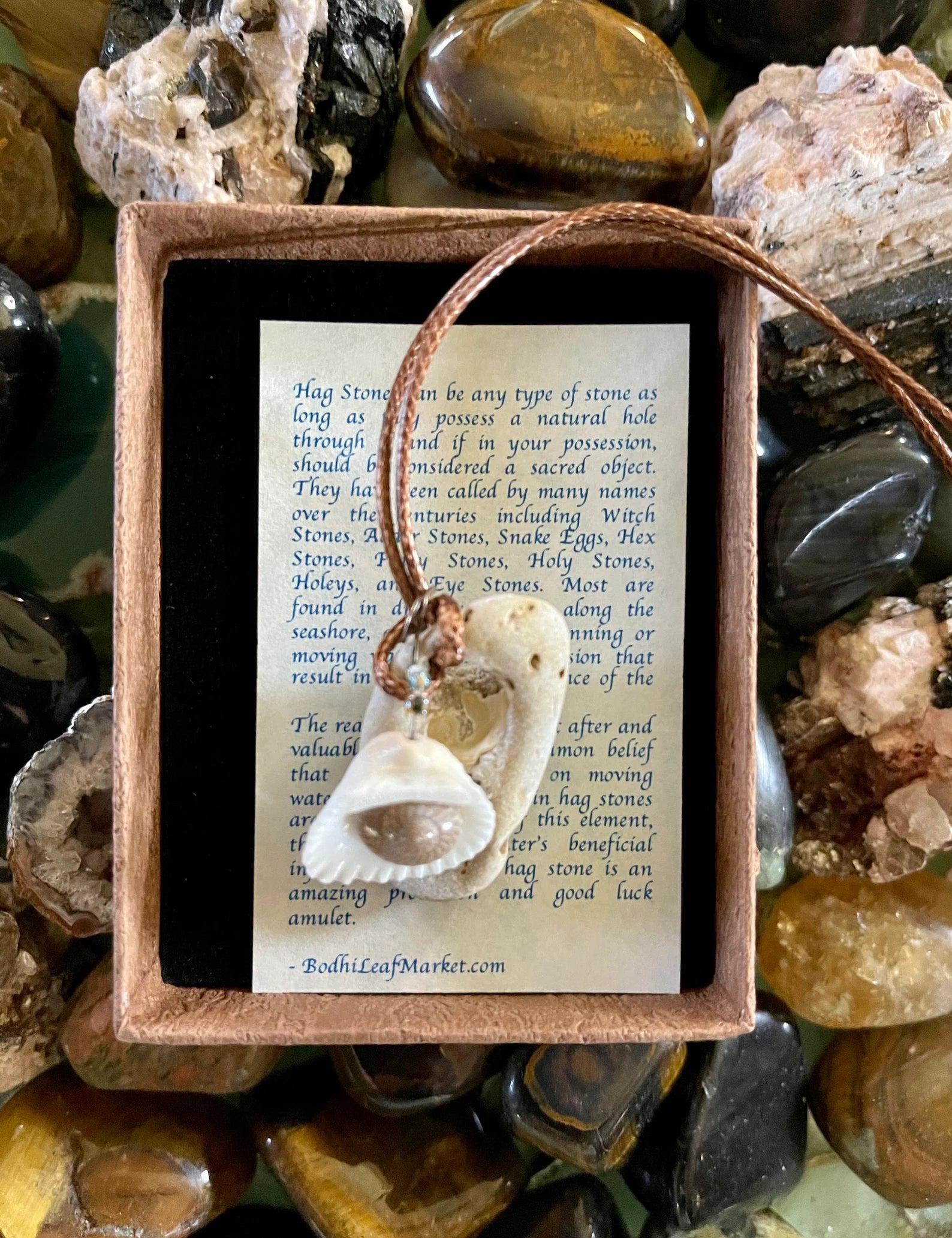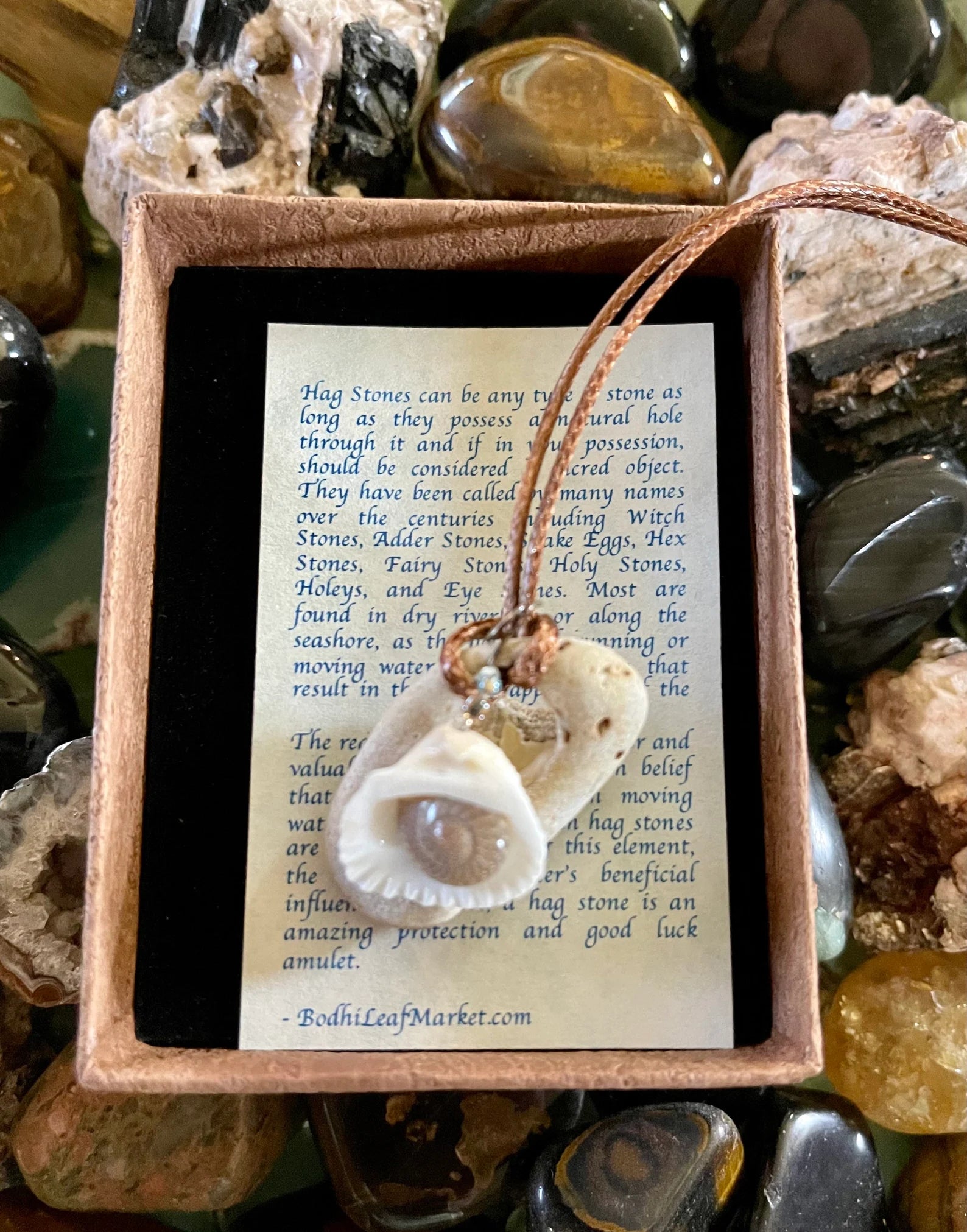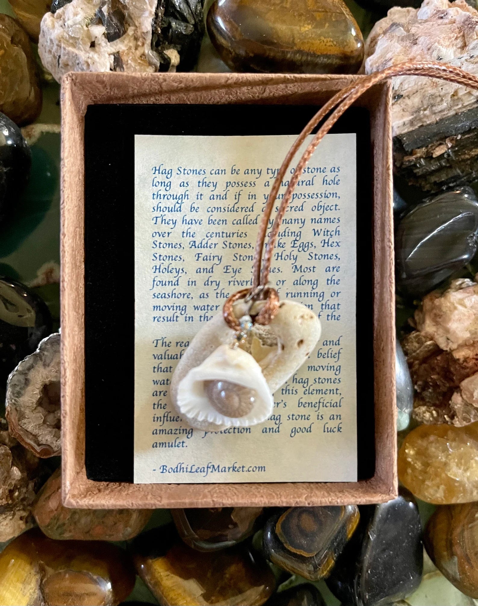 Hag Stones can be any type of stone as long as they possess a natural hole through it and if in your possession, should be considered a sacred object. They have been called by many names over the centuries including Witch Stones, Adder Stones, Snake Eggs, Hex Stones, Fairy Stones, Holy Stones, Holeys, and Eye Stones. Most are found in dry riverbeds or along the seashore, as the action of running or moving water causes the erosion that result in the unique appearance of the stone.