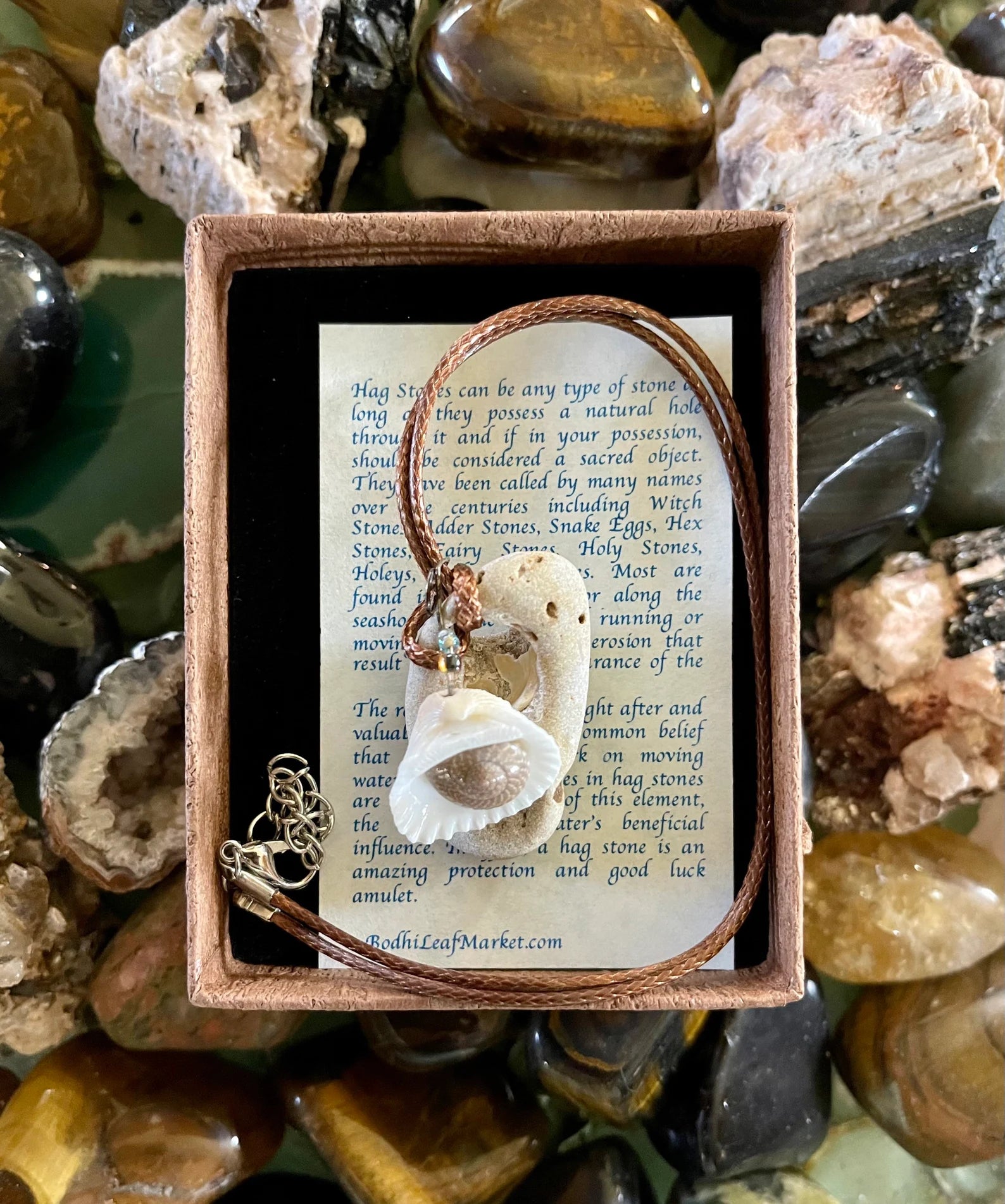 This stone measures approx 1/2" across and the necklace measures approx 16" with a 2 inch chain extender. You will receive the exact stone and seashell charm in this picture. This will be gift boxed with a brief description of the magical properties of the hagstone.