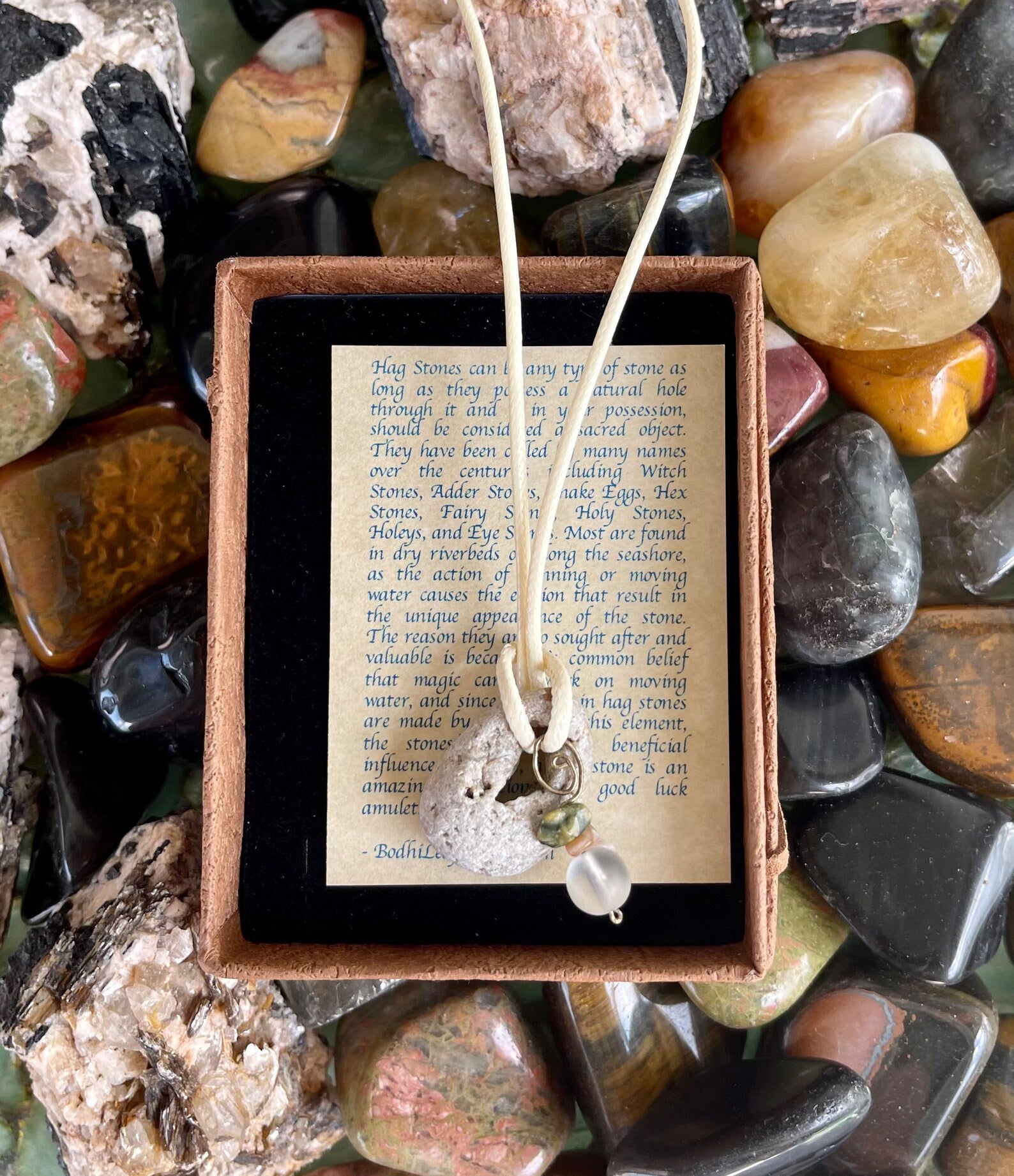 Hag Stones can be any type of stone as long as they possess a natural hole through it and if in your possession, should be considered a sacred object. They have been called by many names over the centuries including Witch Stones, Adder Stones, Snake Eggs, Hex Stones, Fairy Stones, Holy Stones, Holeys, and Eye Stones. Most are found in dry riverbeds or along the seashore, as the action of running or moving water causes the erosion that result in the unique appearance of the stone.