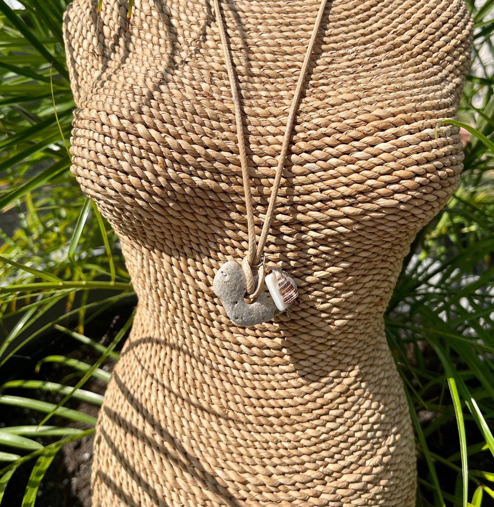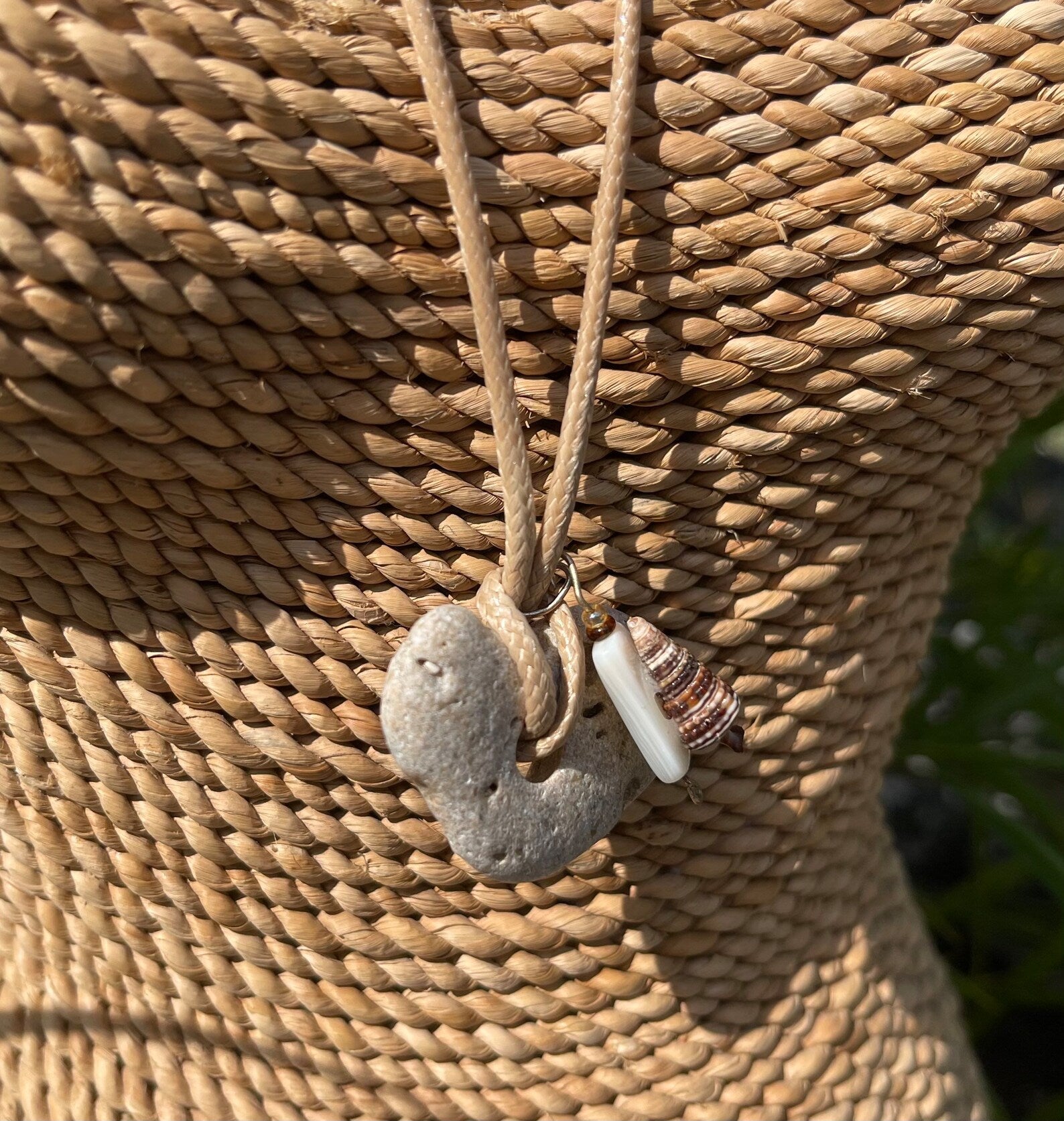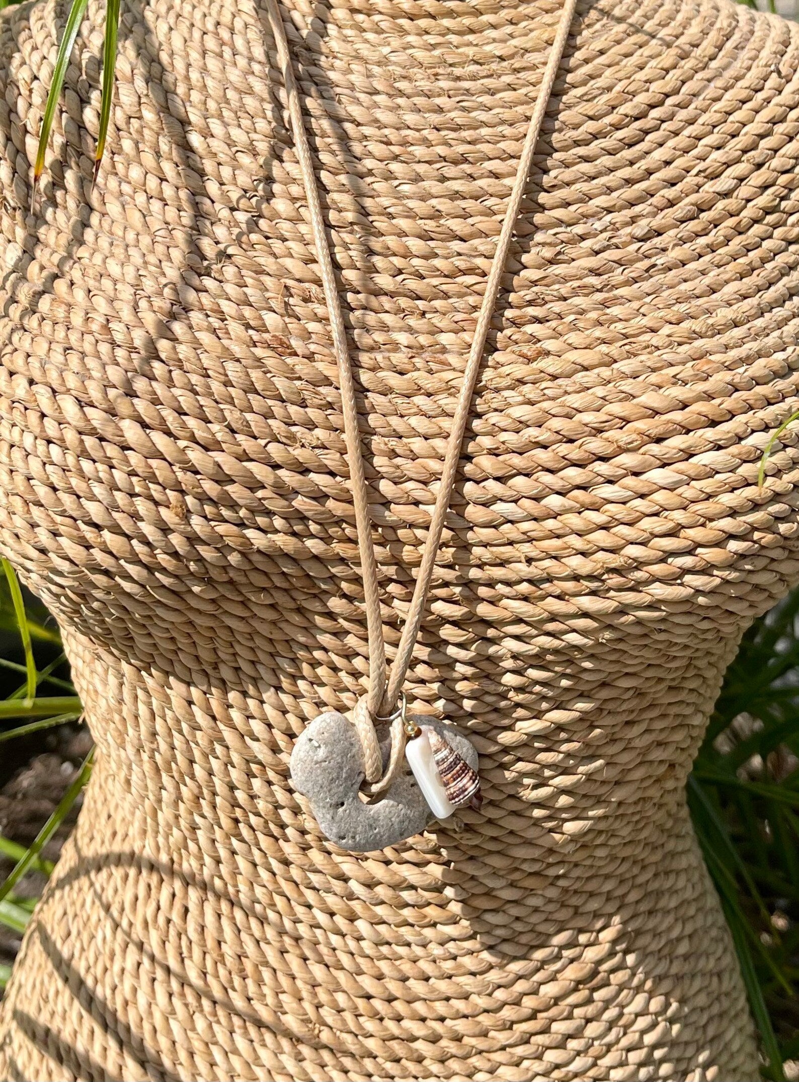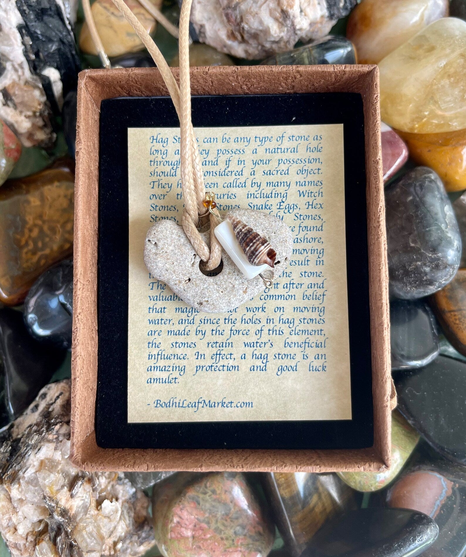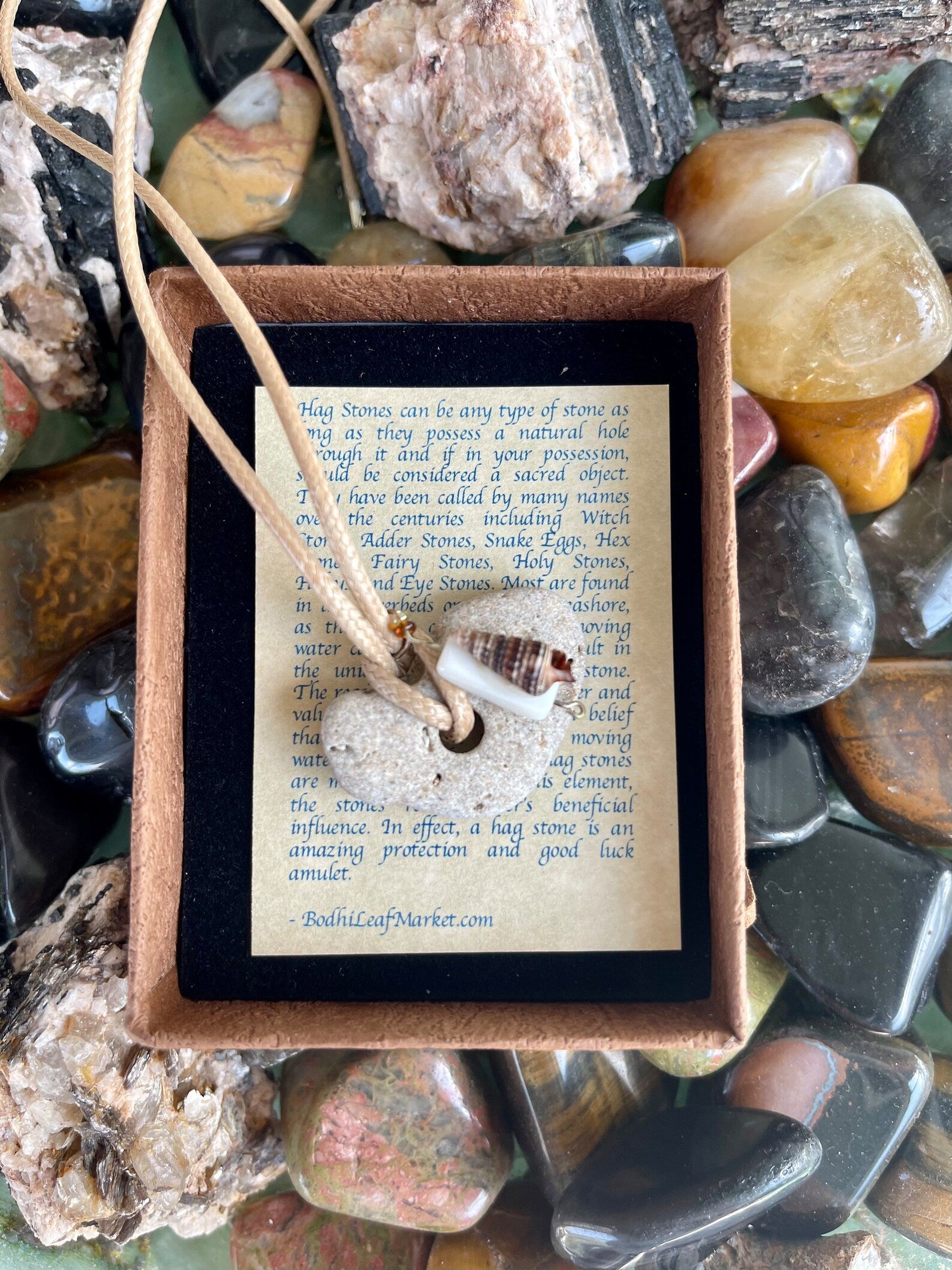This stone measures approx 1/2" across and the necklace measures approx 16" with a 2 inch chain extender. You will receive the exact stone and seashell charm in this picture. This will be gift boxed with a brief description of the magical properties of the hagstone.