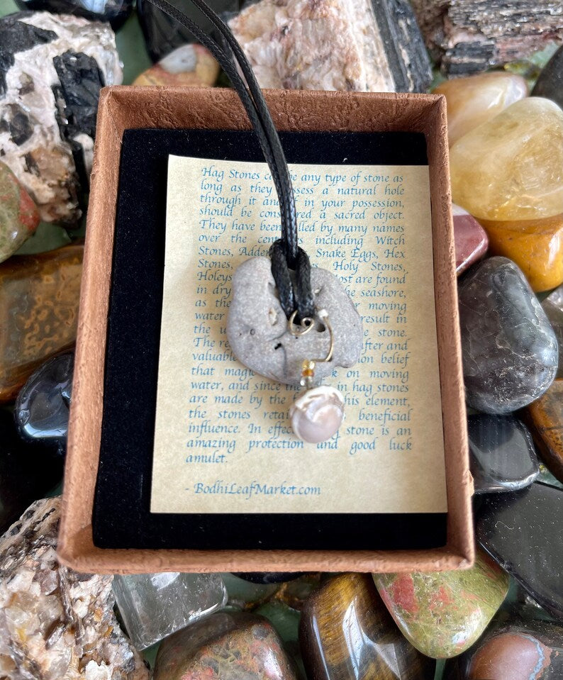 Hag Stones can be any type of stone as long as they possess a natural hole through it and if in your possession, should be considered a sacred object. They have been called by many names over the centuries including Witch Stones, Adder Stones, Snake Eggs, Hex Stones, Fairy Stones, Holy Stones, Holeys, and Eye Stones. Most are found in dry riverbeds or along the seashore, as the action of running or moving water causes the erosion that result in the unique appearance of the stone.